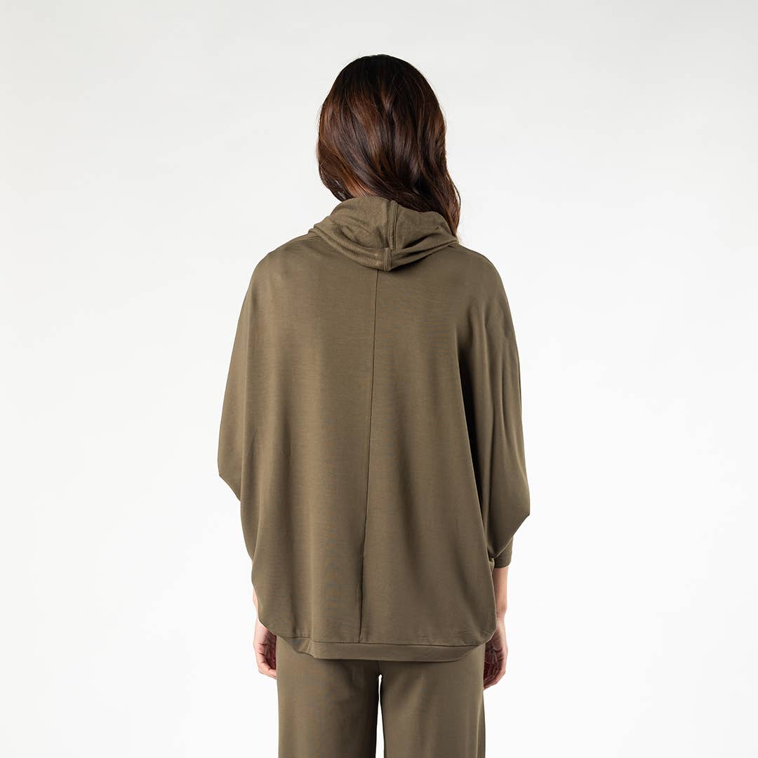 - Soft, breathable bamboo relaxed top layer with pockets and draped hood