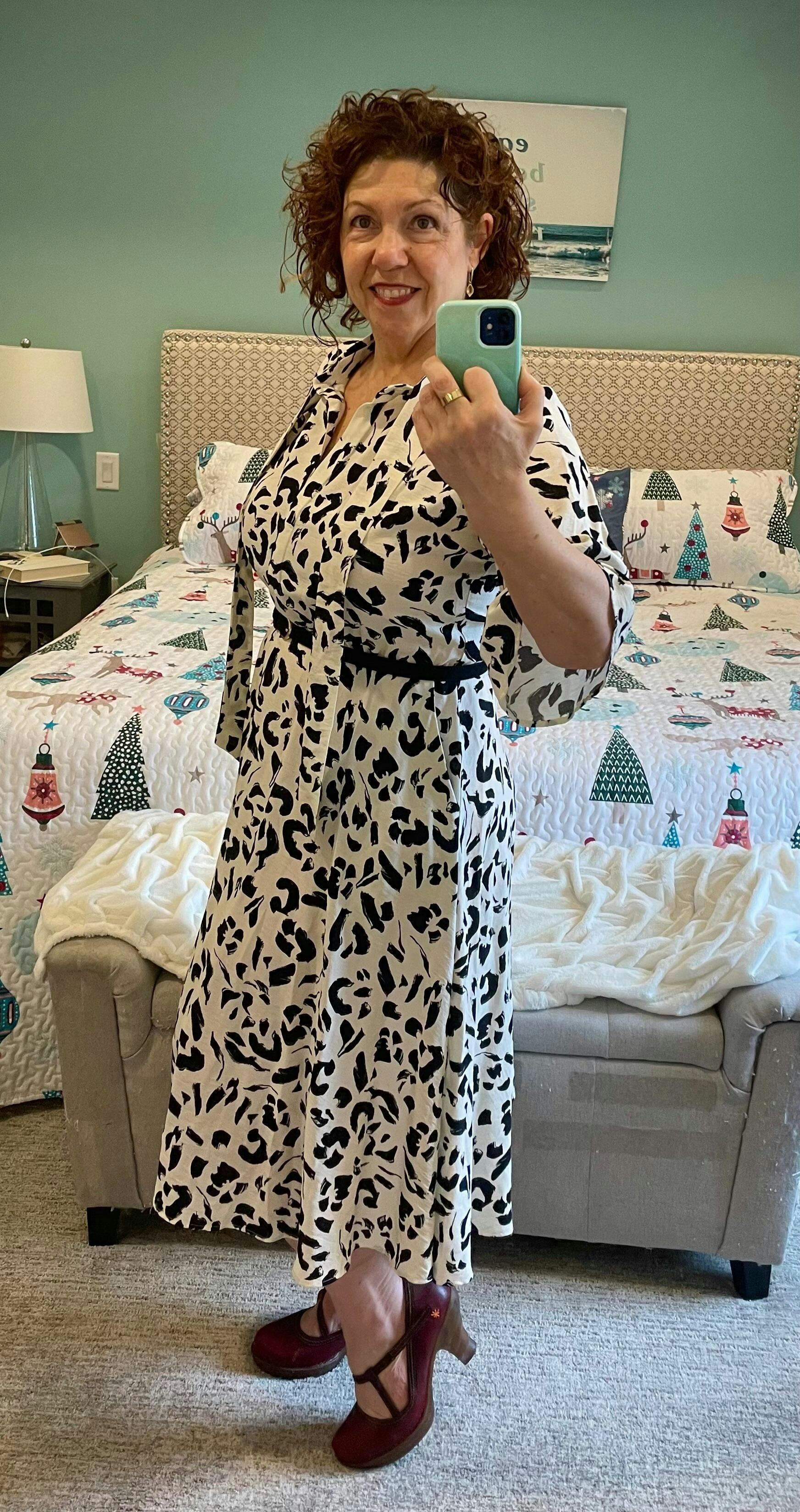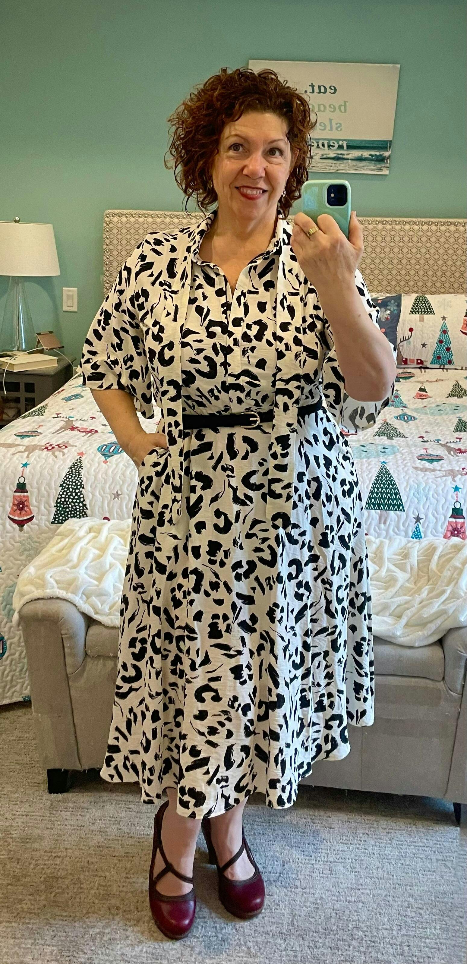 The Bianca Dress is equal parts playful and polished, with just the right hint of retro. Featuring a stylized black and ecru leopard print, this short-sleeved stunner has an easy zip-front, a flattering elastic waist, and a feminine pussy bow neckline for a touch of charm. The elbow-length trumpet sleeves add a soft, flared finish that feels both elegant and easy. Bonus- it's LIGHT! So if you run hot, this is a great all-season style for you. Fall event? Work? Date night? You're covered in light, couture comfort.