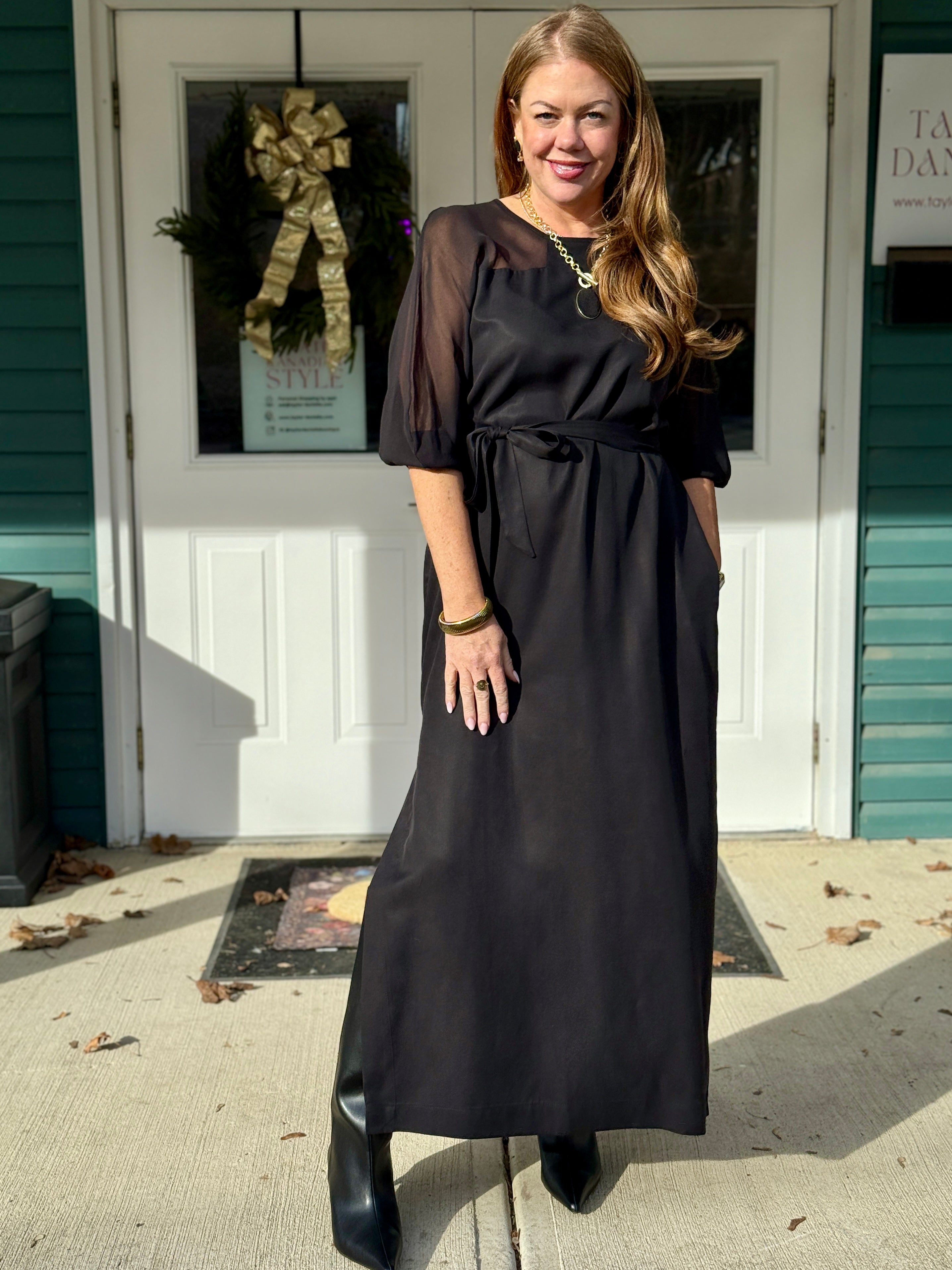 • Maxi length dress with sheer sleeves, pockets and a removable belt, button keyhole closure in back