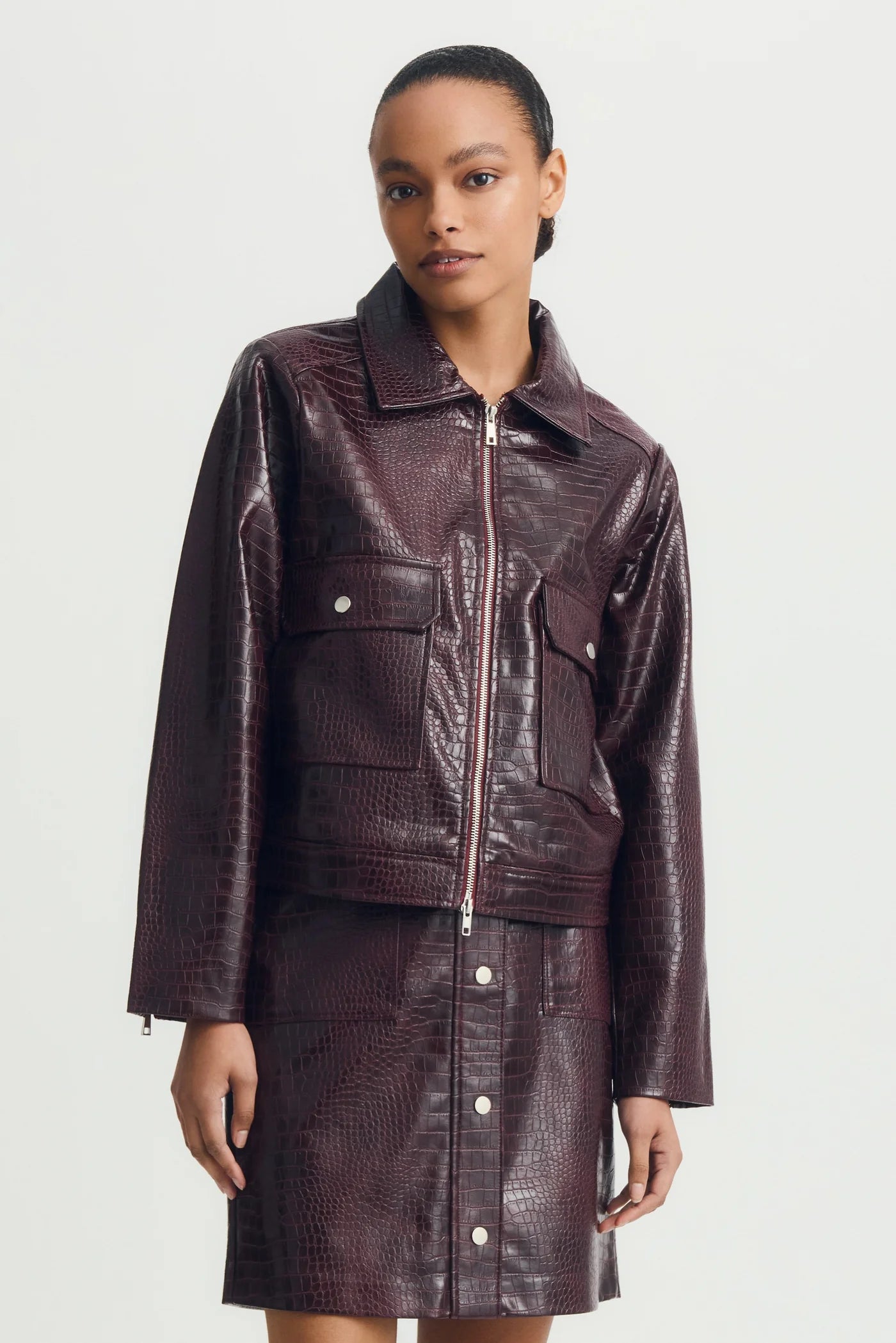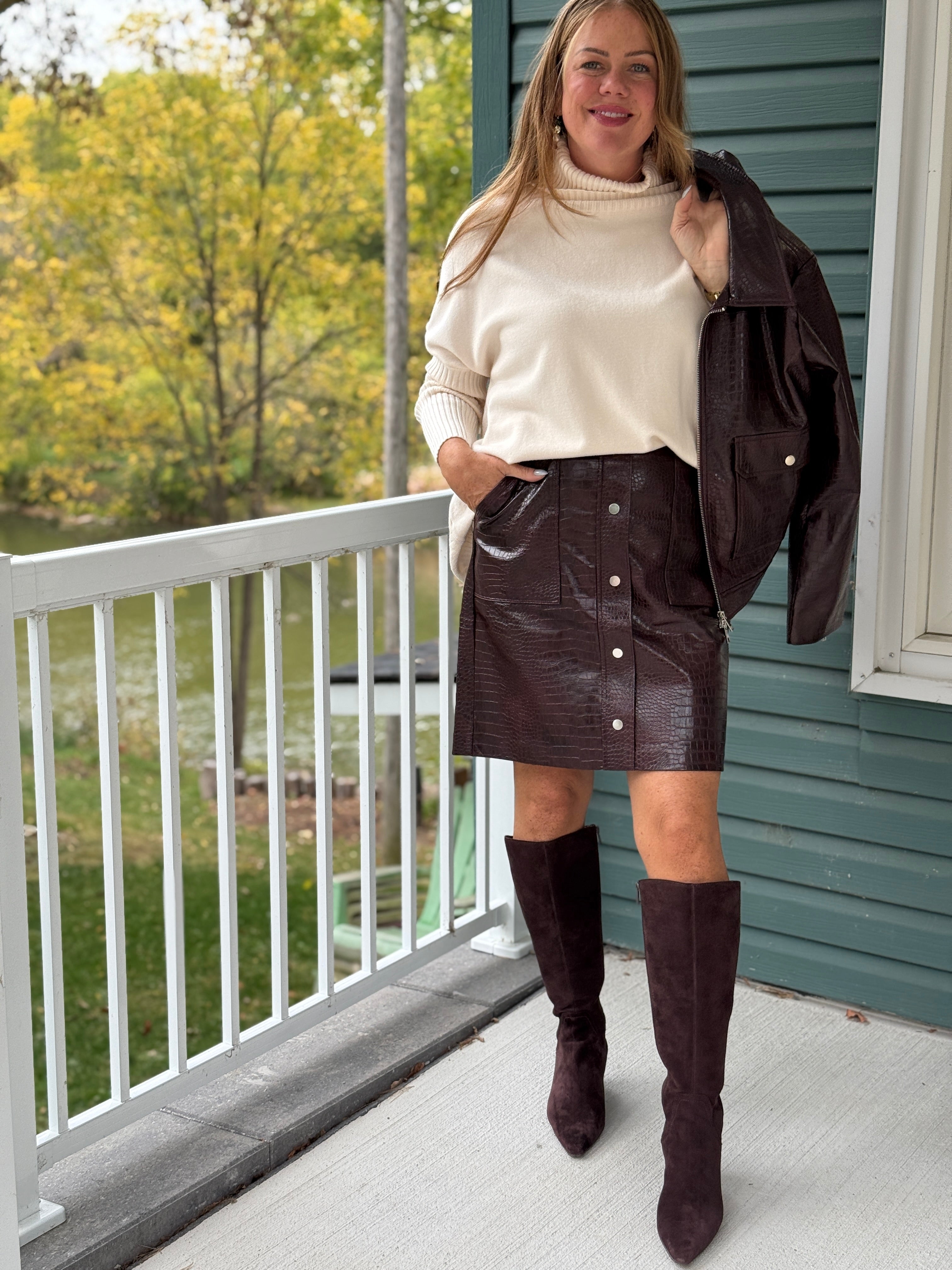 The Russi Skirt by Melissa Nepton is where vintage cool meets modern confidence. This burgundy faux alligator mini (just above the knee) channels a little 60’s sass—with a 2025 twist. The glossy texture catches the light just right, while the faux silver snaps and trouser pockets keep it grounded in effortless chic. A side zipper and stretch elastic back panel mean comfort without compromise. Pair it with the matching jacket for power moves, a cream sweater for classic polish, or toss on a sweatshirt for that off-duty edge that still turns heads. It’s retro. It’s refined. It’s the kind of skirt that makes every sidewalk feel like a runway.