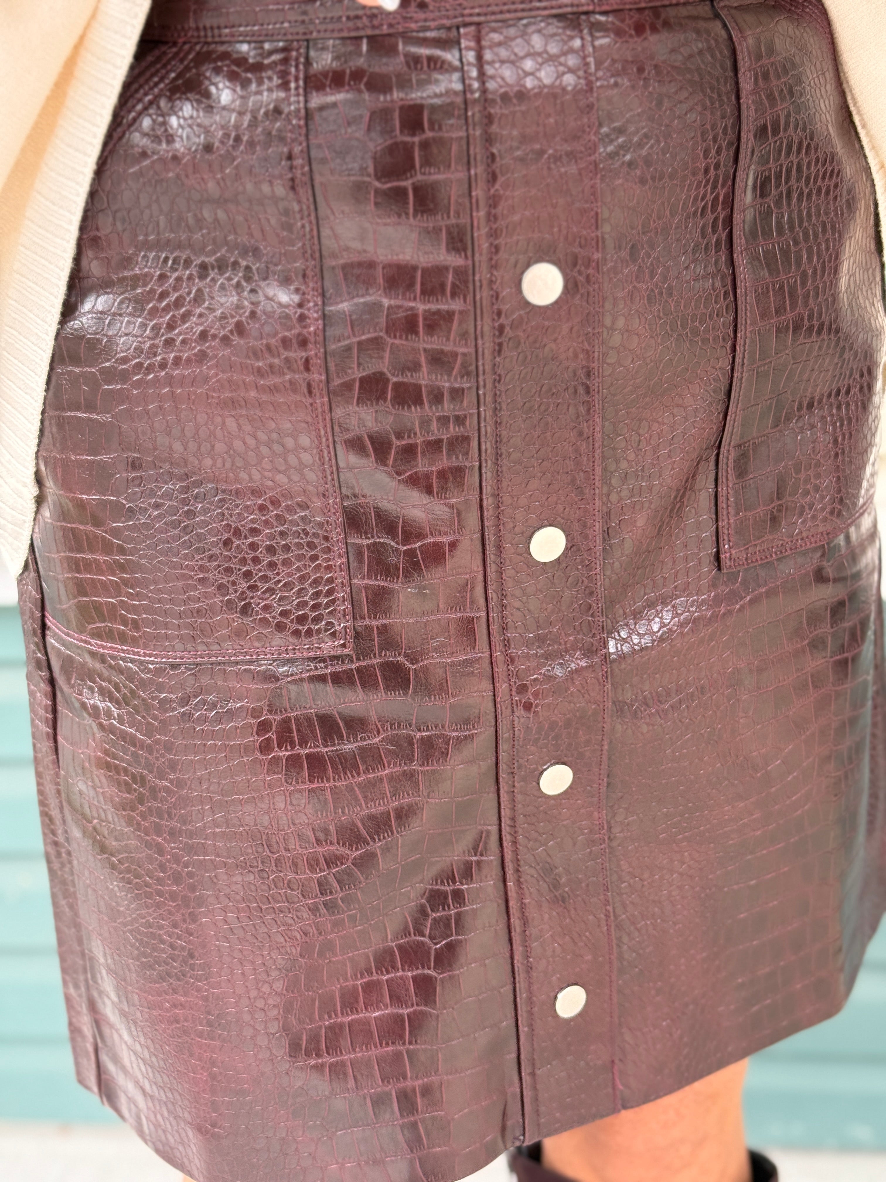 - Burgundy faux alligator skirt with faux silver snap buttons, trouser pockets and side zipper, with stretch elastic panel in back