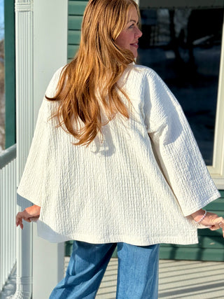 It is generous in size, but a simple tuck gives it shape and a more fitted look. Or wear open or long for a cozy vibe.