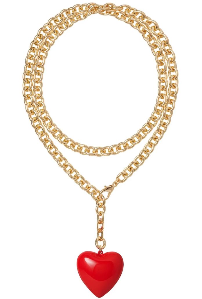Amour is an extra long over sized Rolo Chain that can be worn wrapped or as a Lariat. The 1.5" Full enamel Heart makes a playful statement. 22" length Open Chain. Lobster claw at the end of the chain 18K antique gold chain Steel Chain Enamel Lead Free Nickel Free Hypoallergenic Waterproof