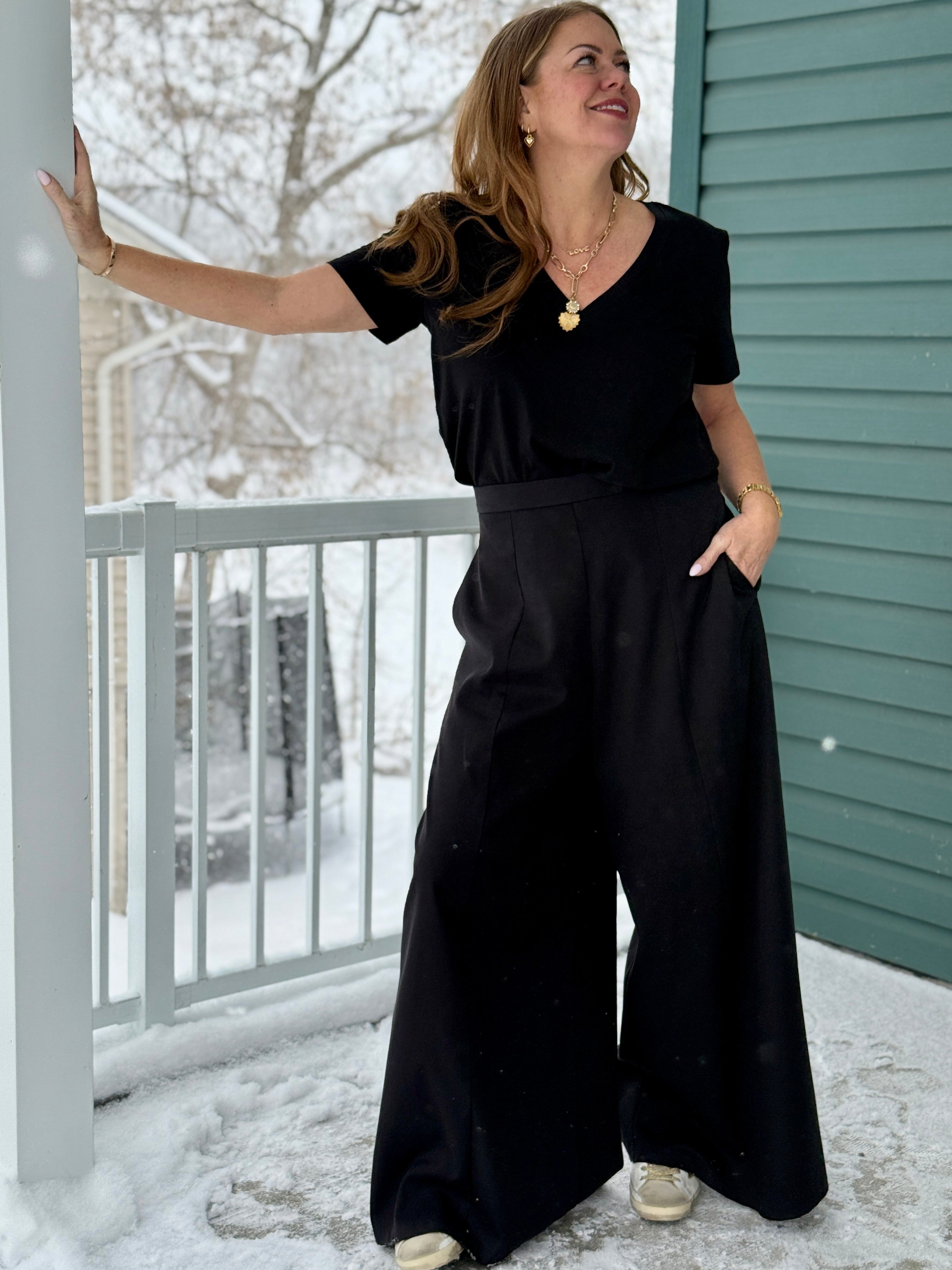 Meet the LaLune Panel Pant — designed by a talented, female-owned brand out of London, Ontario, and we’re genuinely honoured to be the very first boutique to carry her collection. These are the kind of pants that quietly become your favourite without making a big announcement about it. Made from 100% TENCEL™, they feel cool, soft, and fluid against the skin. The wide-leg panel design is expertly constructed to fall just right, giving you that long, elegant line without ever feeling stiff or fussy. There’s a sleek side zip and button for a clean finish, hidden inseam pockets (because real life requires pockets), and that magical versatility we’re always chasing — polished enough for heels and a blouse, relaxed enough for sneakers and a tee.