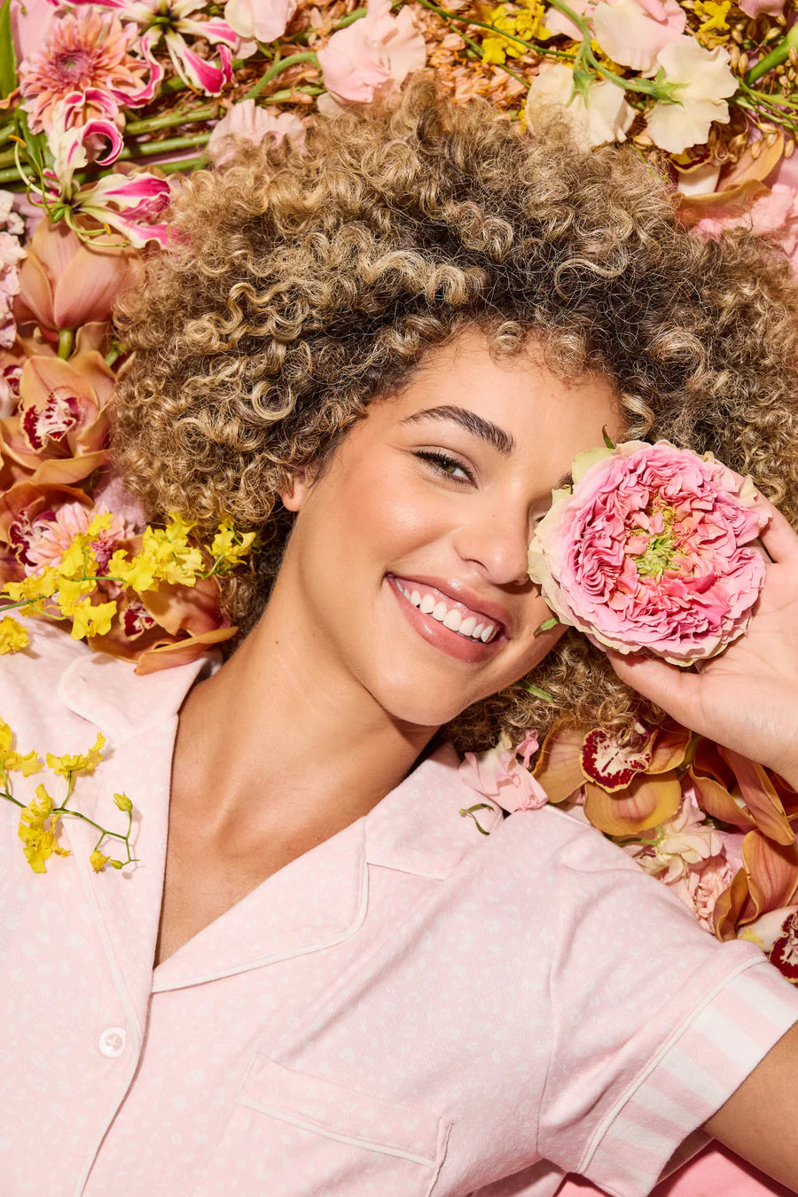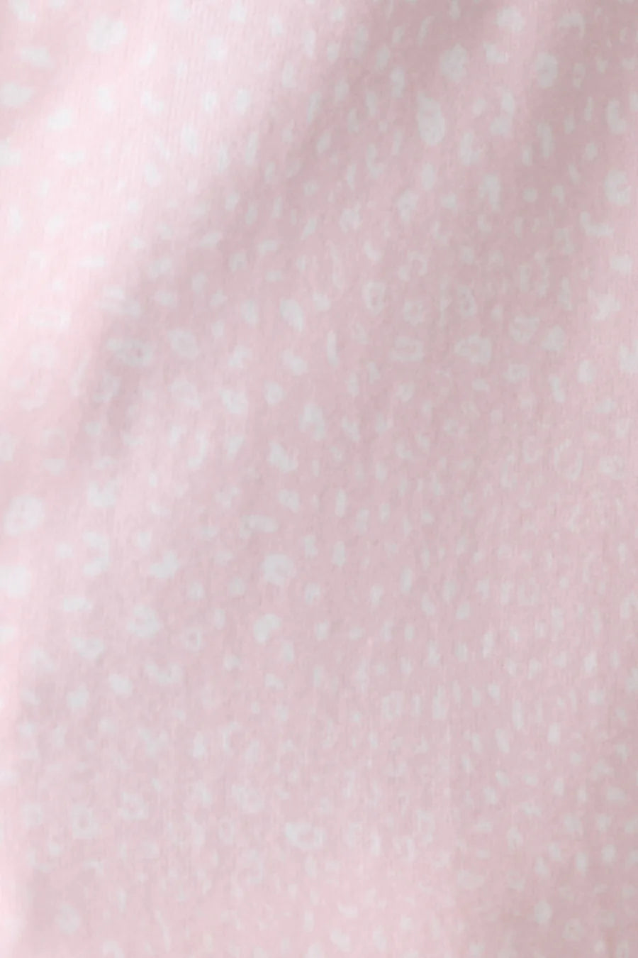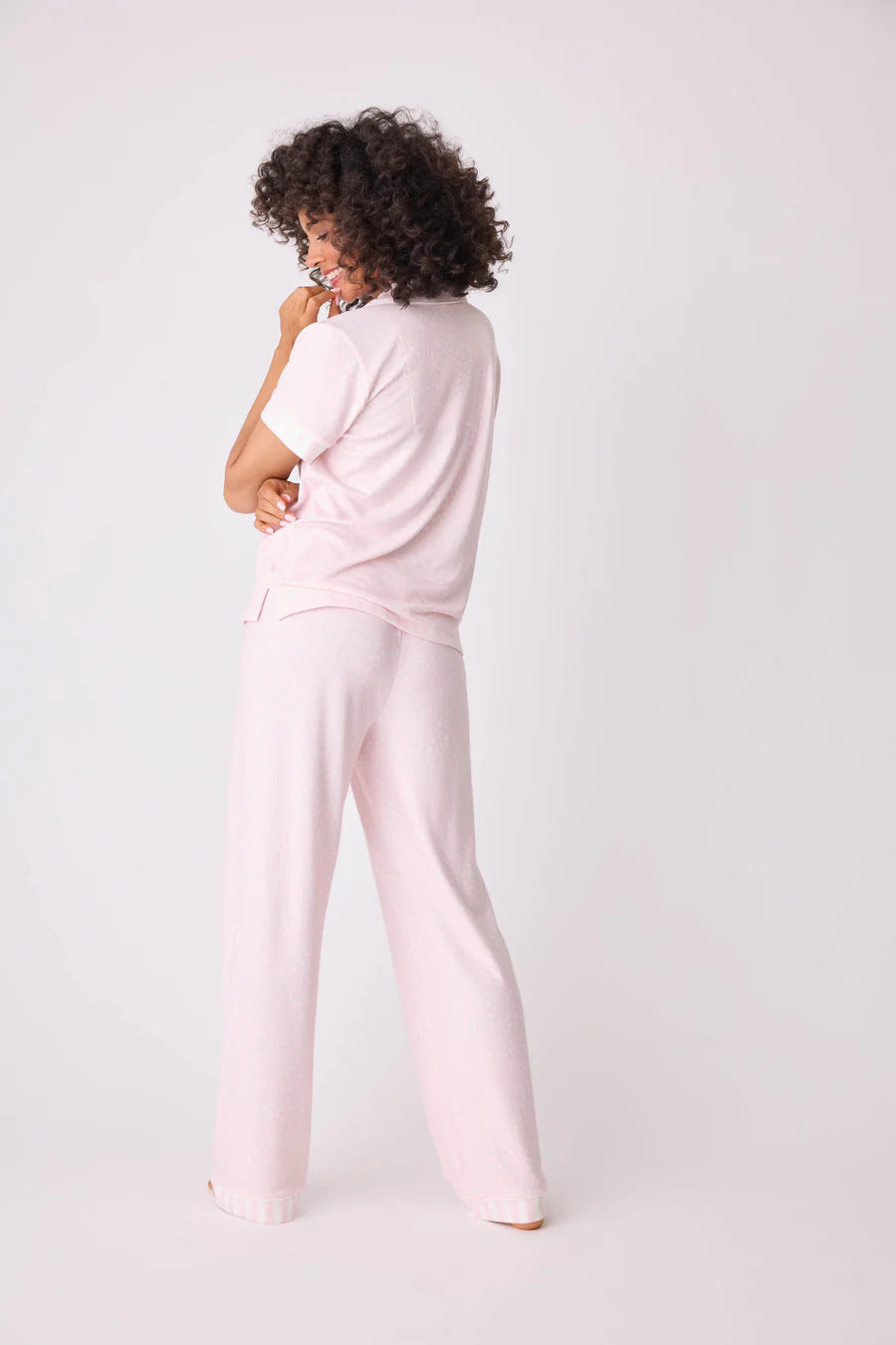 Lounge in style with this playful three-piece pajama set, designed in a light pink and ivory leopard dot print. The short-sleeve button-front top and relaxed open-leg pants feature contrast pink-striped cuffs for a fun, feminine touch. A matching hair wrap completes the look, offering an effortless bedtime ensemble. Created as an exclusive collaboration with Susan G. Komen, this set brings comfort with a cause.