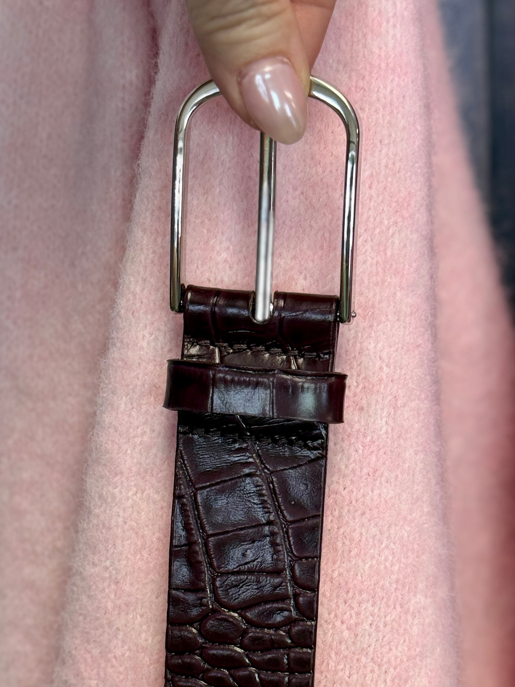 Rich burgundy meets faux croc for a 2026 texture bomb of a belt featuring a sleek silver buckle. It's the perfect way to add one of 2026's key colours to your looks.