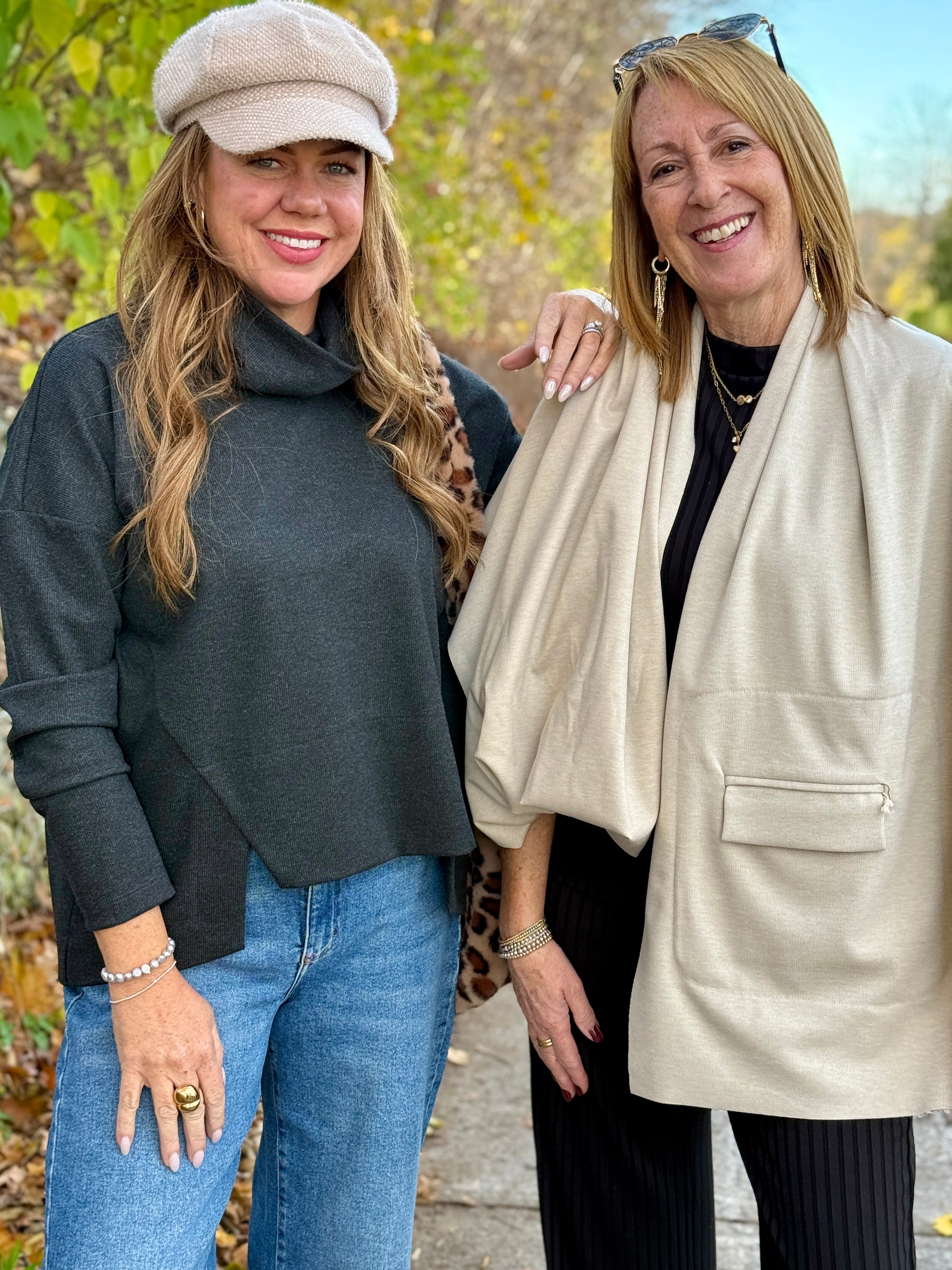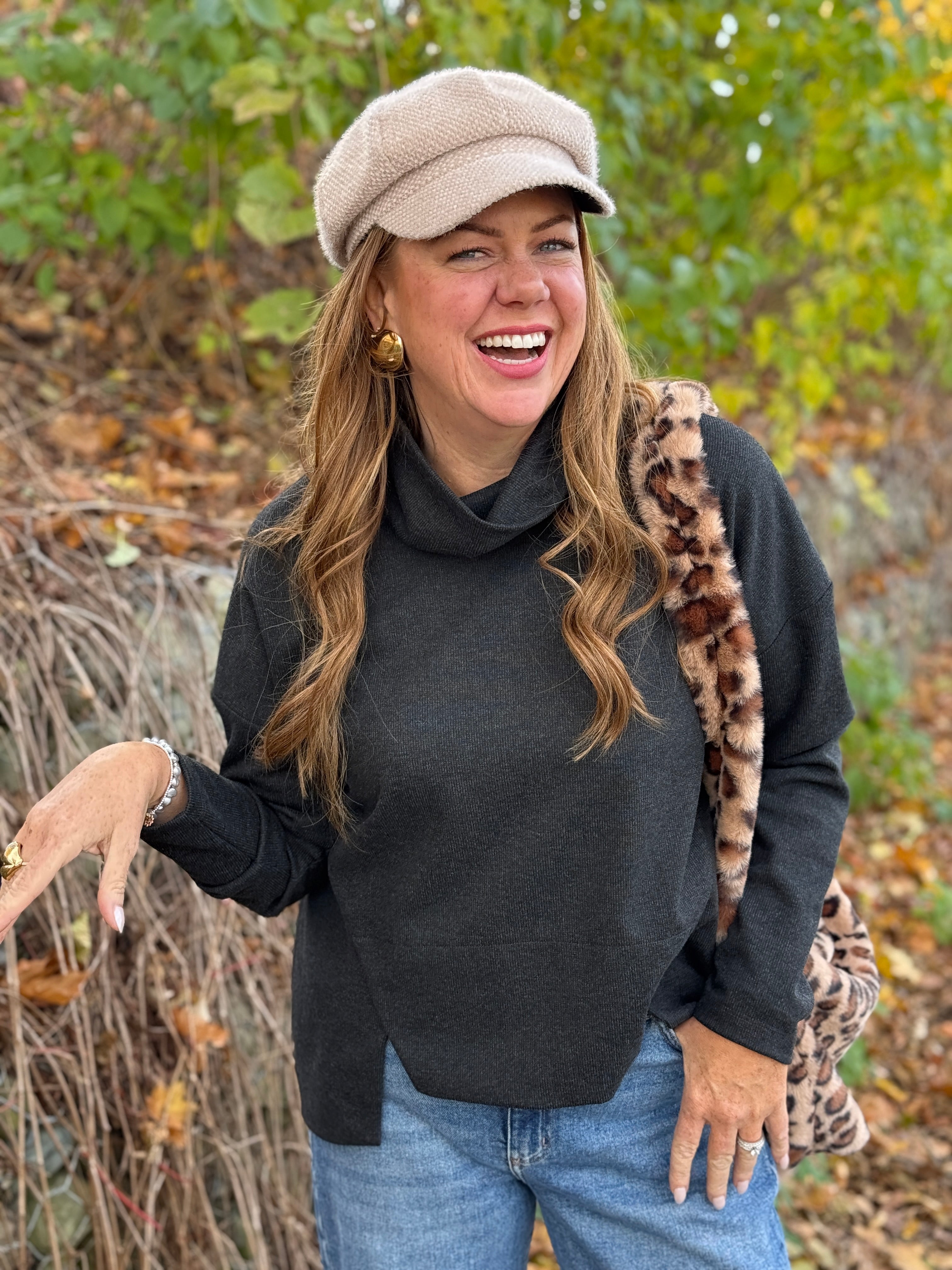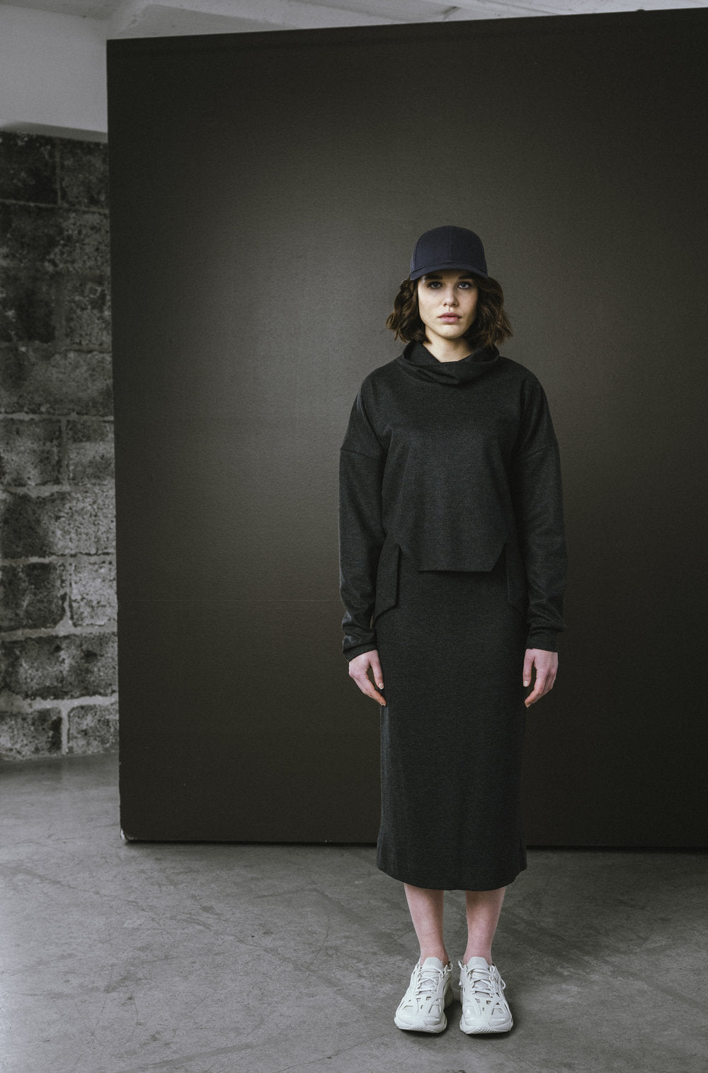 The Balmoral Sweater by Bodybag by Jude is your go-to for easy sophistication. In a soft charcoal grey knit, this relaxed-fitting sweater features a modern funnel neck and subtle cut-out hem details that give it just the right edge. Effortless and cozy, it pairs perfectly with the matching Skye Pant for a sleek coordinated look—or simply with your favourite jeans for relaxed, everyday chic.