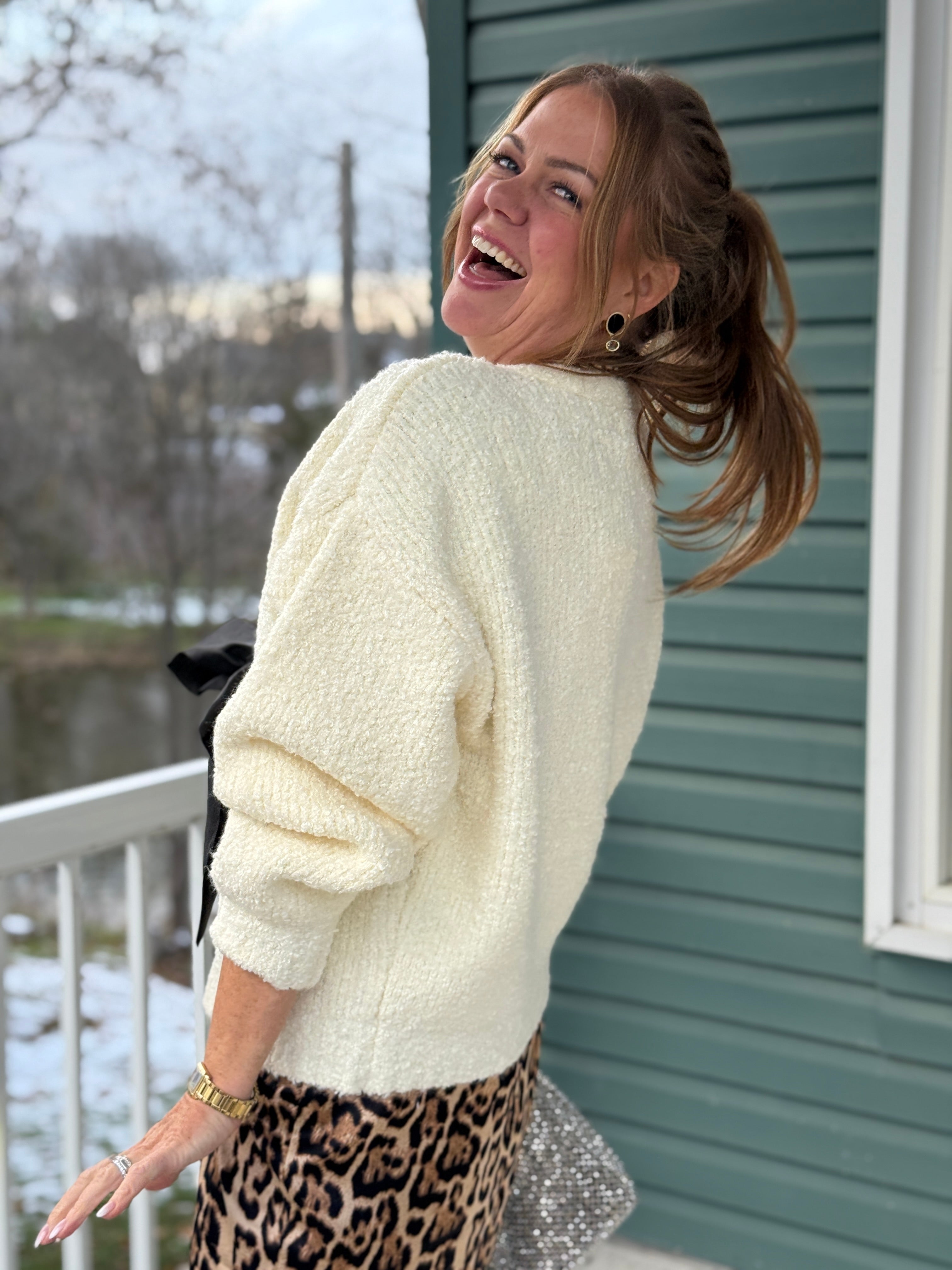 • Soft boucle cardigan with deep v, hook & eye closures and organza bow, can be worn with bow in back or front