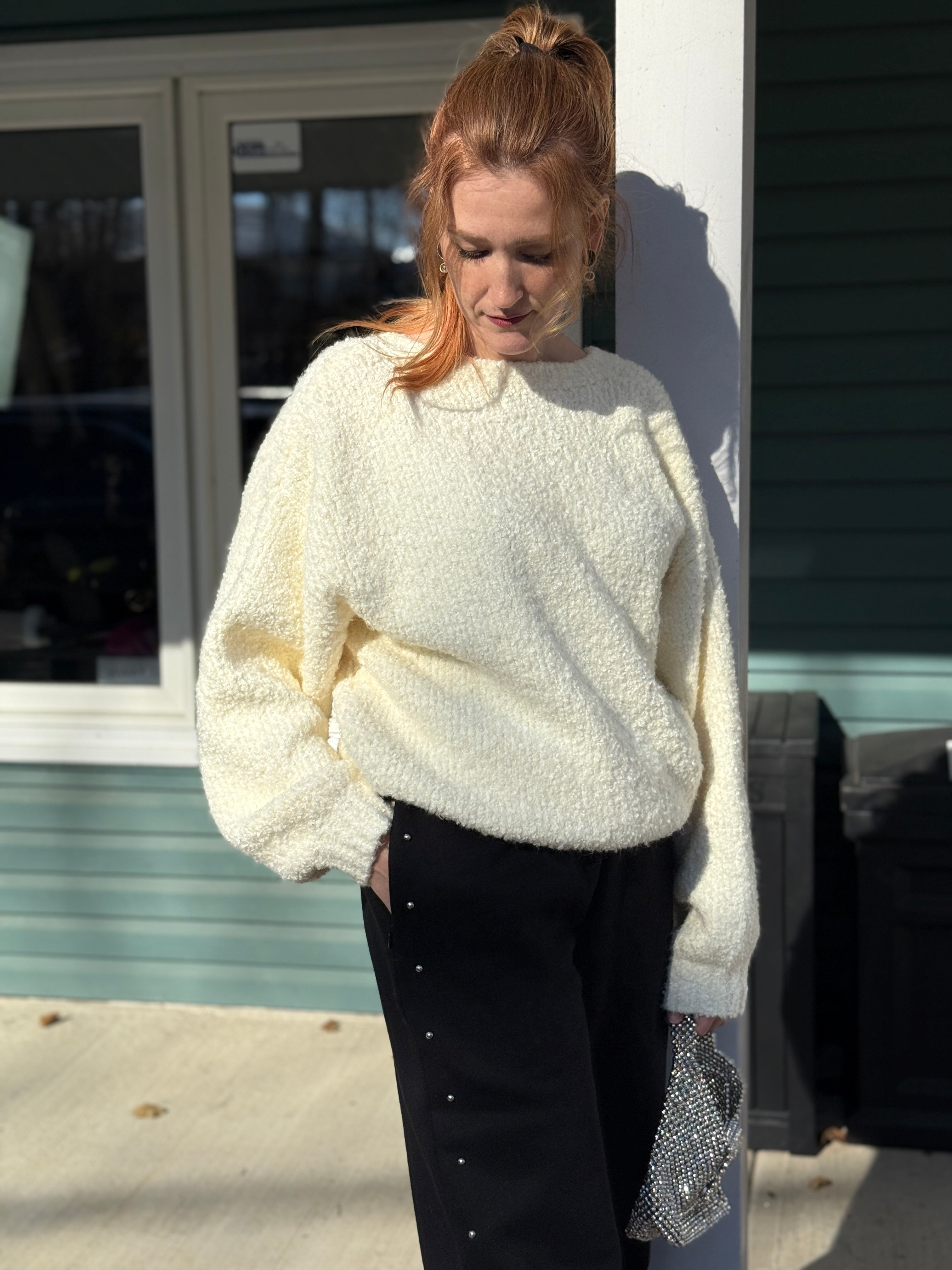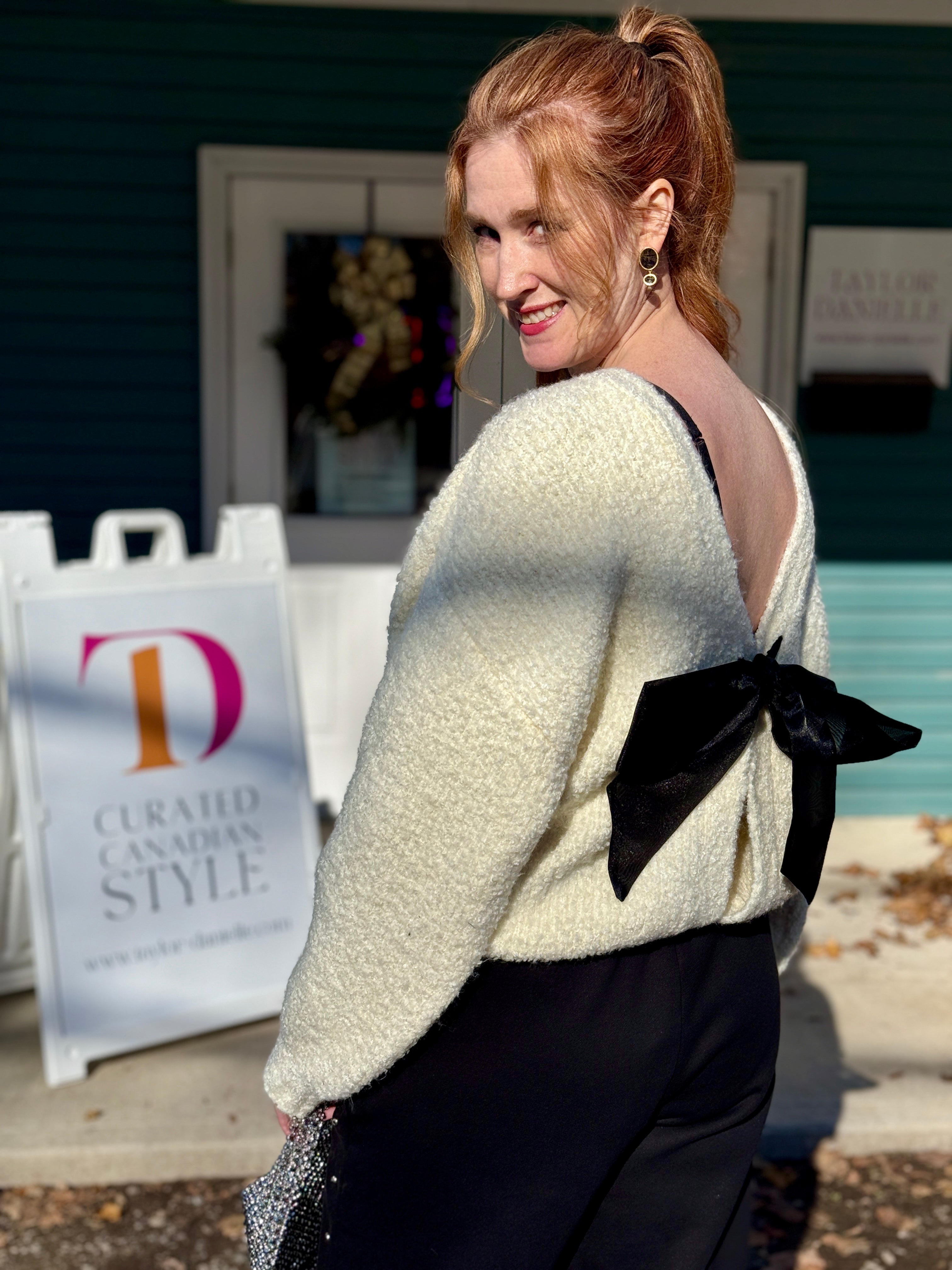 Inspired by Elsa Schiaparelli herself, this cardigan is dramatic, unapologetically glamorous, and just a little bit mischievous — exactly how we like it. Knit from an ultra-soft cream boucle with a whisper of wool for cozy warmth, it brings that cloud-like feel you’ll want to live in. The bubble silhouette, deep V neckline, and hook-and-eye closures give her a sculptural, modern edge, while the Schiaparelli-inspired piecing adds a wink of couture. And yes — the organza bow keeps its shape whether you swing it to the back or let it steal the spotlight in the front. Light, luxe, and layer-friendly — Elsa is here for your winter main-character moment.