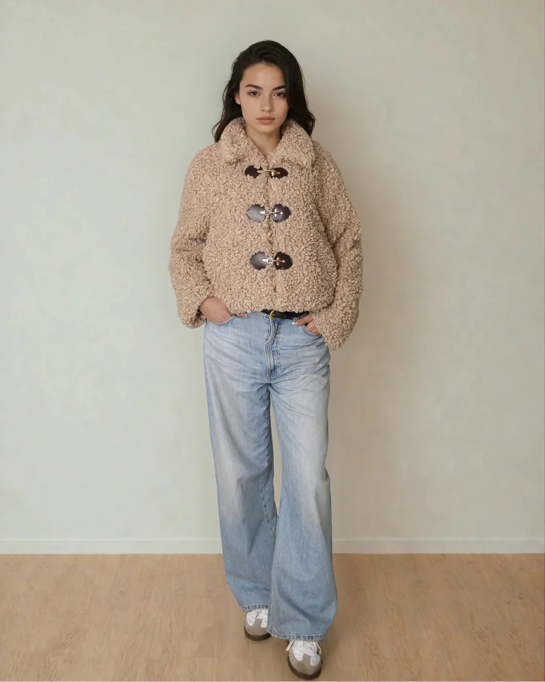 - Collared, waist-length faux teddy jacket with gold toggle hardware