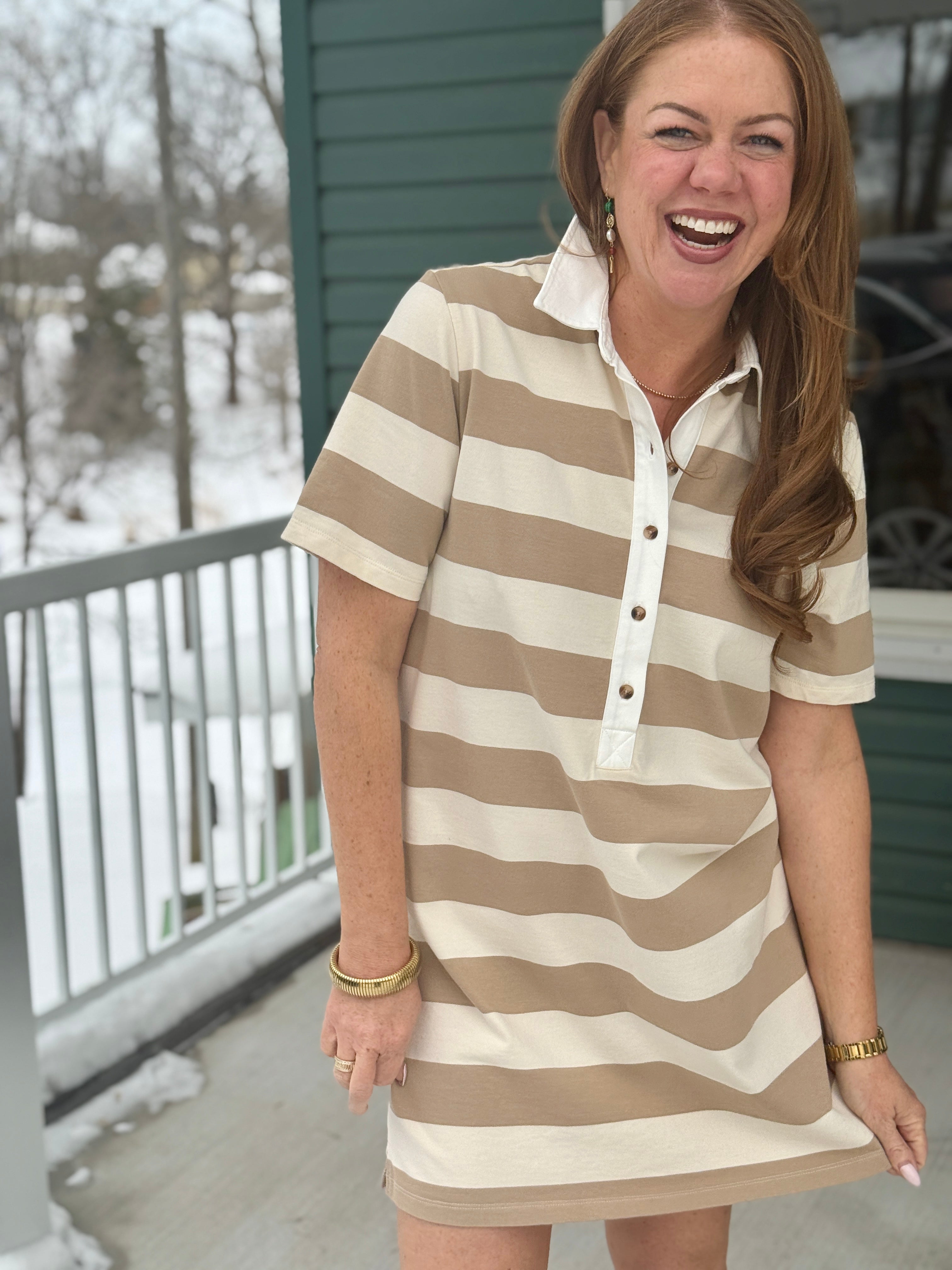 Meet your new throw-on-and-look-amazing piece: the Gentle Fawn Colbie Rugby Dress. Sporty meets polished in a way that feels effortless, not try-hard. Made from soft cotton jersey with classic rugby stripes, this mini dress gives you that borrowed-from-the-boys vibe, refined just enough to feel pulled together. The contrast collar and half-placket button detail nod to timeless rugby style, while the relaxed fit and side slits keep it comfy, flattering, and easy to move in. Perfect with sneakers for daytime errands or boots and a trench when you want casual chic with confidence.