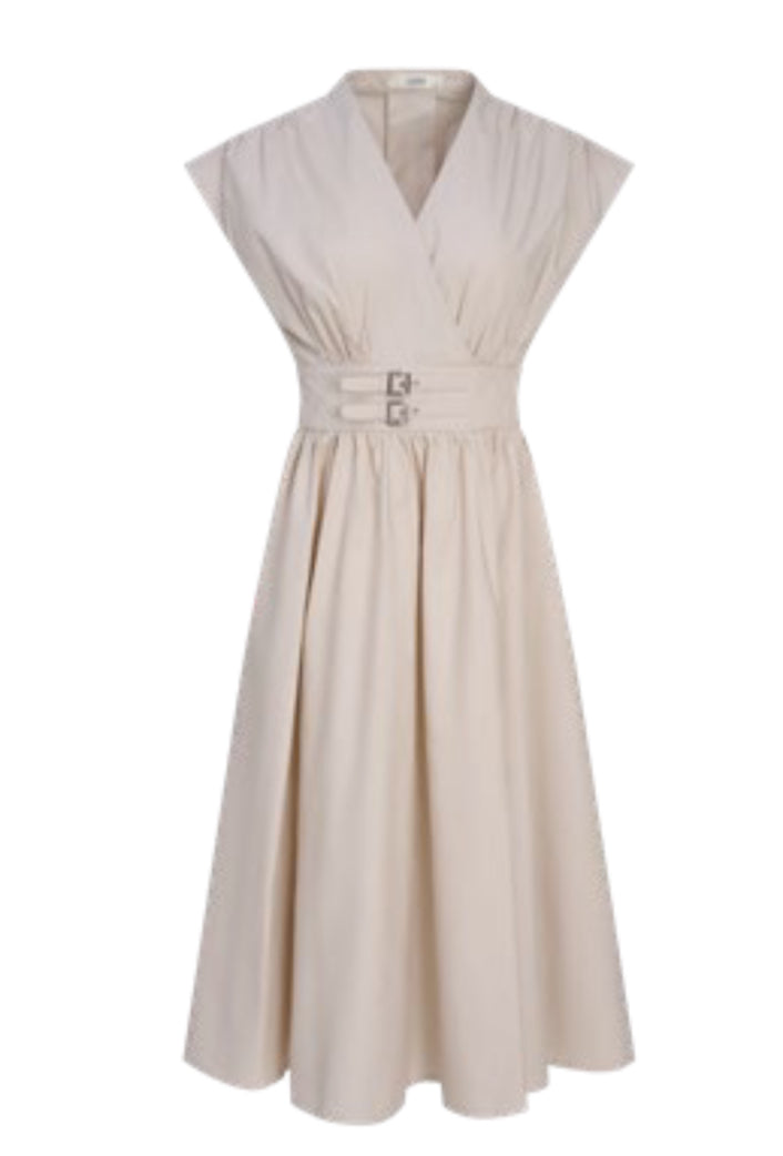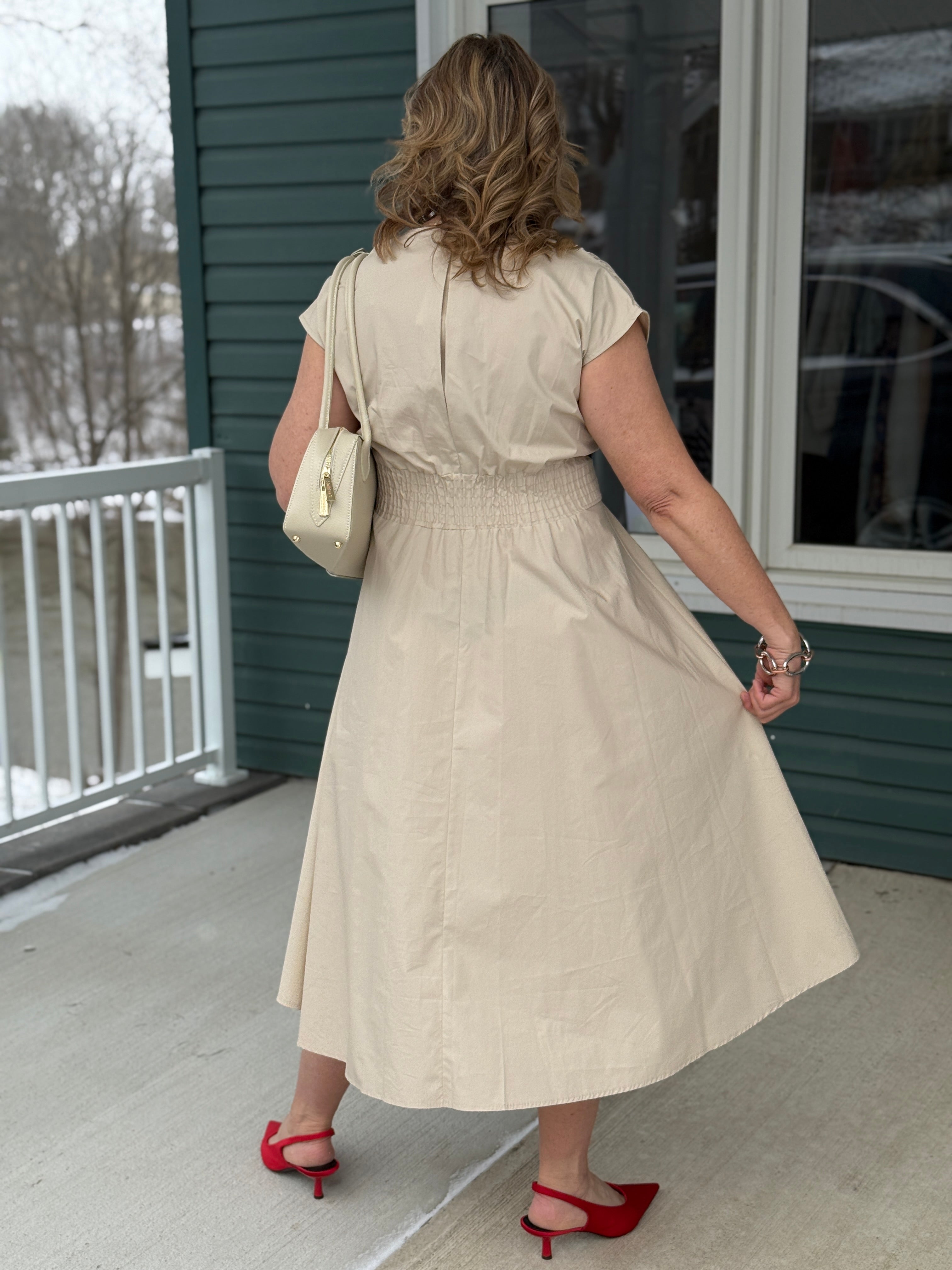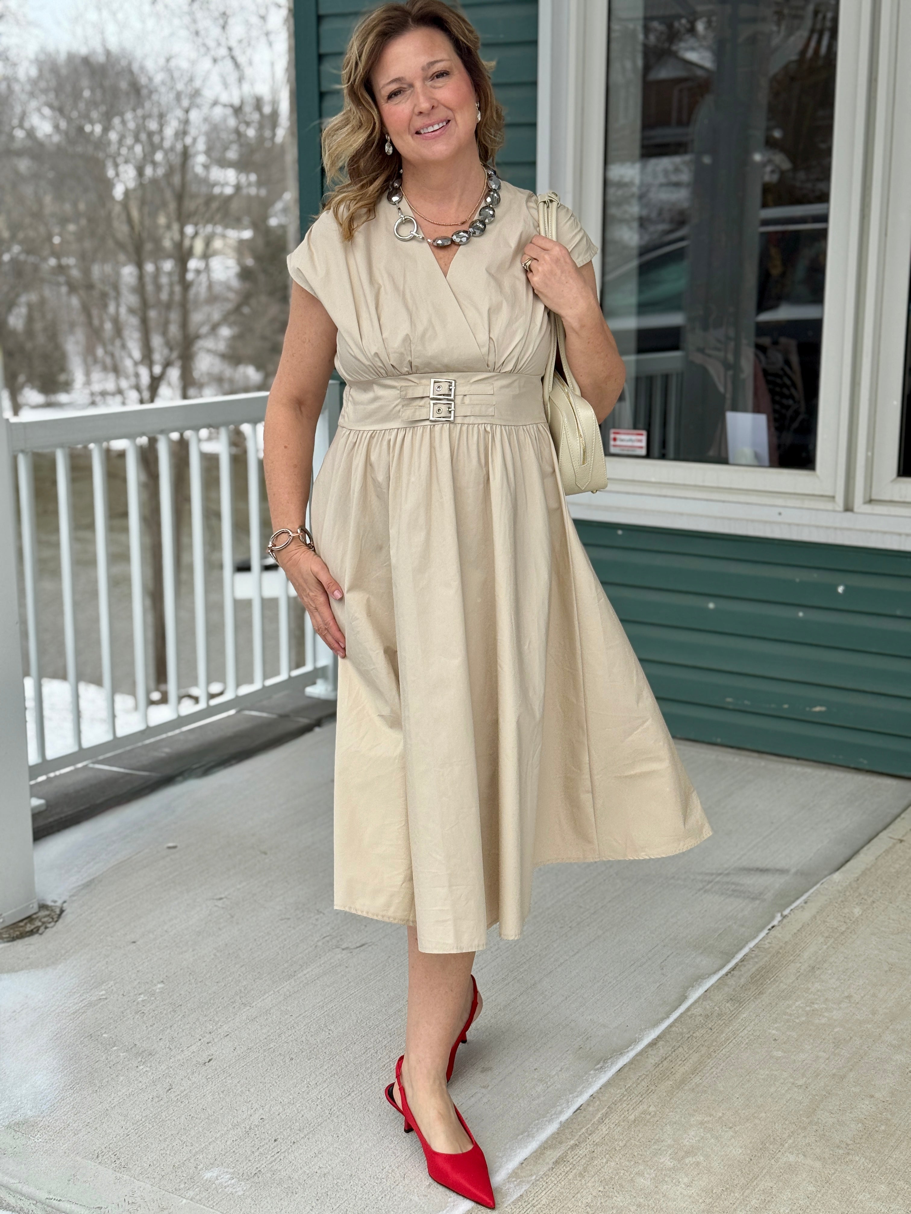 Effortless elegance, anytime, anywhere. The Silvie Dress by Astrid comes in a soft sand hue and offers a perfectly balanced silhouette. With short sleeves, a pullover design, and an elastic waist, it’s comfortable and flattering, while the silver buckle front detail adds a subtle touch of sophistication. The A-line skirt flows beautifully, making it ideal for everything from casual days to dressed-up evenings. A versatile, timeless piece—and a steal you’ll want to wear often, every season.