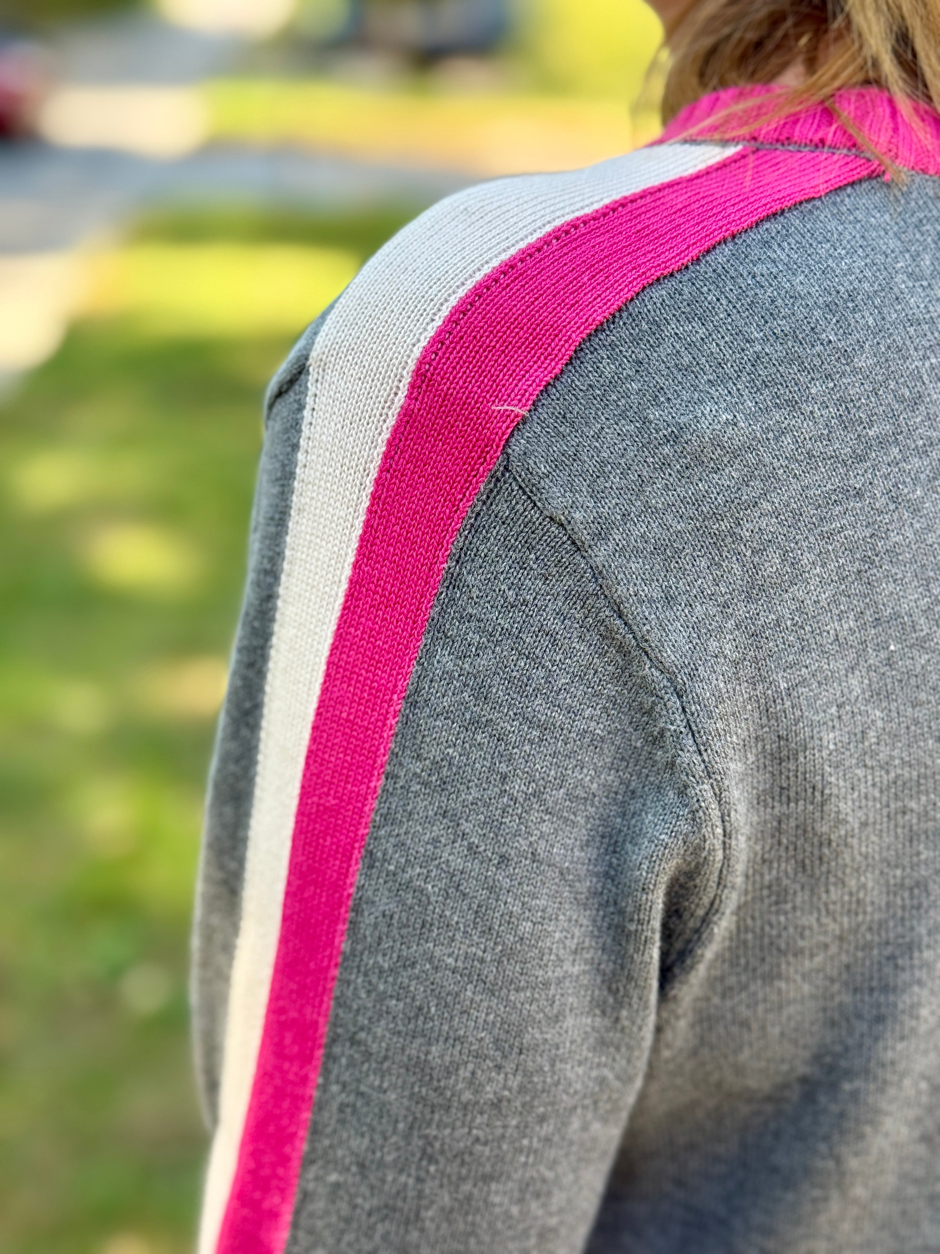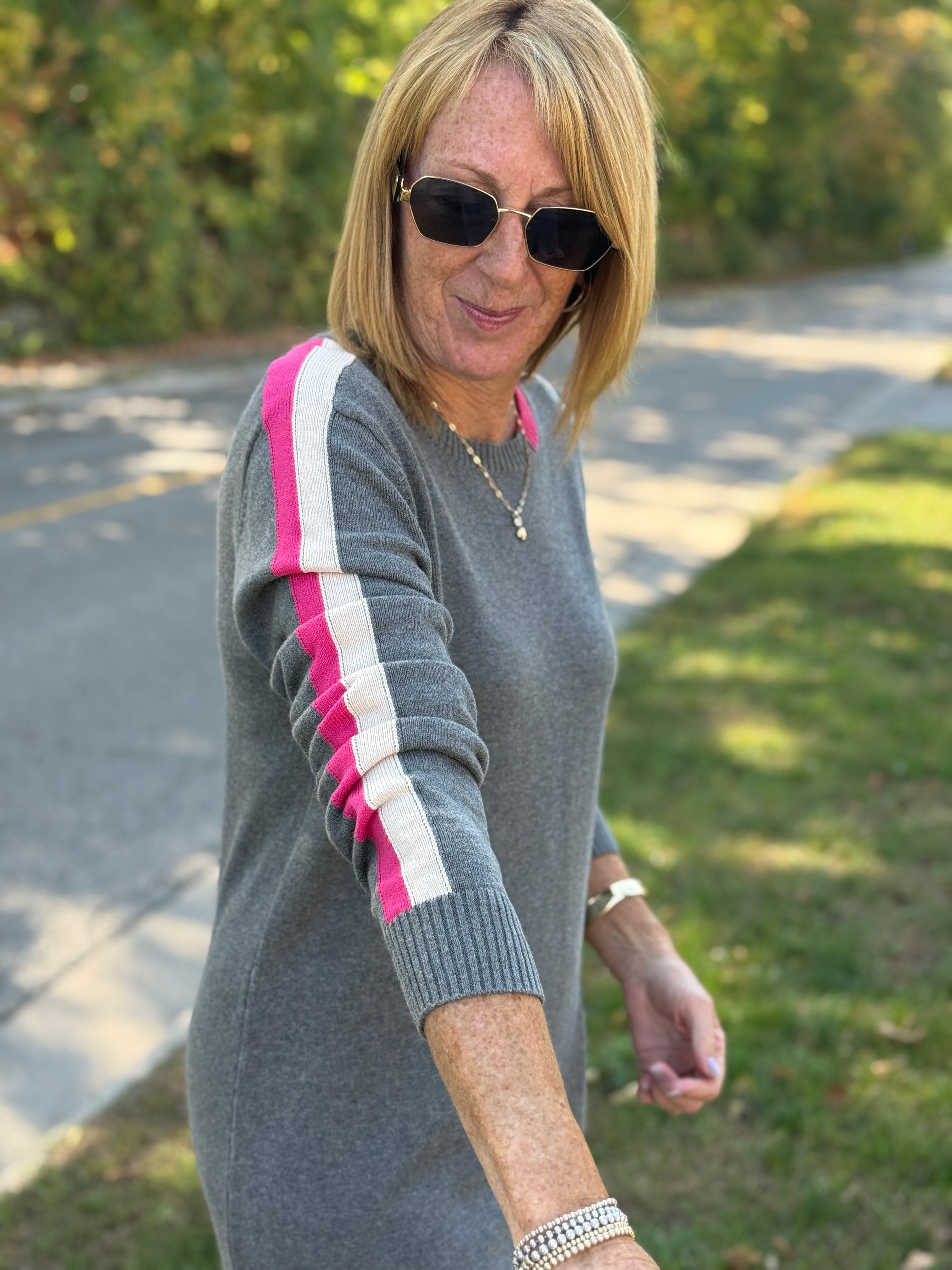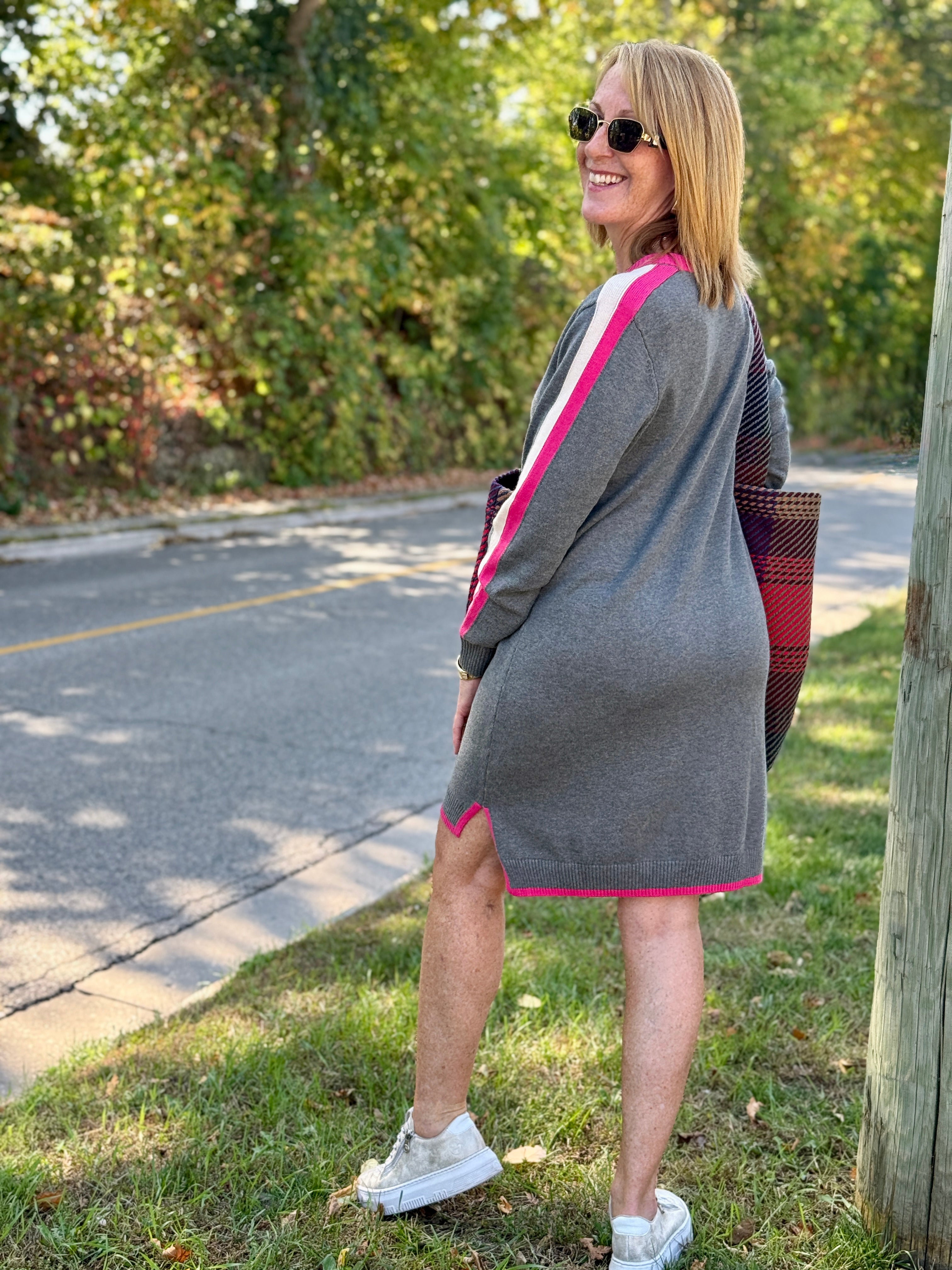 The Hatley Sweater Dress is effortless fall style in one cozy, flattering package. Light and soft, it drapes beautifully with a classic crew neck and a side slit on the high/low hem for just the right amount of movement. Rendered in charcoal with playful hot pink and cream trim, it’s the kind of dress that feels elevated whether you pair it with boots or sneakers - part sporty, part chic. Jewel tones meet a pop of fun, making it your go-to for instant fall chic—perfect for work, weekend strolls, or anything in between.