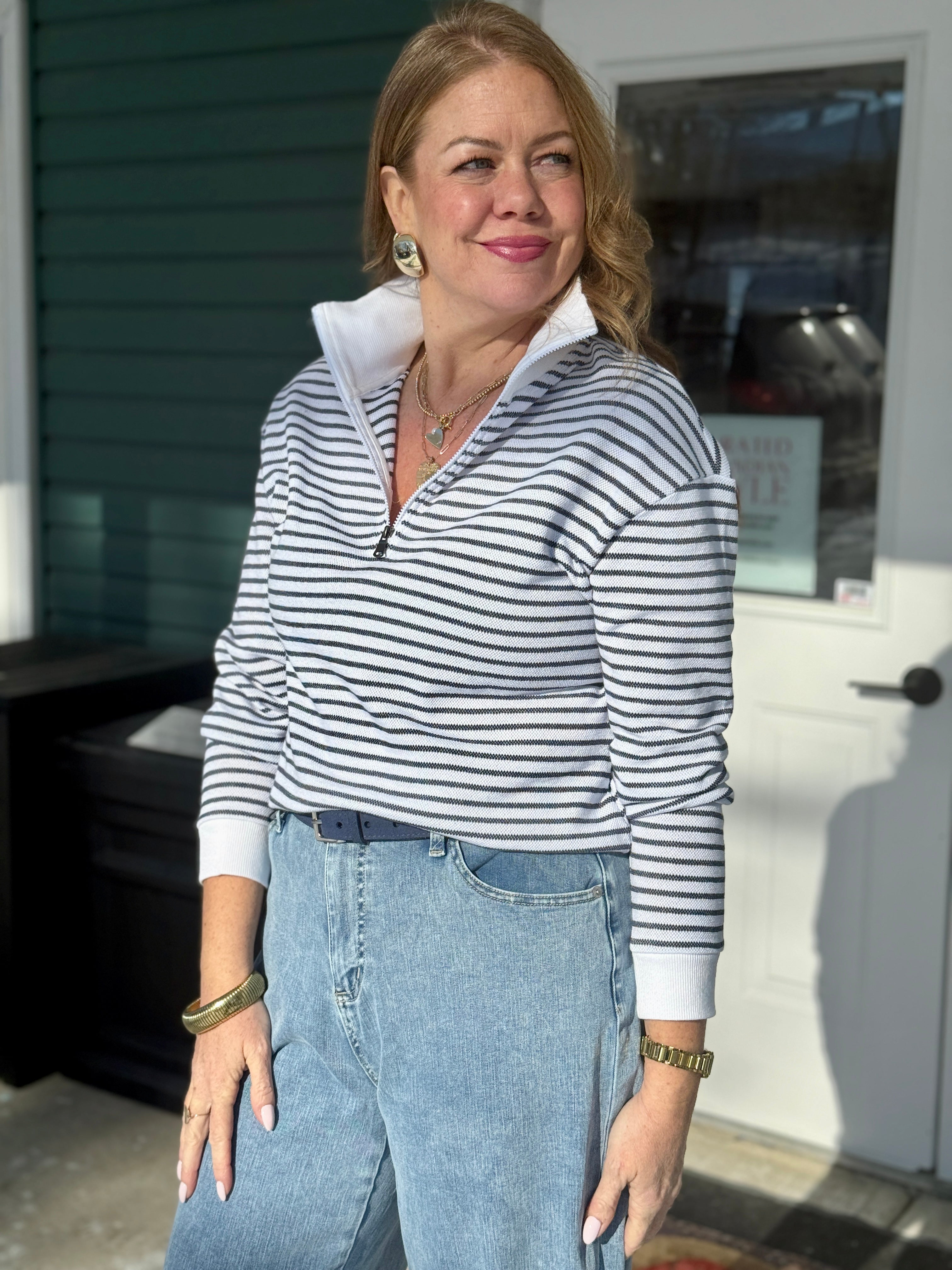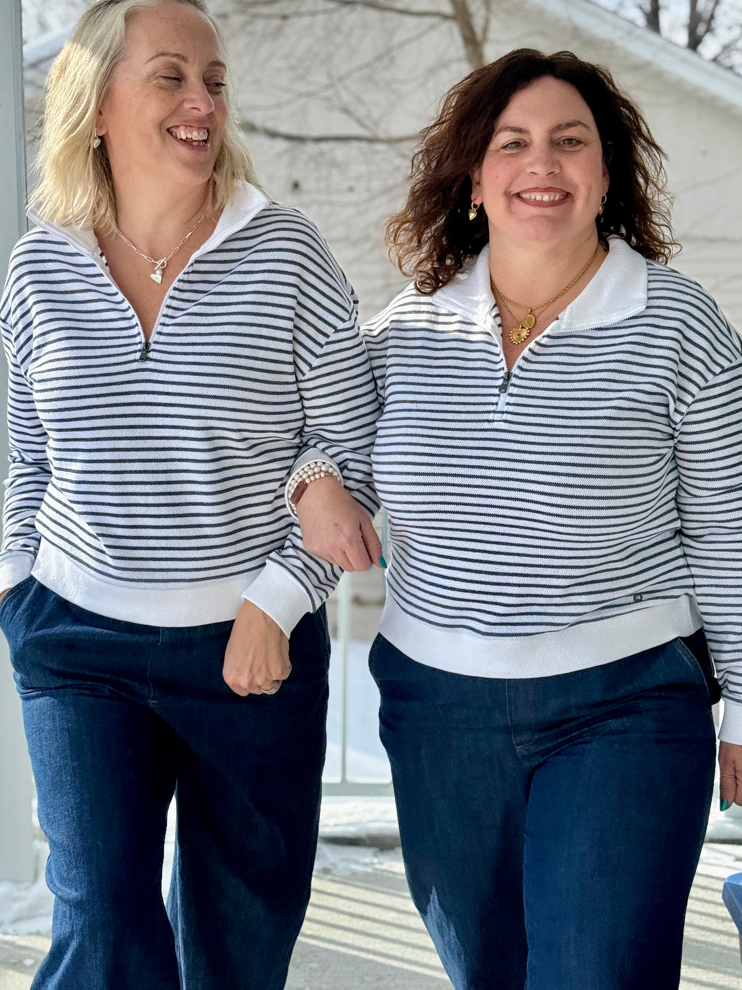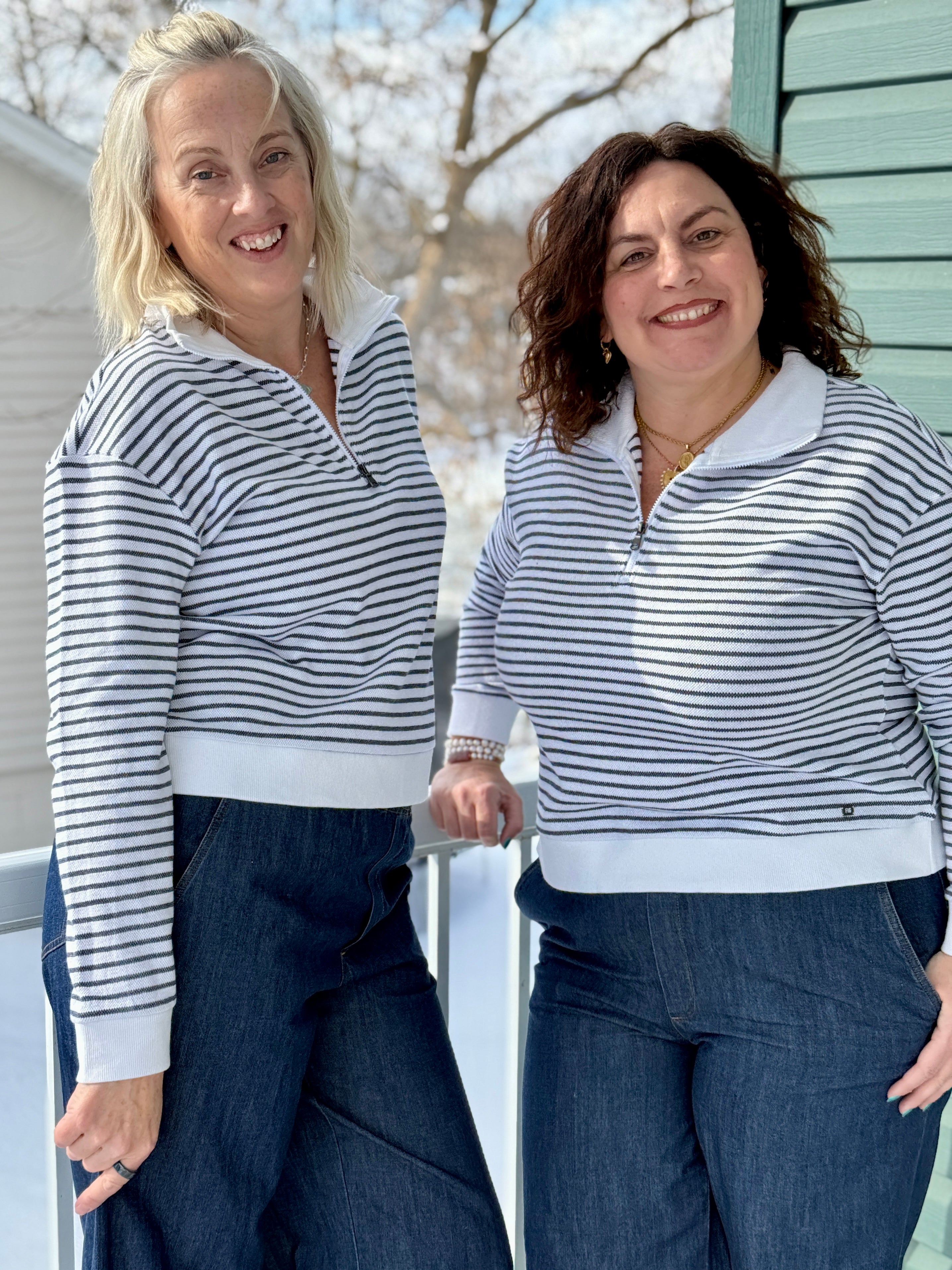 This modern 2026 take on the classic half zip comes in timeless navy and white sail stripe, featuring a cool spread collar, a sleek silver zipper, and the perfect hip-length cut that flatters without trying too hard. It’s polished enough for brunch, comfy enough for couch, and somehow manages to do both. The fabric includes built-in SPF 50, making it your go-to layer for spring days, summer nights, and every “just in case it gets chilly” moment. Wear it now with jeans and sneakers, then keep it on rotation all summer long — because timeless stripes, a great fit, and sun protection never go out of style.