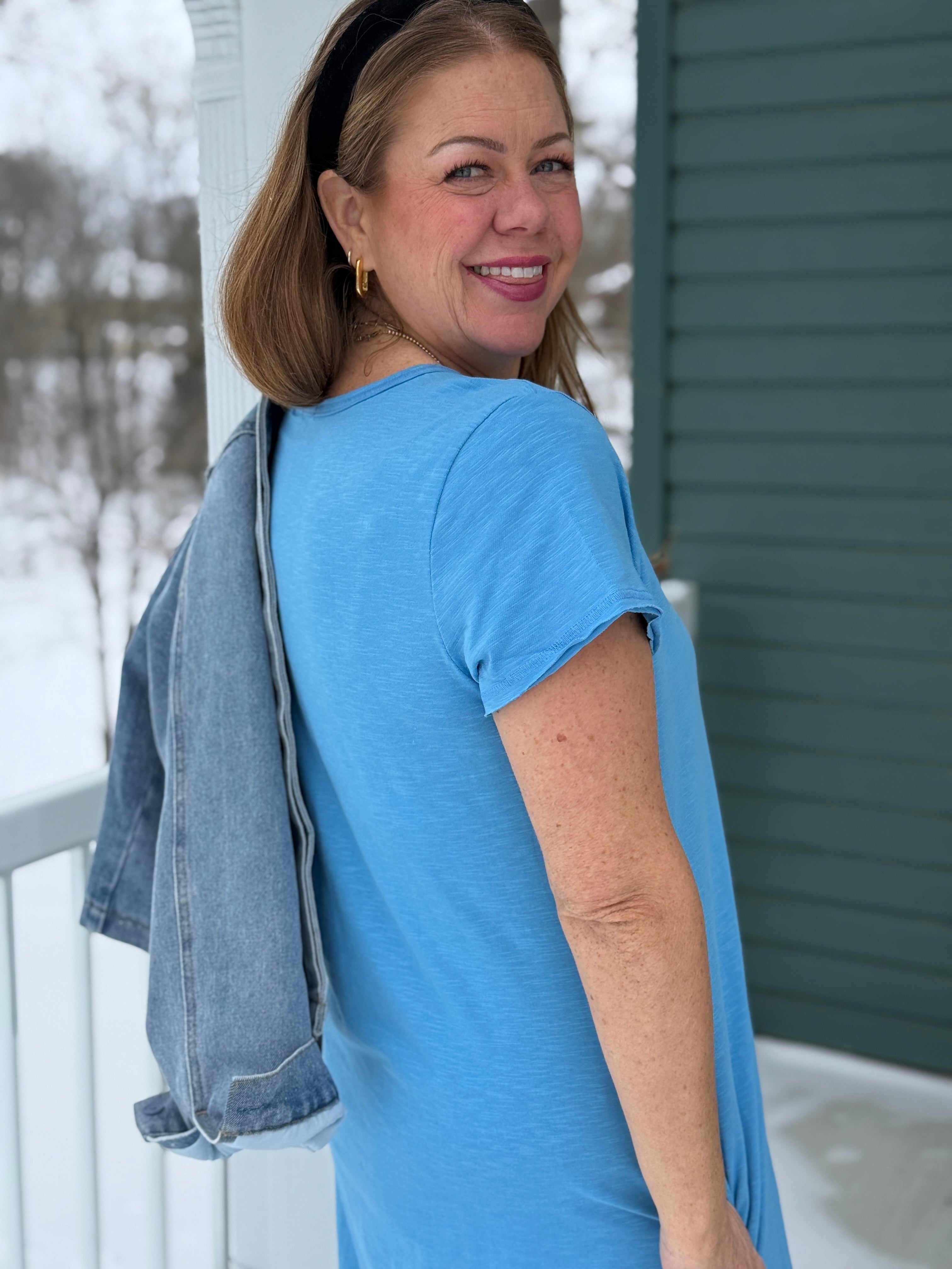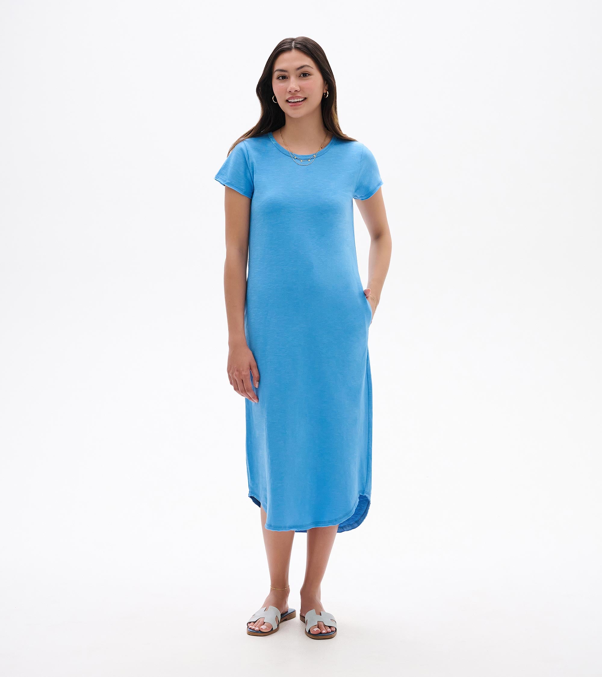 Meet the t-shirt dress that actually gets it right. This azure blue midi has a flattering, slightly hourglass shape that allows room through the hips, plus the detail we all appreciate: real pockets. The midi length feels current and easy, whether worn solo, layered under a jean jacket, or styled for lounging. If you’re heading somewhere warm, it’s an effortless poolside throw-on. If you’re staying put, wear it now for an instant colour boost and a reminder that brighter days are coming.