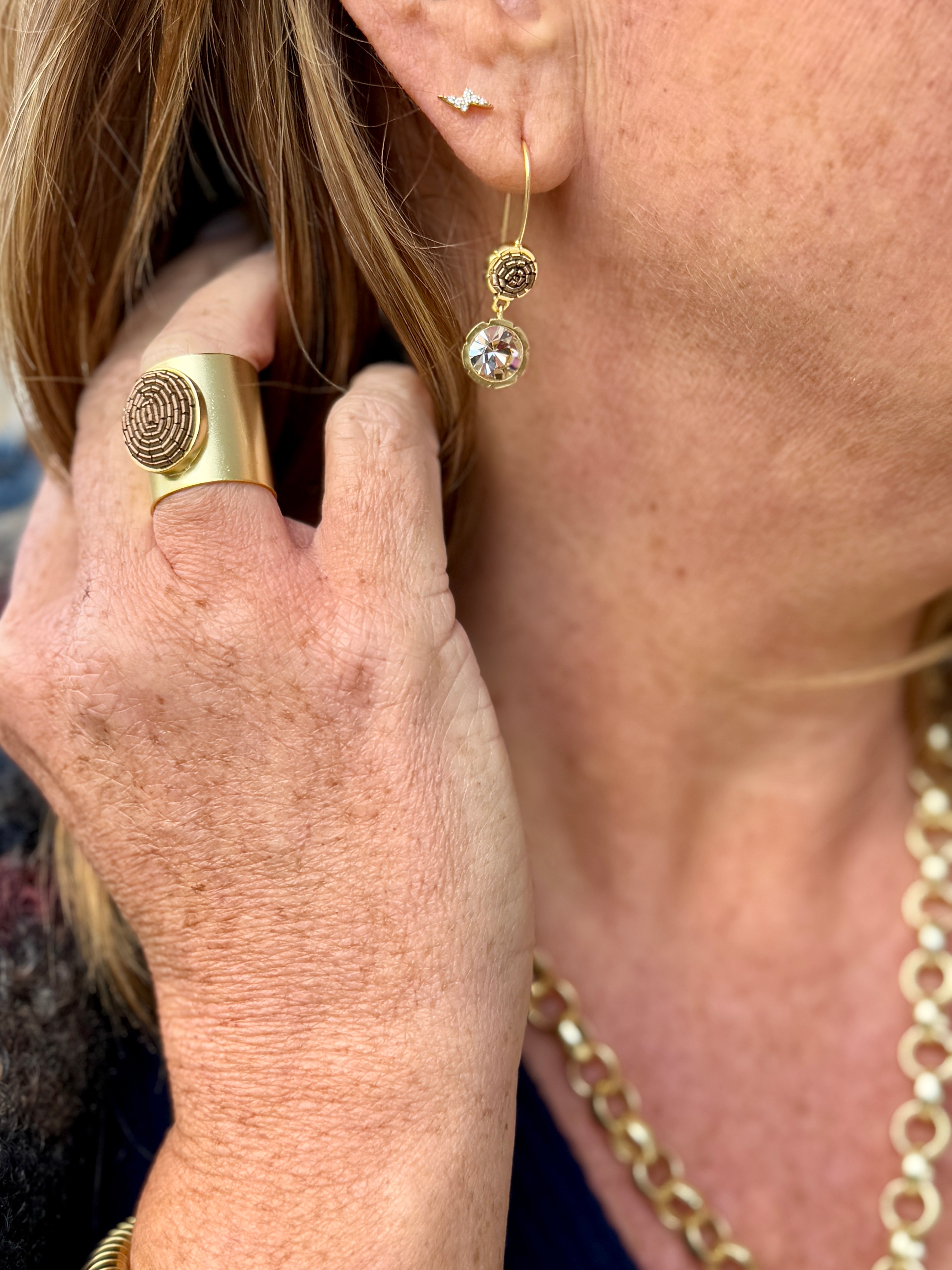 Handcrafted in High Quality Brass, the elegant Maisie earrings feature Akihi's signature intricate embroidery nestled in unique flower-shaped bezels that are lightweight and perfect for an understated statement.