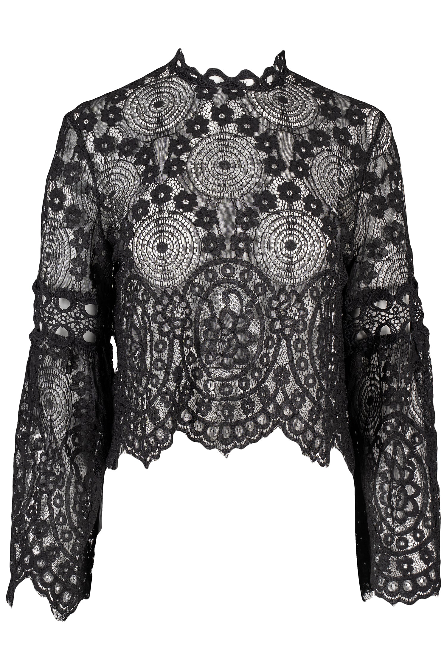 - Soft, full lace blouse with scalloped neckline, trumpet sleeve, scalloped hemline and back button