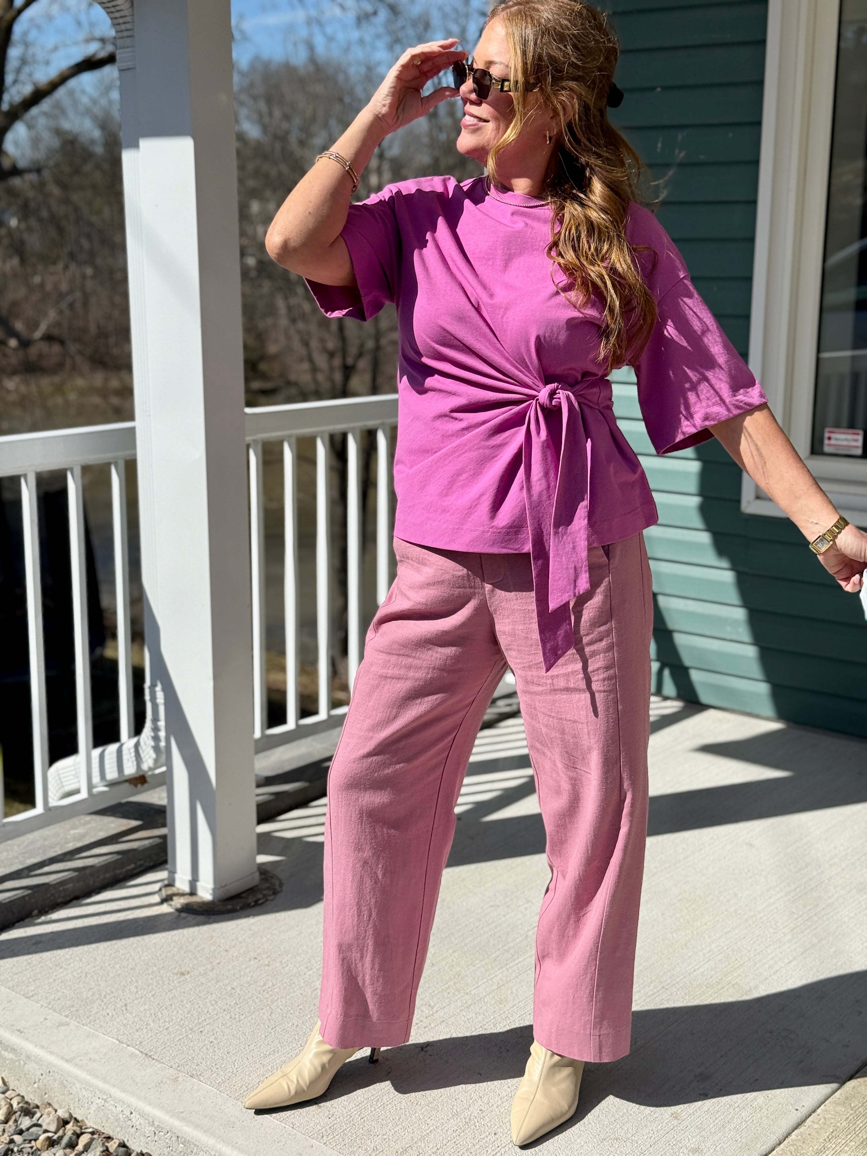 • High rise, stretch linen pant with a slight barrel leg and relaxed fit, trouser pockets
