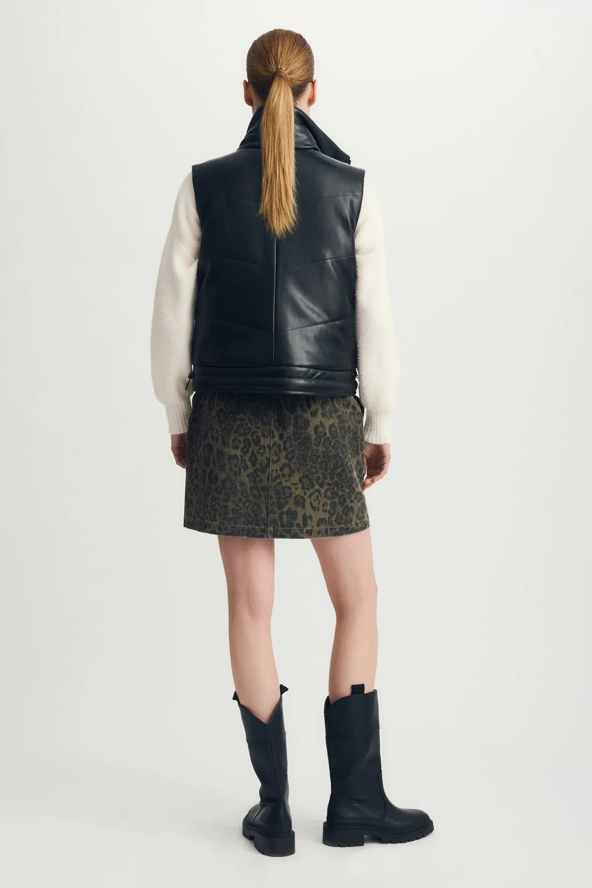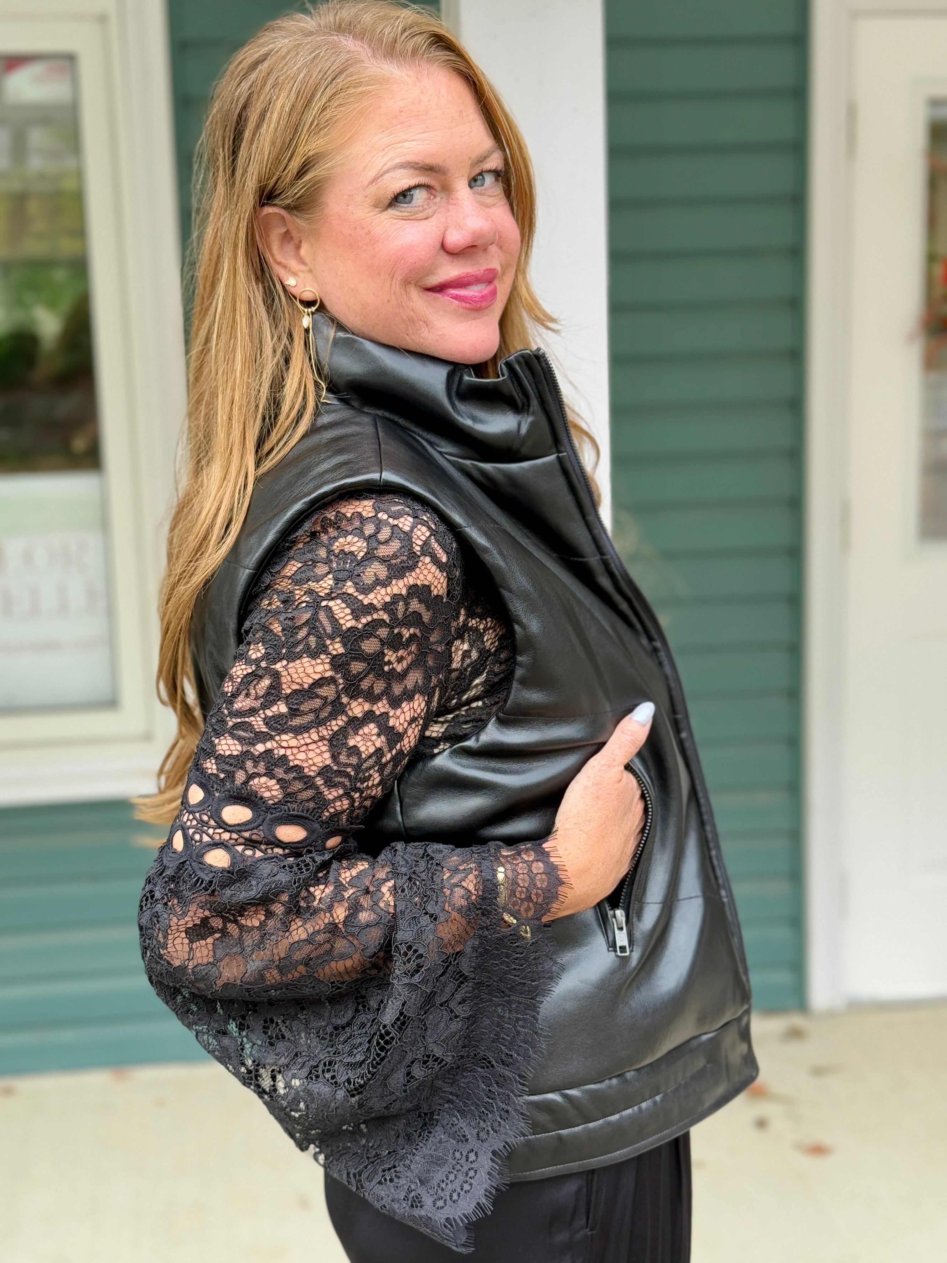- 2-for-1 reversible quilted black vegan leather and sherpa vest with zipper & pockets