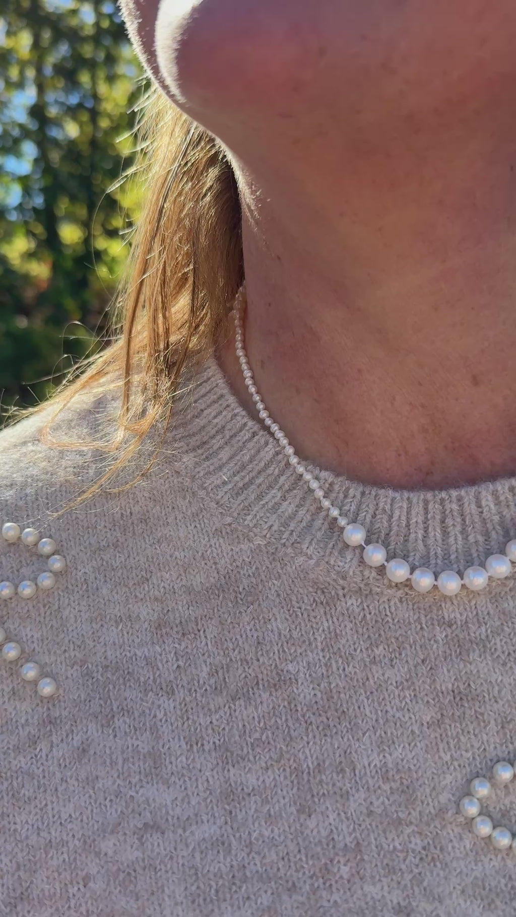 Trending: Classic Pearls. Thank you to Victoria Emerson for delivering in a modern way. These organic pearls are made of the highest quality Freshwater Pearls. Small dainty pearls are strung with classic medium-sized pearls to create a modern asymmetrical design and add a little classic style to your neckline, from tshirt to blouse.