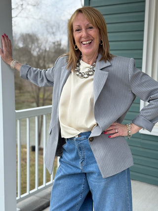 Hilary MacMillan Fitted Denim Blazer (with 5 Brooches!)