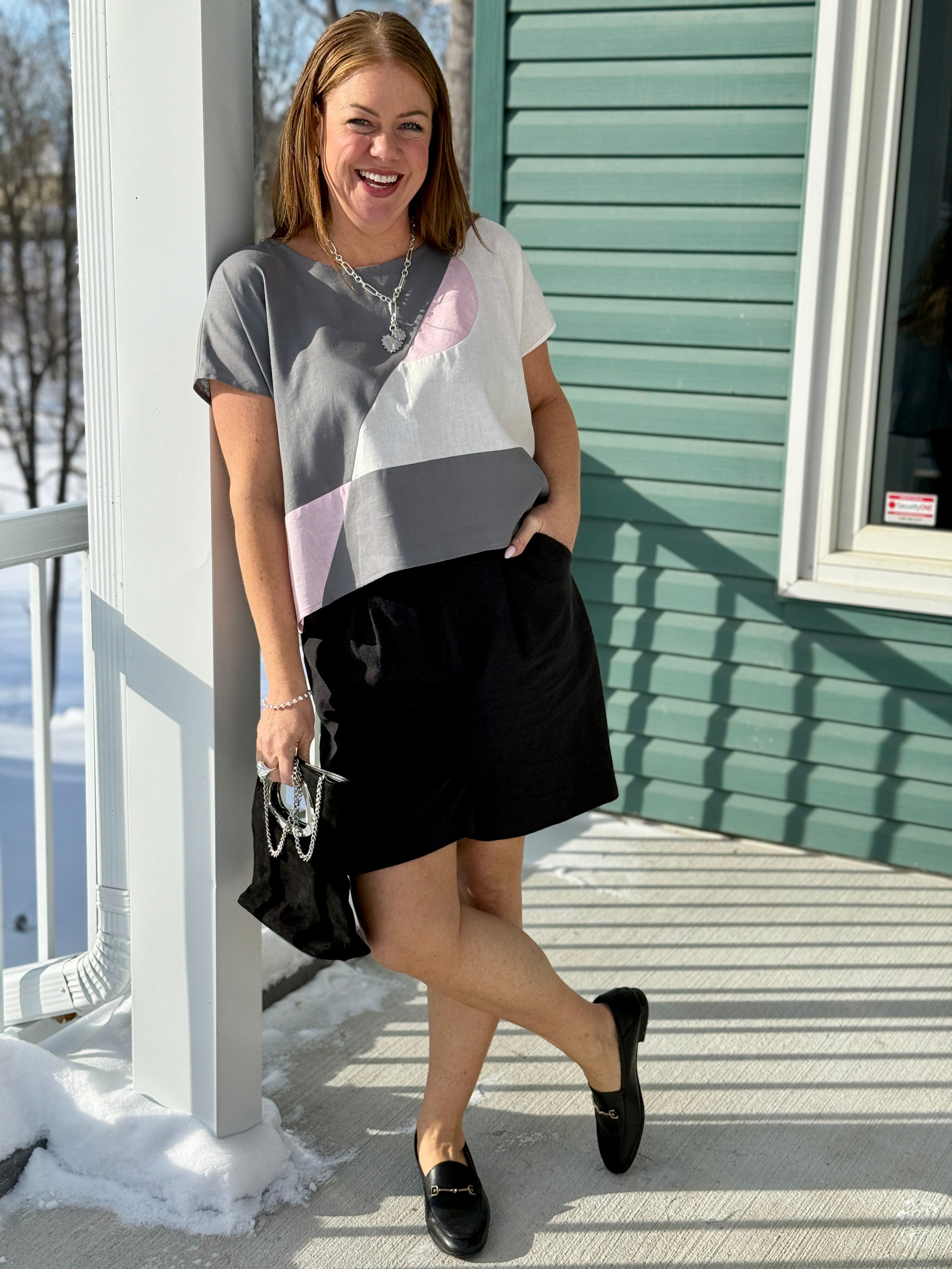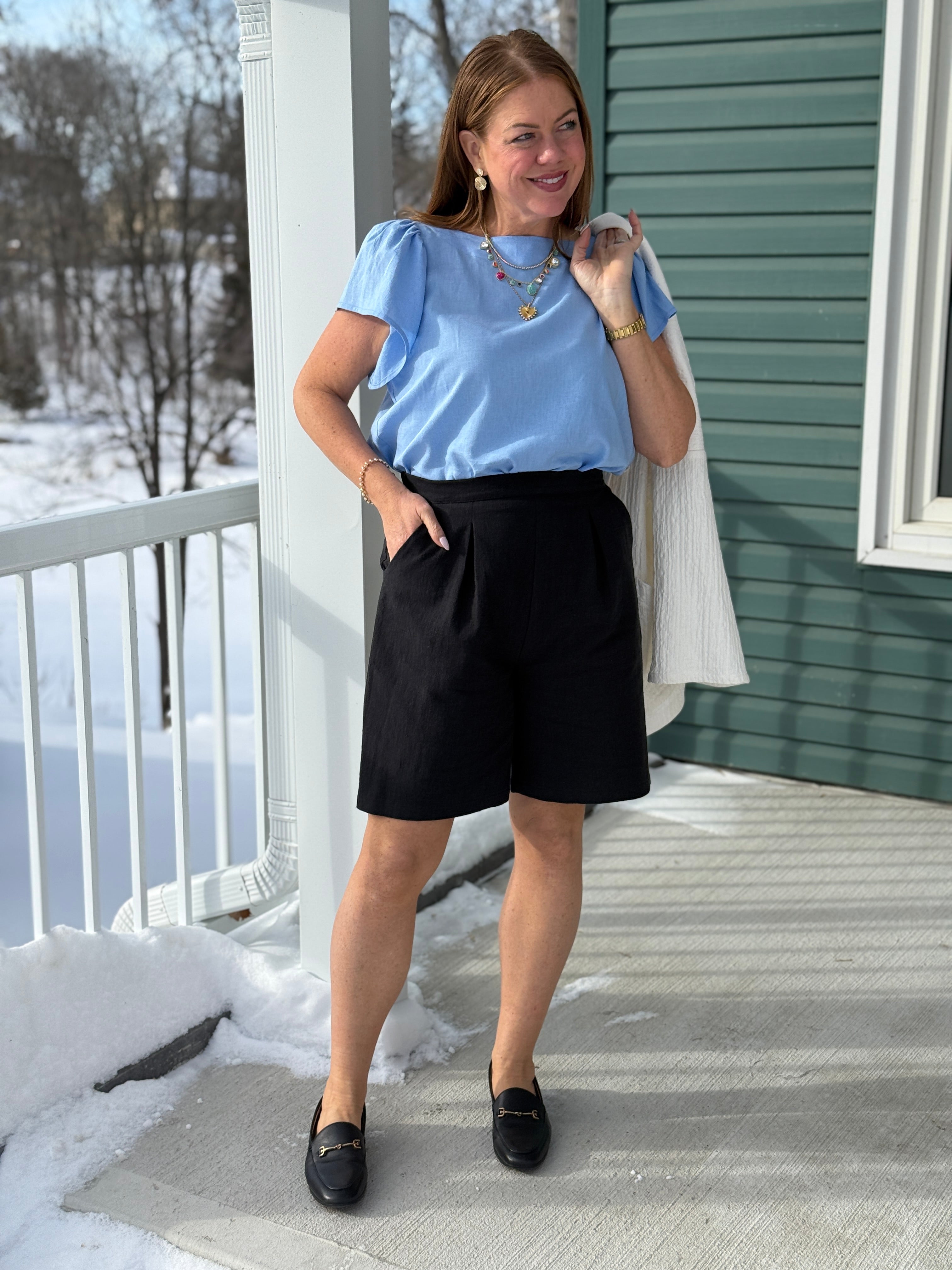 These Bermudas are designed to move with you—wherever the day decides to go. Cut from breathable, sustainable ramie, they feel light and natural against the skin while still holding their shape beautifully. Soft front pleats bring a sense of polish, while the straight waistband is cleverly finished with a back elastic insert and an invisible zipper for a fit that’s flattering, comfortable, and quietly forgiving. Right now, Lucina plays well with tights and a jacket. Come summer, they’re your go-to with relaxed tees, crisp tanks, and floaty blouses.