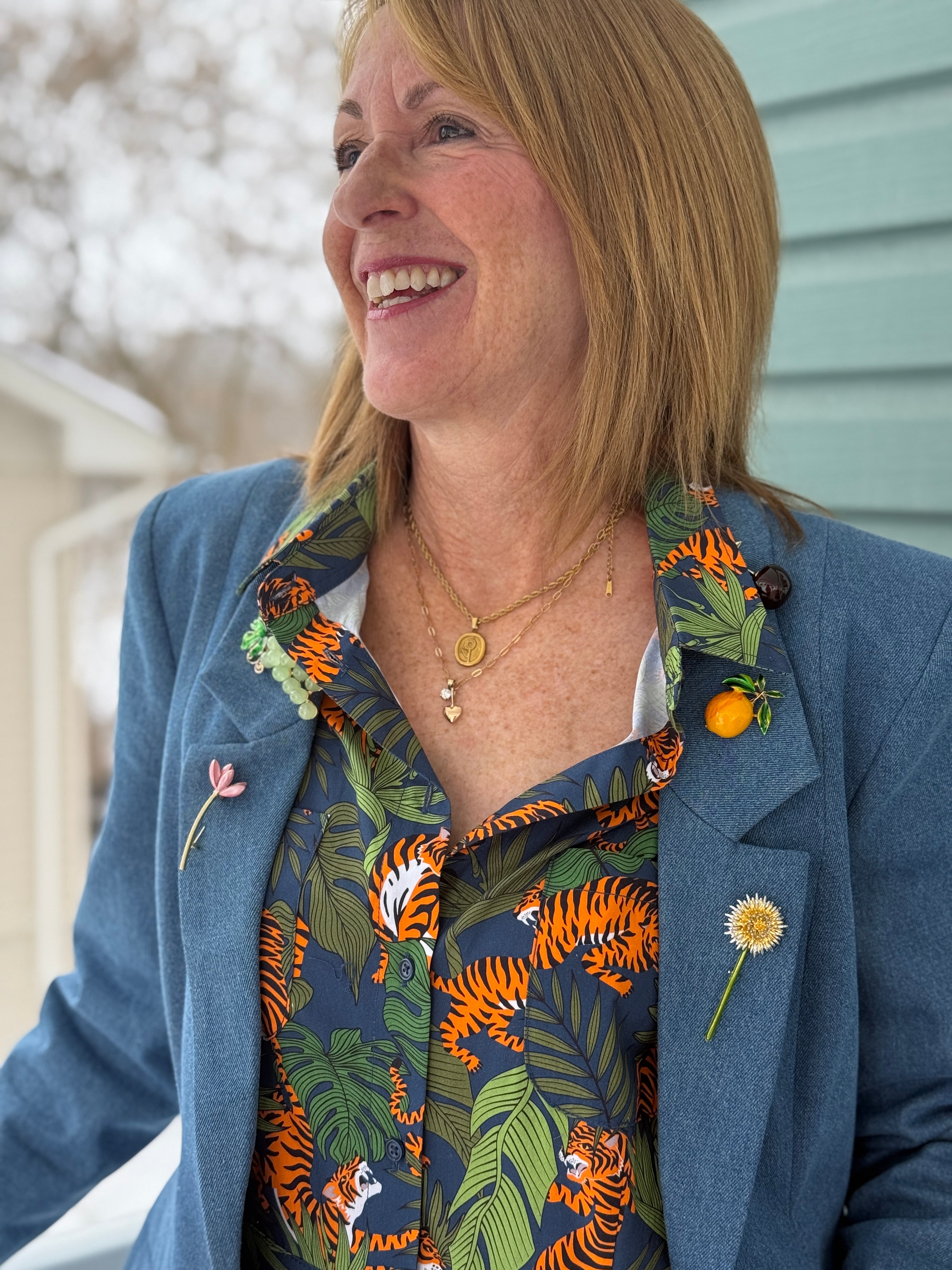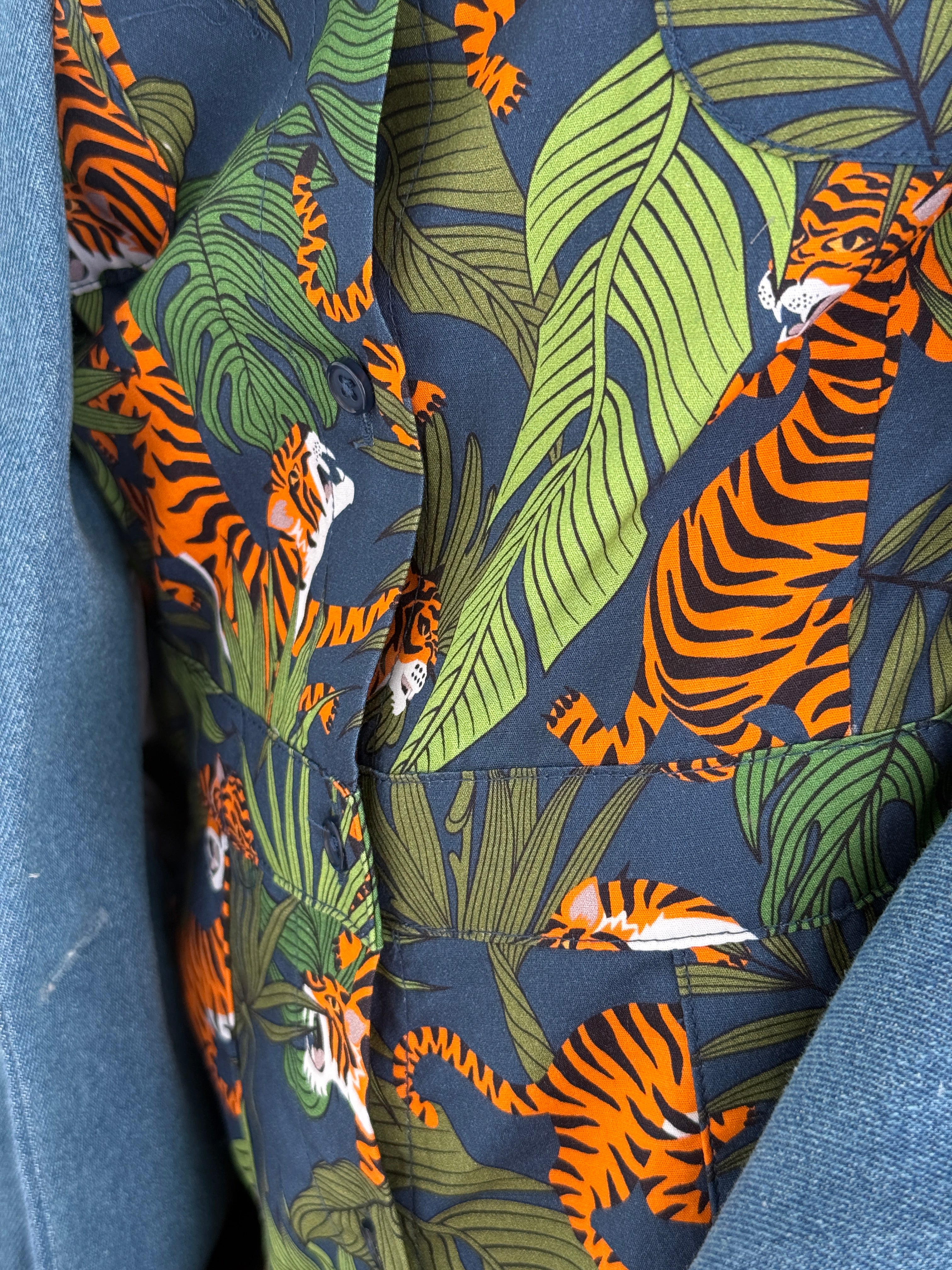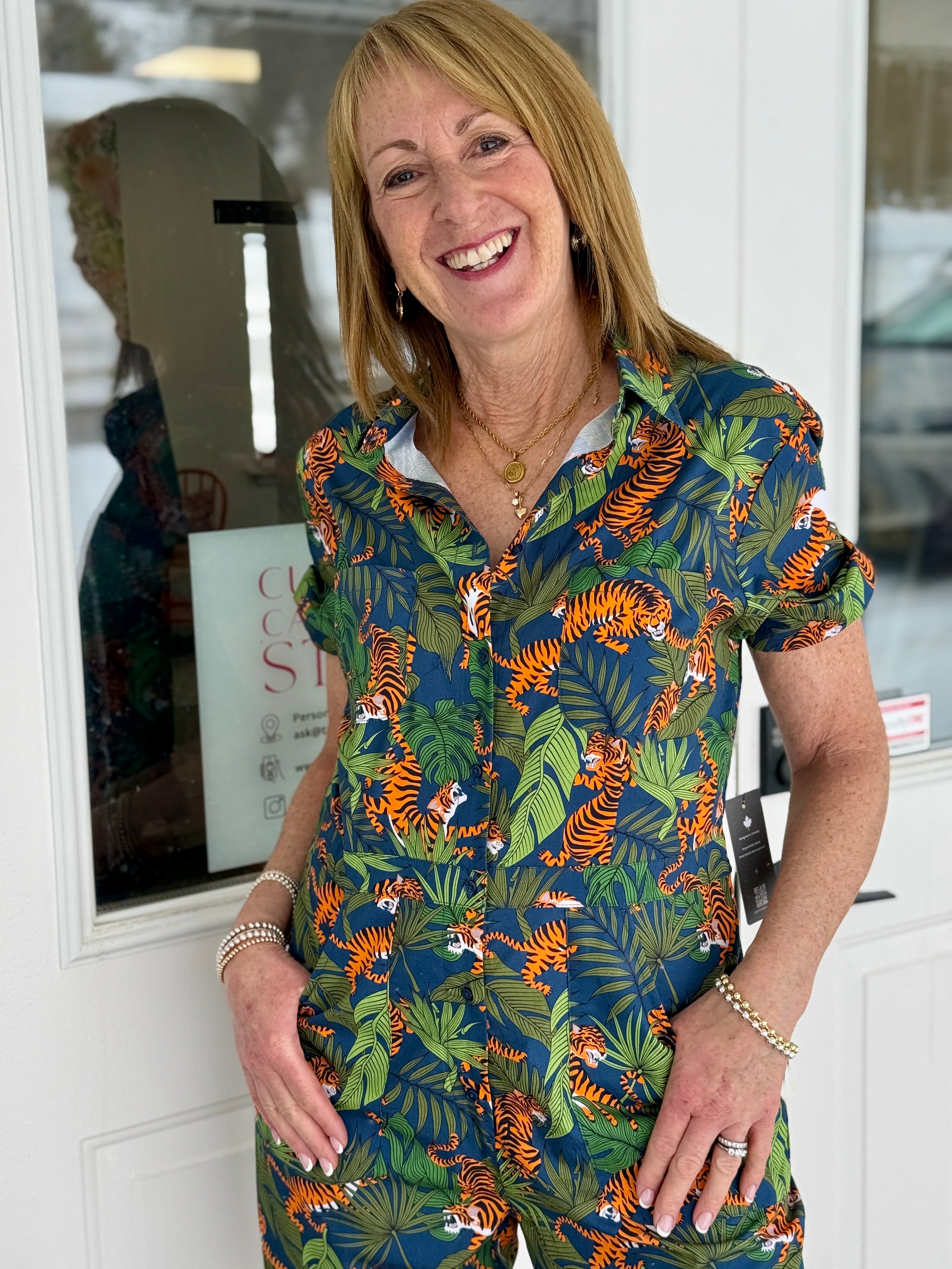 ROAR! Meet the jumpsuit that refuses to blend in. This collared, button-front beauty features Poplin & Co’s signature hand drawn tiger print — wild tigers prowling across a rich navy backdrop with lush greenery. It’s bold, vibrant, and guaranteed to turn a sidewalk into your runway. Designed with patch pockets, elbow-length sleeves, and a stretch waistband in the back for an easy, flattering fit, this piece gives you polish without the fuss. It’s that magical alternative to a dress or the usual jeans-and-a-blouse combo — one and done, out the door, looking fabulous. Add sneakers for daytime cool or a heel for instant wow. Consider this your spring power move.