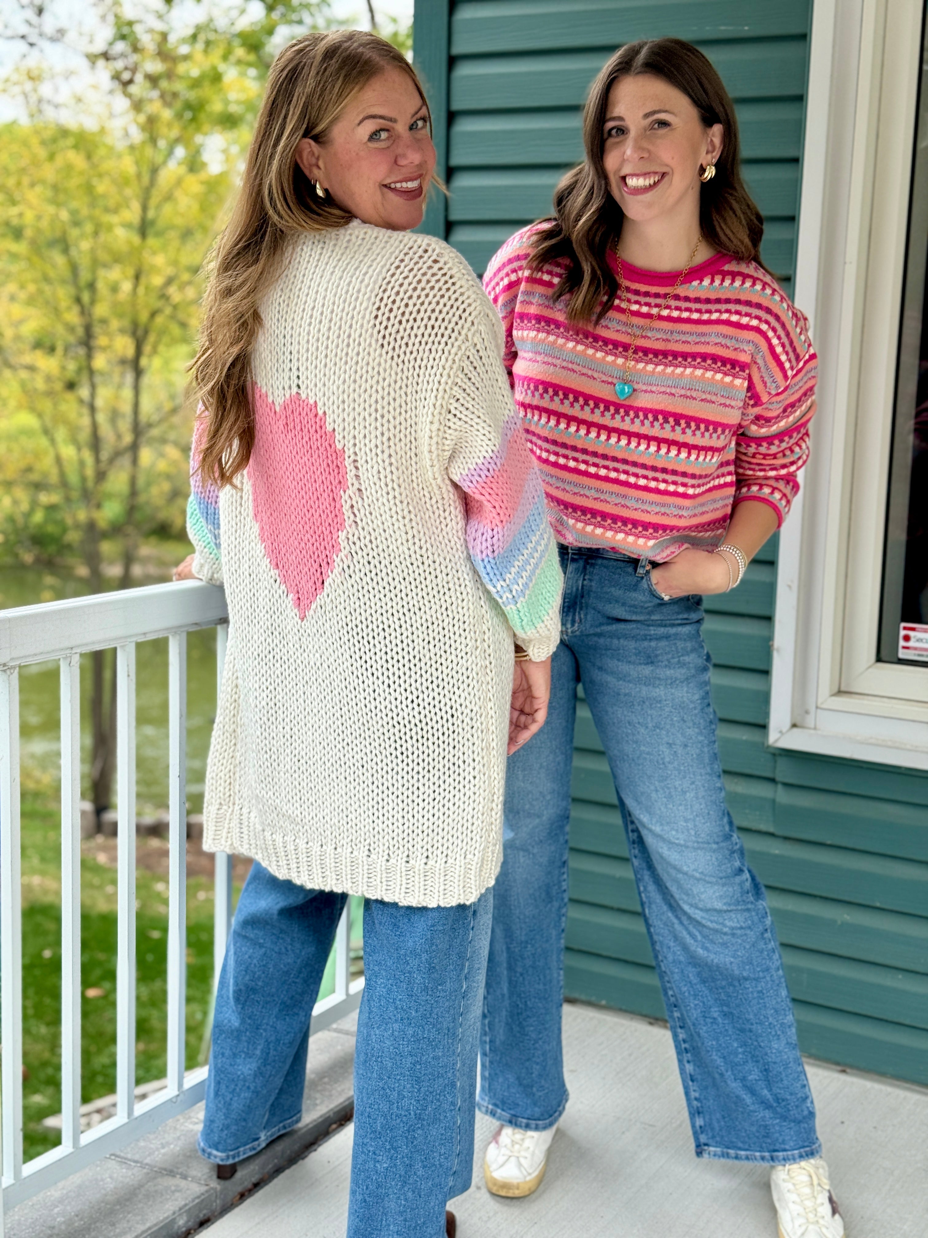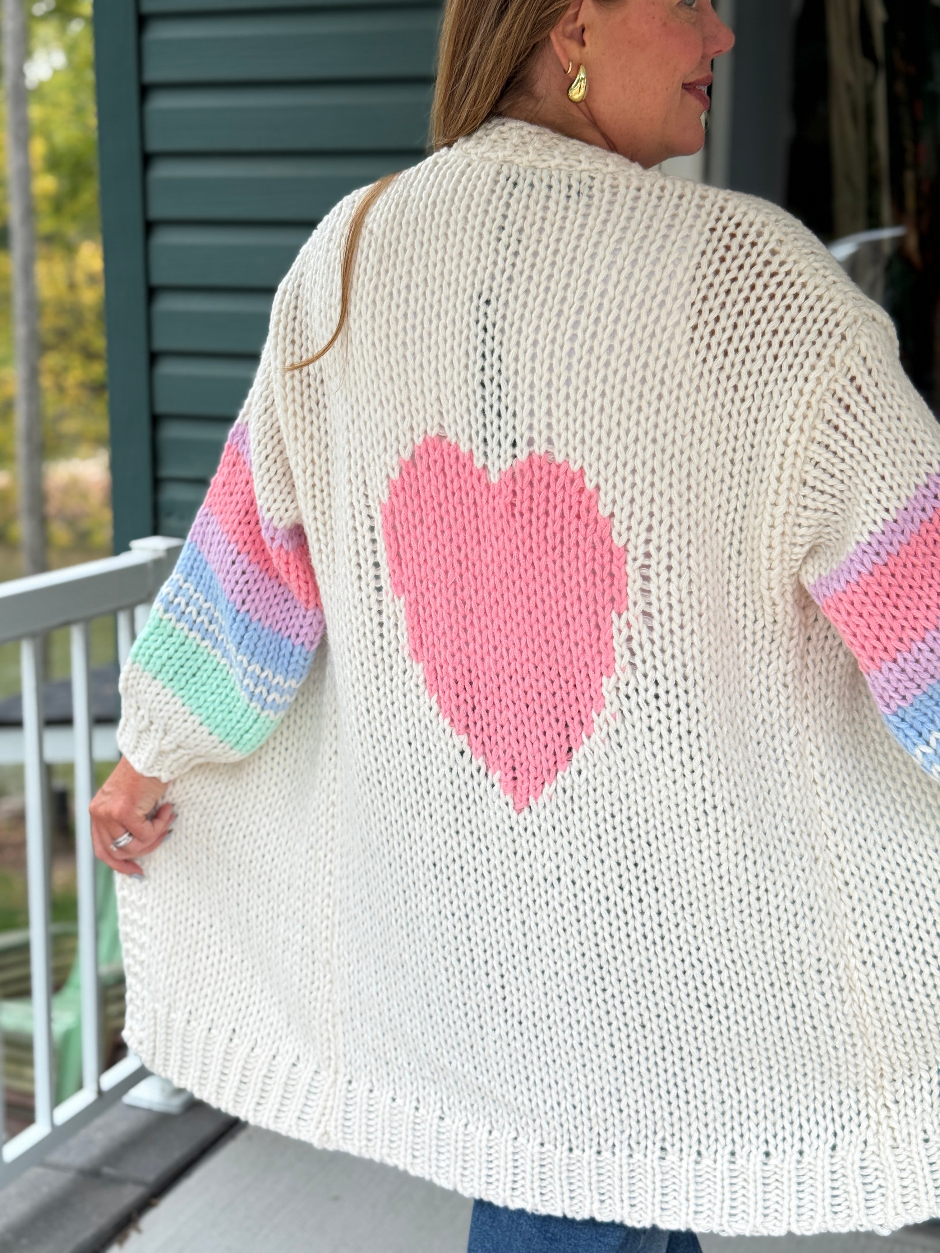 The Shiloh Cardigan by Lyla & Luxe isn’t just a layer—it’s a whole mood. Bold, cozy, and brimming with personality, it’s the kind of knit that turns grey days technicolour. Crafted in a chunky open weave with pastel rainbow sleeves and a big pink heart splashed across the back, Shiloh is equal parts comfort and charm. Slip it on for coffee runs, couch days, or whenever you need a little extra joy in your outfit. Because life’s too short for boring cardigans—and this one makes sure you never blend in.