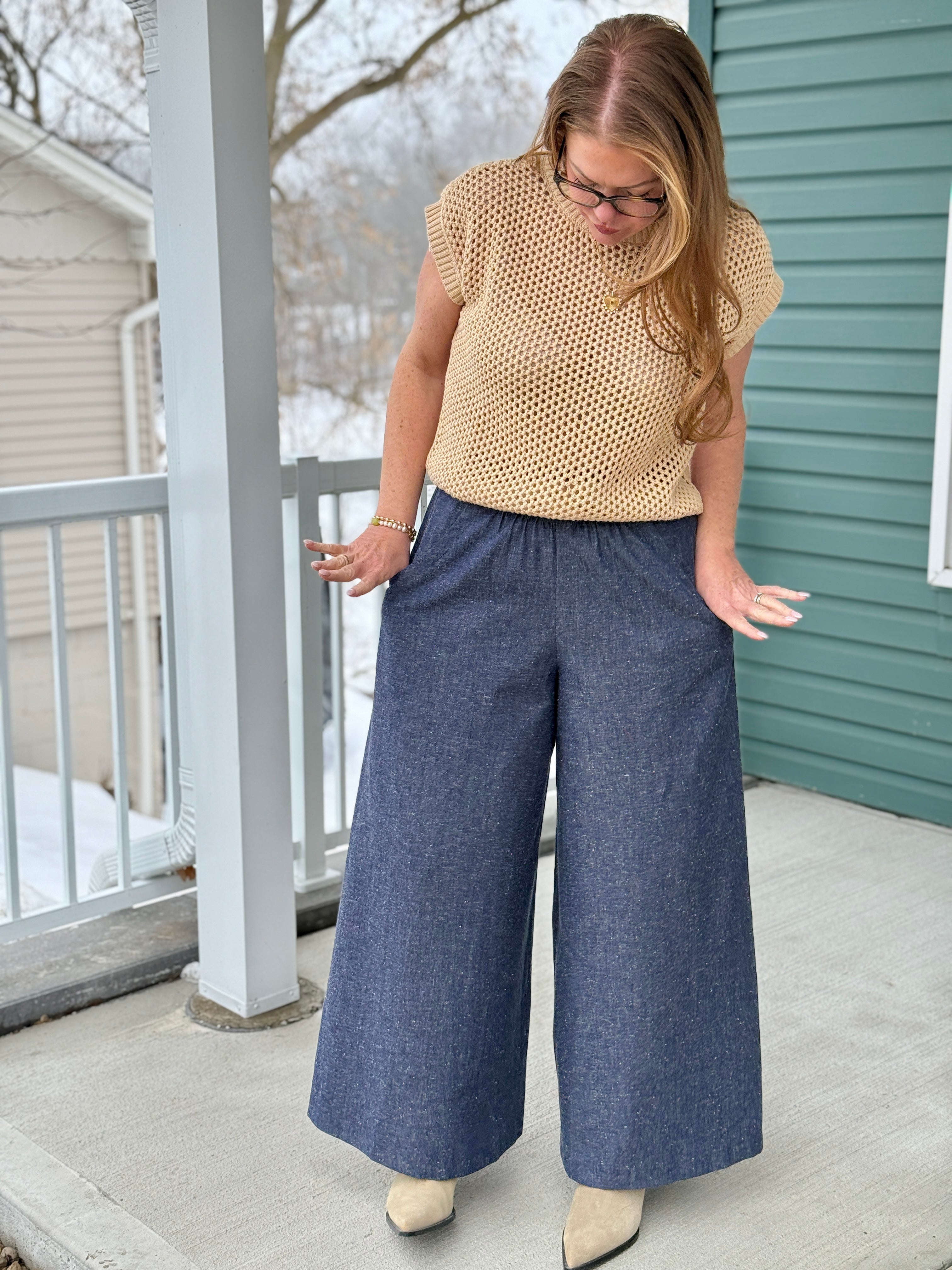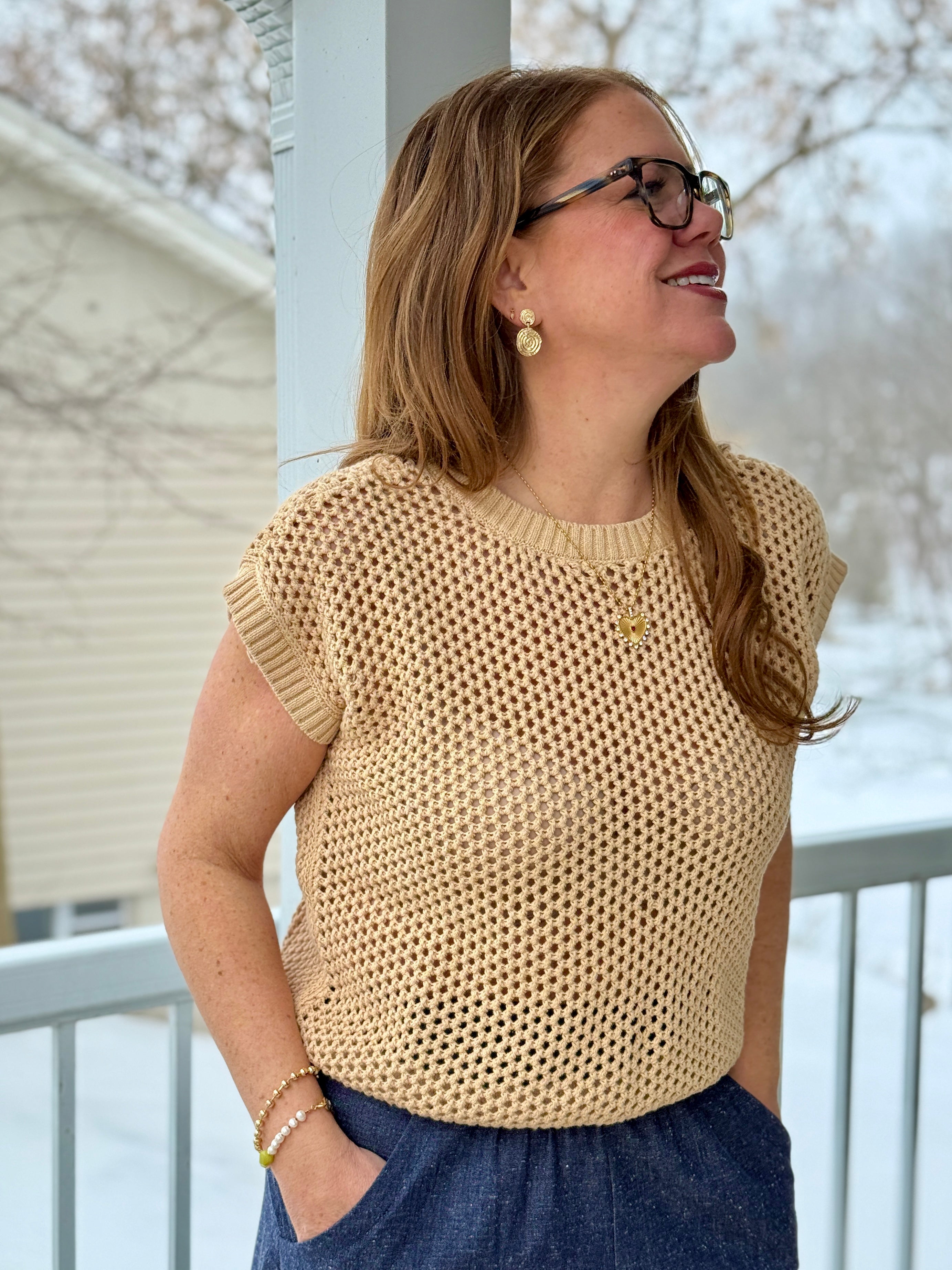 The Nola Crochet Top by Melissa Nepton is bound to be a new favourite and your all-season go-to in a rich camel hue. This short-sleeved sweater is crafted in a delicate crochet pattern that feels light yet luxe, perfect for layering or wearing on its own. The hip-length cut makes it versatile for tucking or letting it drape effortlessly, while a subtle 2-button closure at the back neckline adds a refined, unexpected detail.