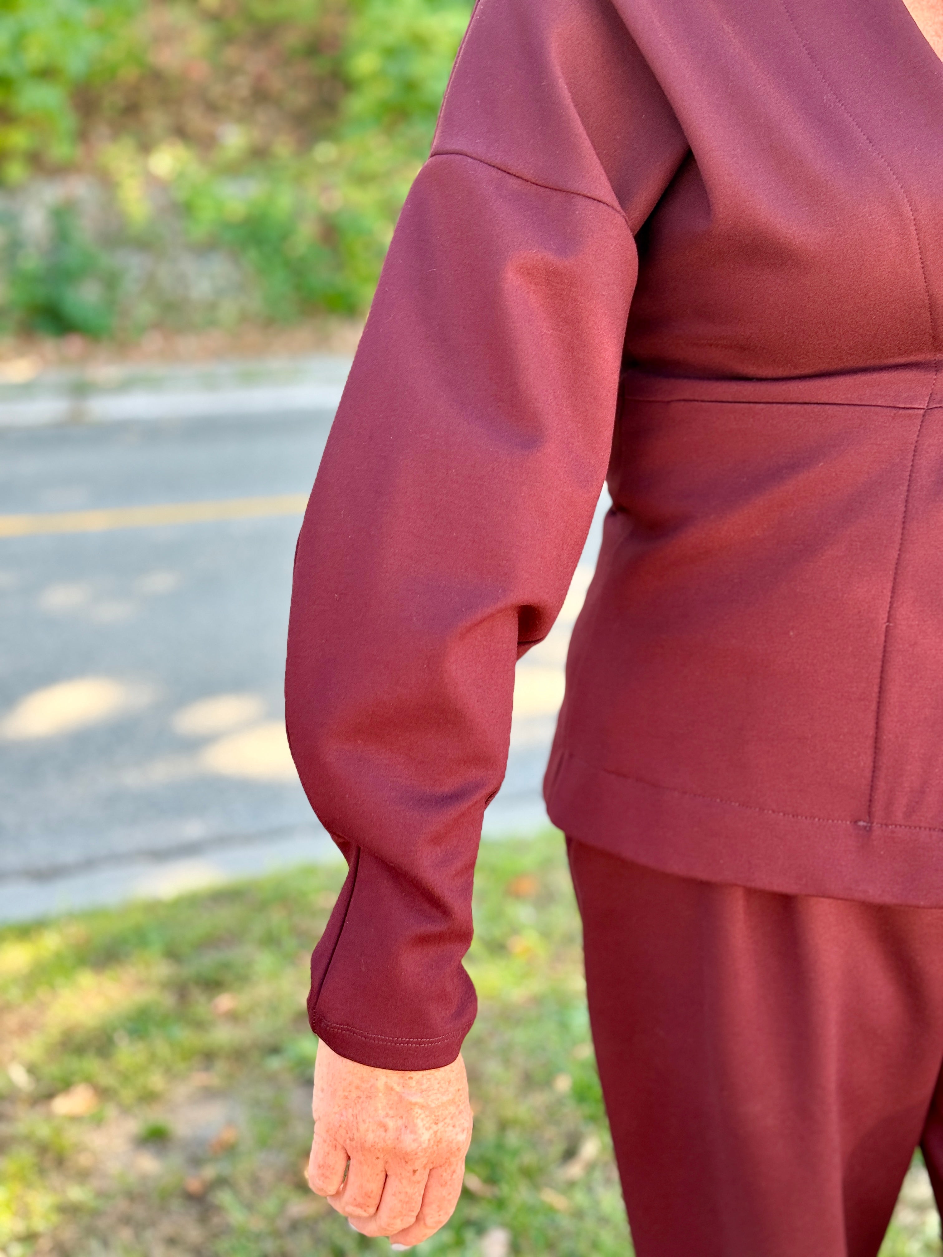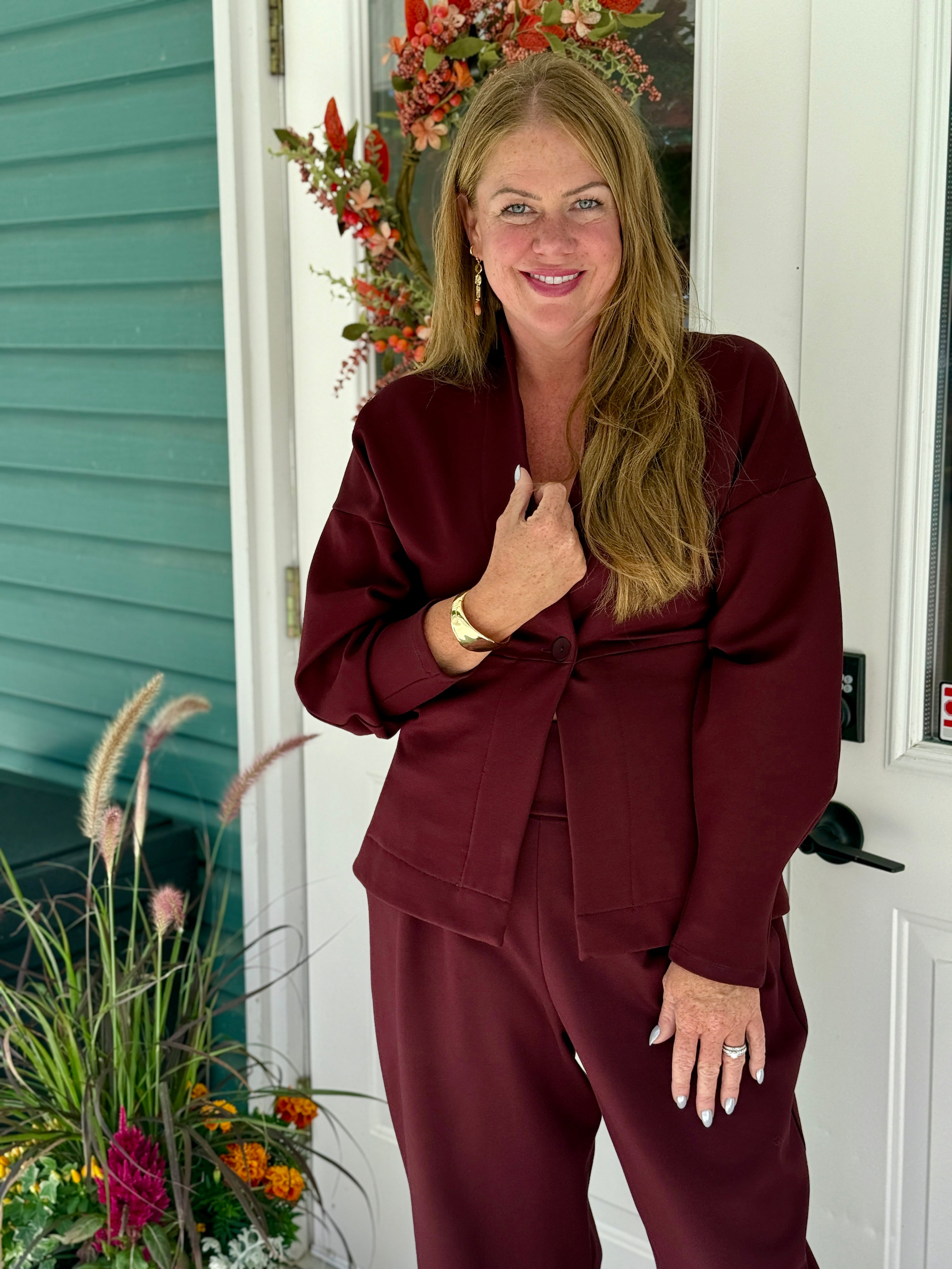 Make your power move in one of fall 2025’s key colours—rich, confident burgundy. The Leanne blazer by Melow of Montreal is cut in a soft stretch fabric with a sleek shawl lapel, striking architectural sleeves, and a single button front closure that defines the waist. Front slit pockets add function without fuss, while the tailored design makes this piece as versatile as it is statement-making. Pair it with the coordinating Wilfred pant for a modern, head-to-toe look, or throw it on with your favourite jeans to instantly boost your chic level this fall.