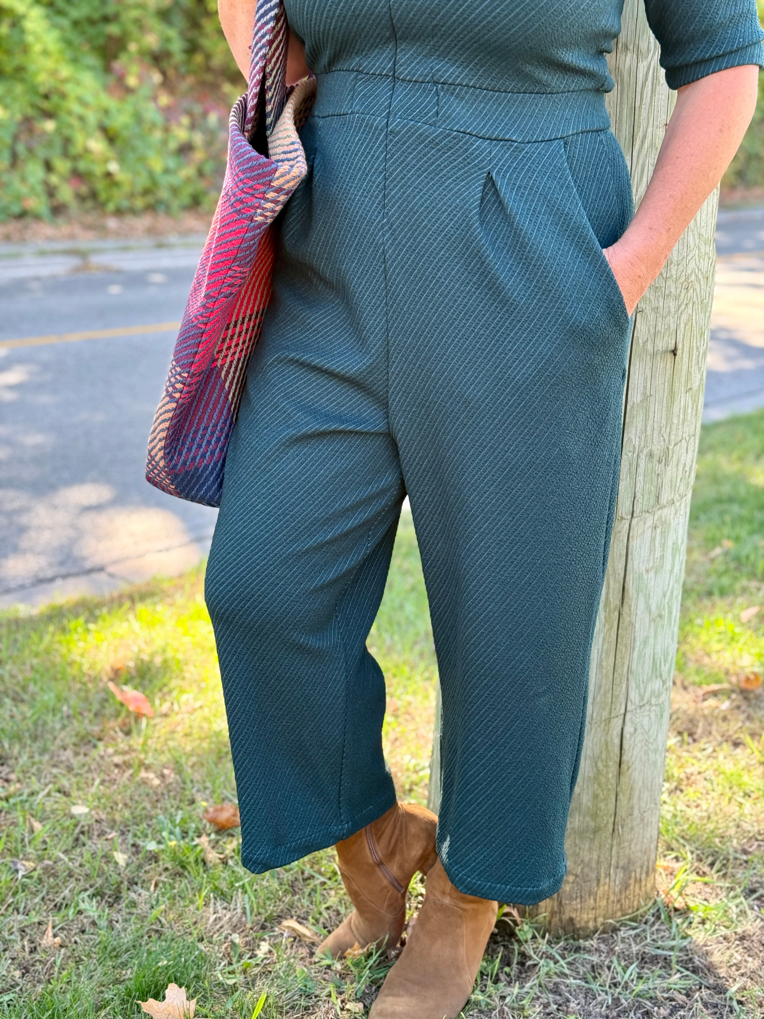 Stretchy, comfortable, and designed for real life—the Lexie jumpsuit is as easy to wear as it is to slip on and off. Your new one-piece wonder, it blends polish with practicality for fall dressing and beyond. Crafted in a soft stretch fabric, it moves with you while keeping its shape. An invisible front zipper creates a clean, minimalist line from the high V-neck down, while elbow-length sleeves and a defined waist flatter your silhouette without feeling fussy. The wide-leg, cropped 3/4 pant adds a modern edge, perfect for showcasing your favourite boots, loafers, or heels. In stunning jade it's a style made famous by Melow for it's comfort and oustanding level of chic.