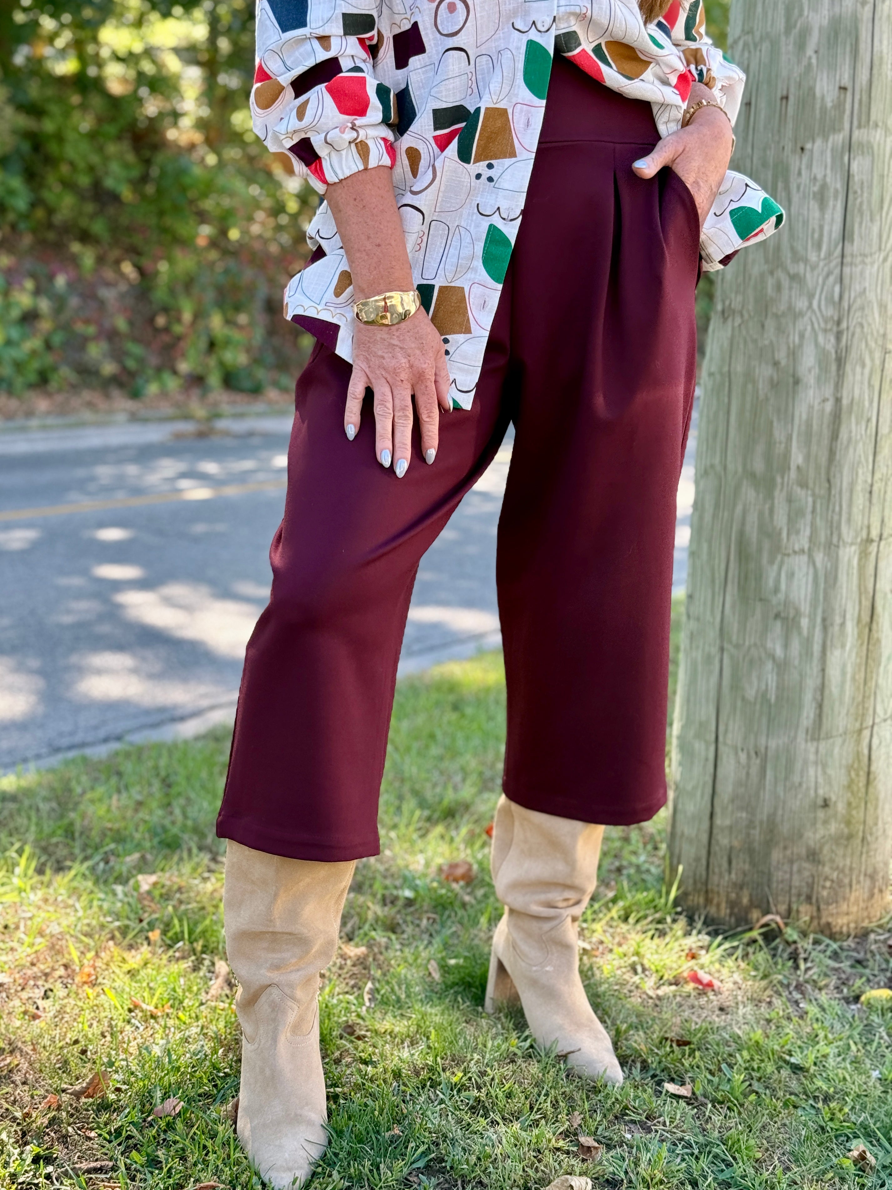The pant that started it all—Melow’s Wilfred Pant is beloved for its effortless combination of comfort and style. This season’s must-have burgundy—neutral yet punchy—makes it a standout piece for fall. Pull-on ease meets a flattering high-waist and wide-leg 3/4 length cut, with thoughtful darts and a wide-lined stretchy waistband that moves with you all day. Two side pockets add practicality, while the versatile design makes it perfect for everyday wear or dressing up. Pair it with the coordinating Leanne blazer for a polished, head-to-toe look, or your favourite cream sweater for a chic, relaxed fall outfit.