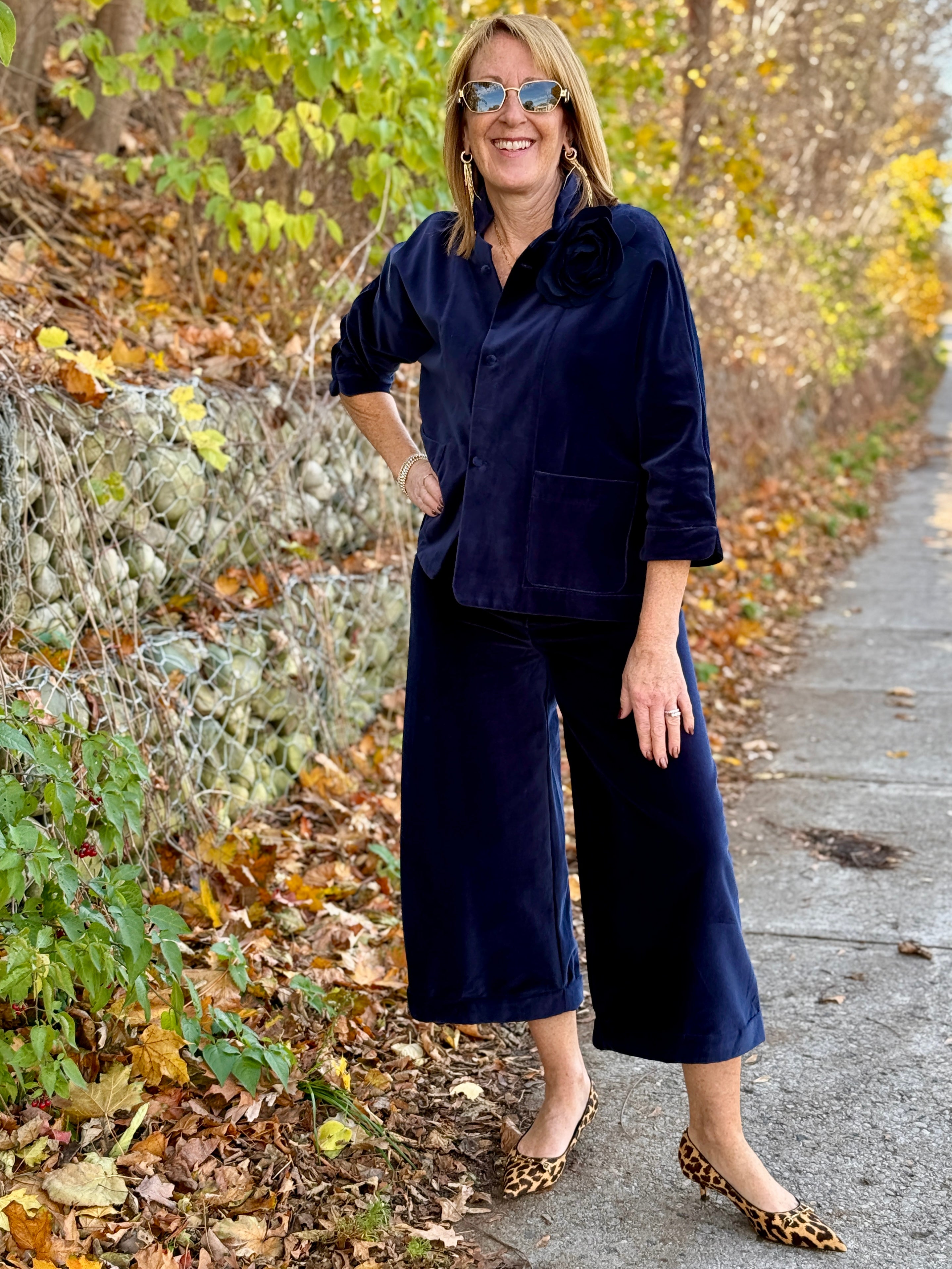Naif's Alana Pant is where comfort meets quiet luxury. Cut from a rich, deep navy velvet with just the right amount of sheen, this pull-on pant drapes beautifully through a relaxed wide leg and finishes with a chic fixed cuff. Made from a mid-weight, cosy velvet that feels as good as it looks, it’s an effortless choice for holiday dressing or evenings in. Pair it with the coordinating Faurelle jacket for a statement set—or a soft sweater for laid-back elegance.