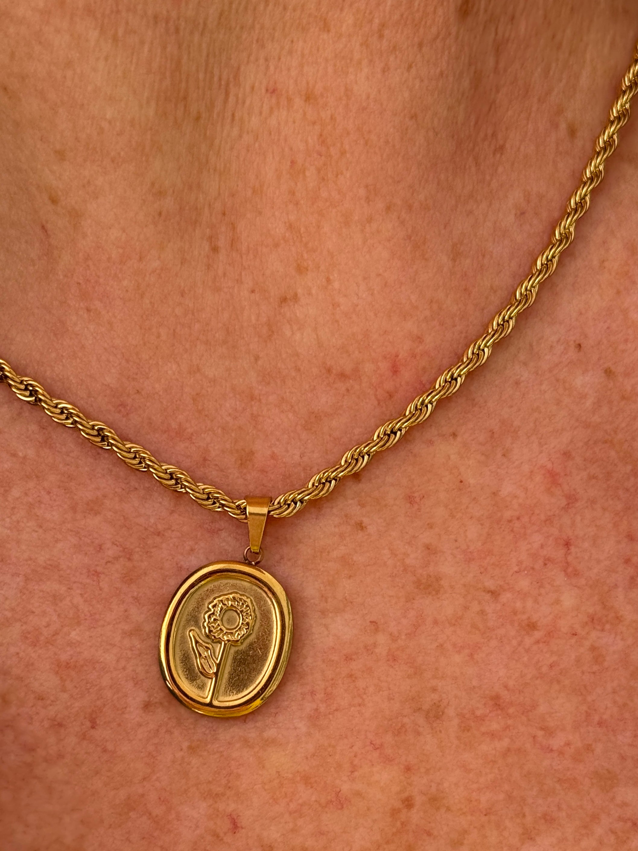 Sunflowers always face the sun, and you do too! The gold-plated finish gives it a distinct embossed look and guarantees it as an amazing everyday necklace. A twisted rope chain gives this floral necklace an added baroque edge.