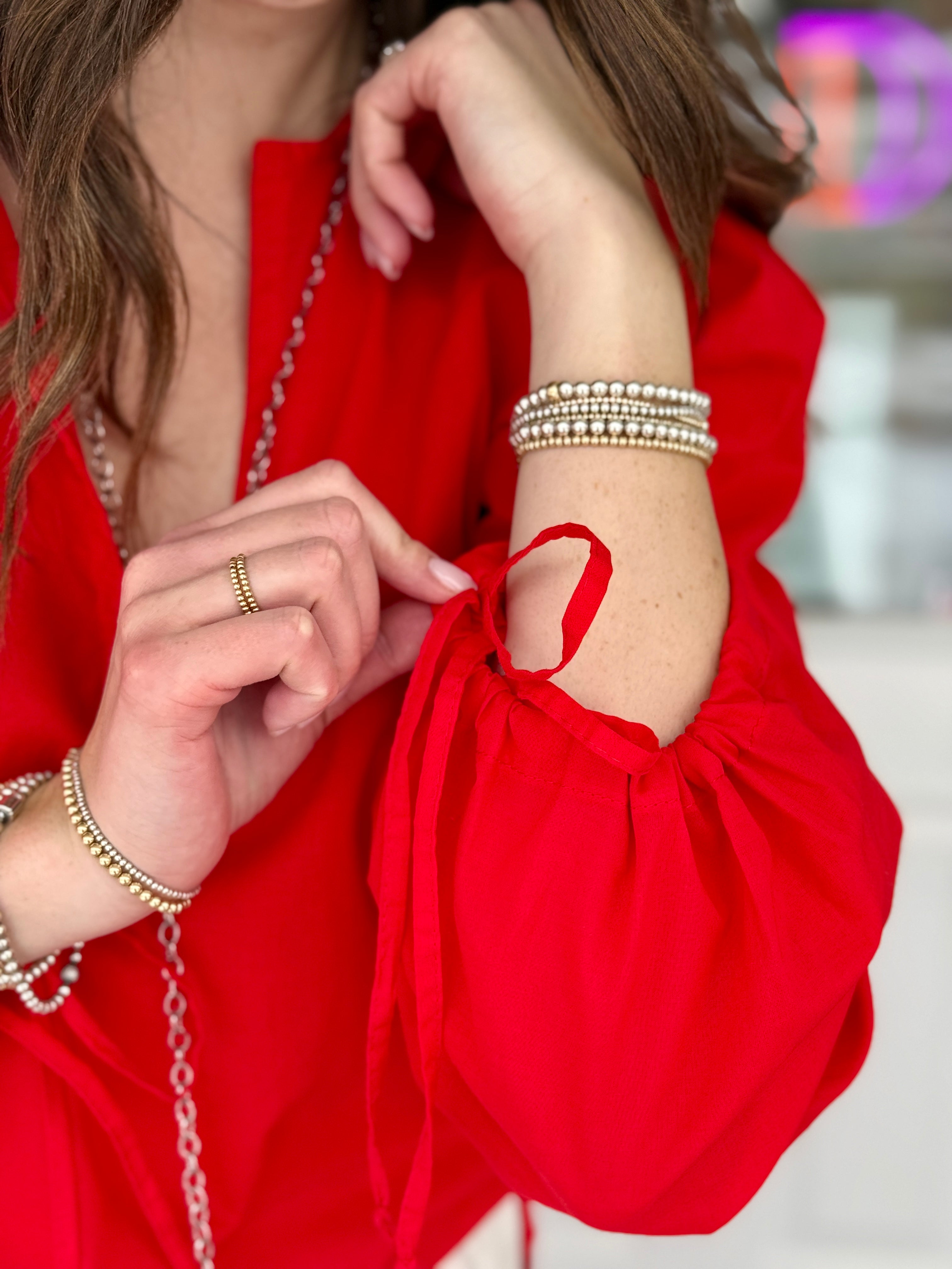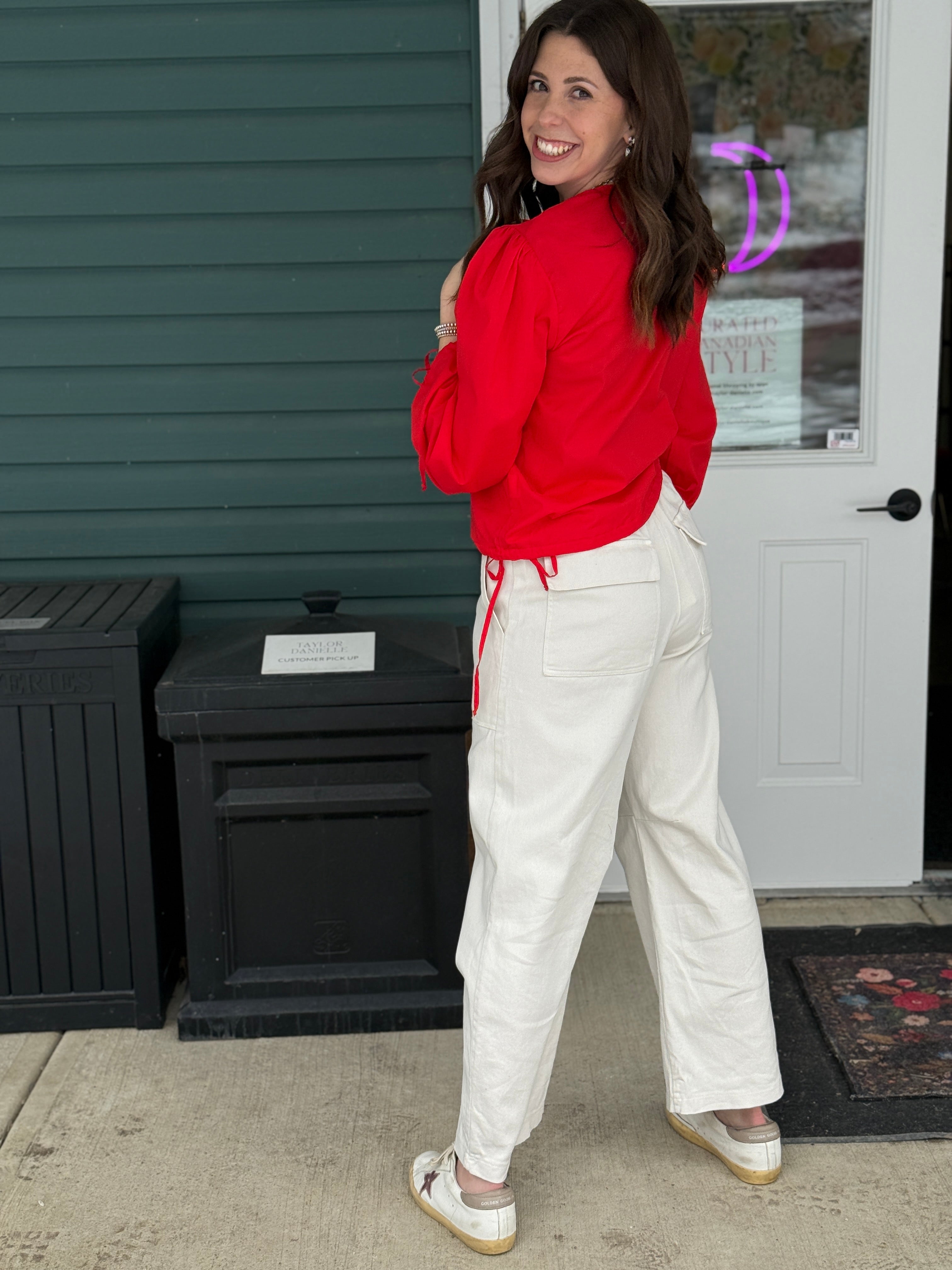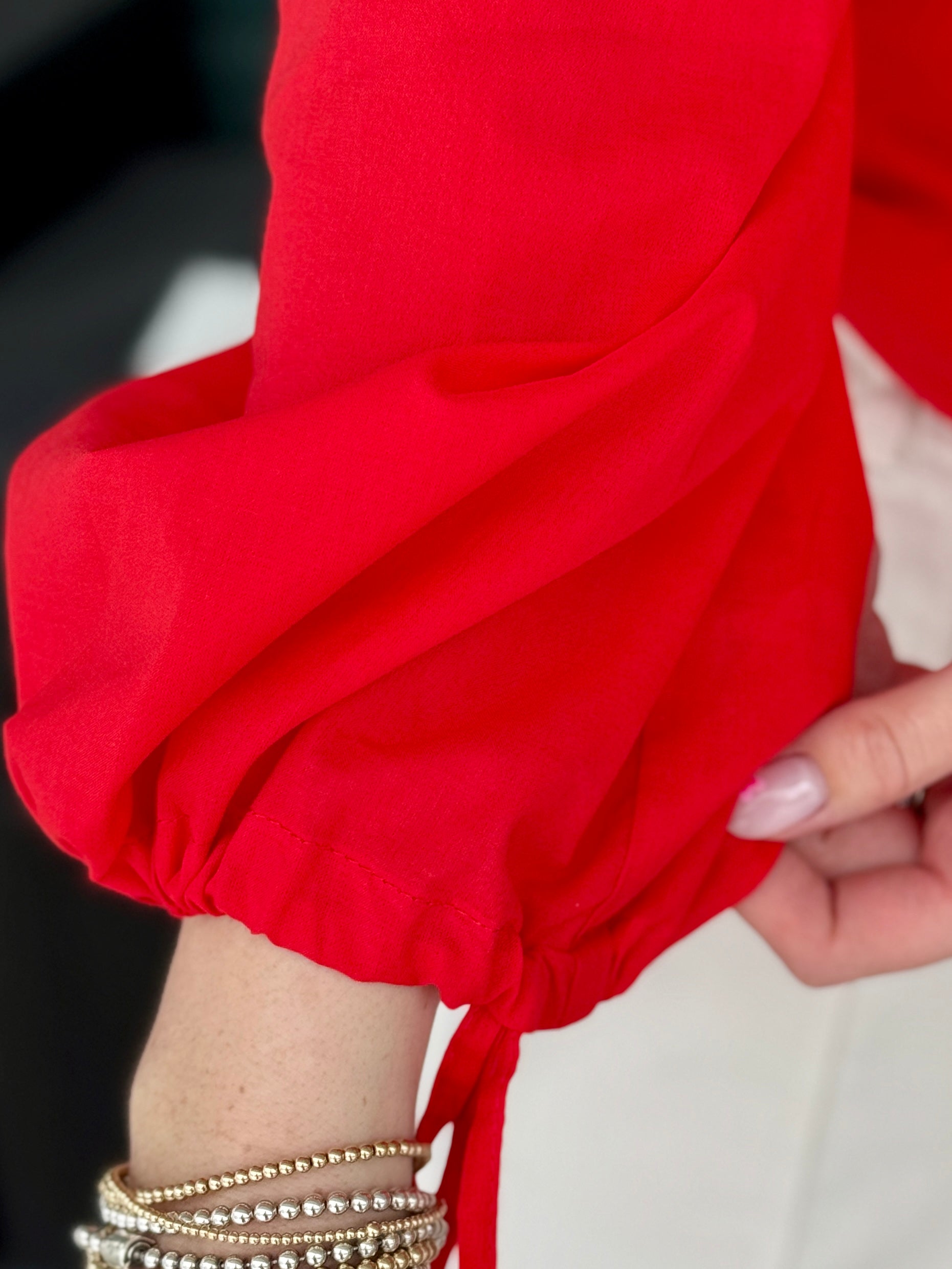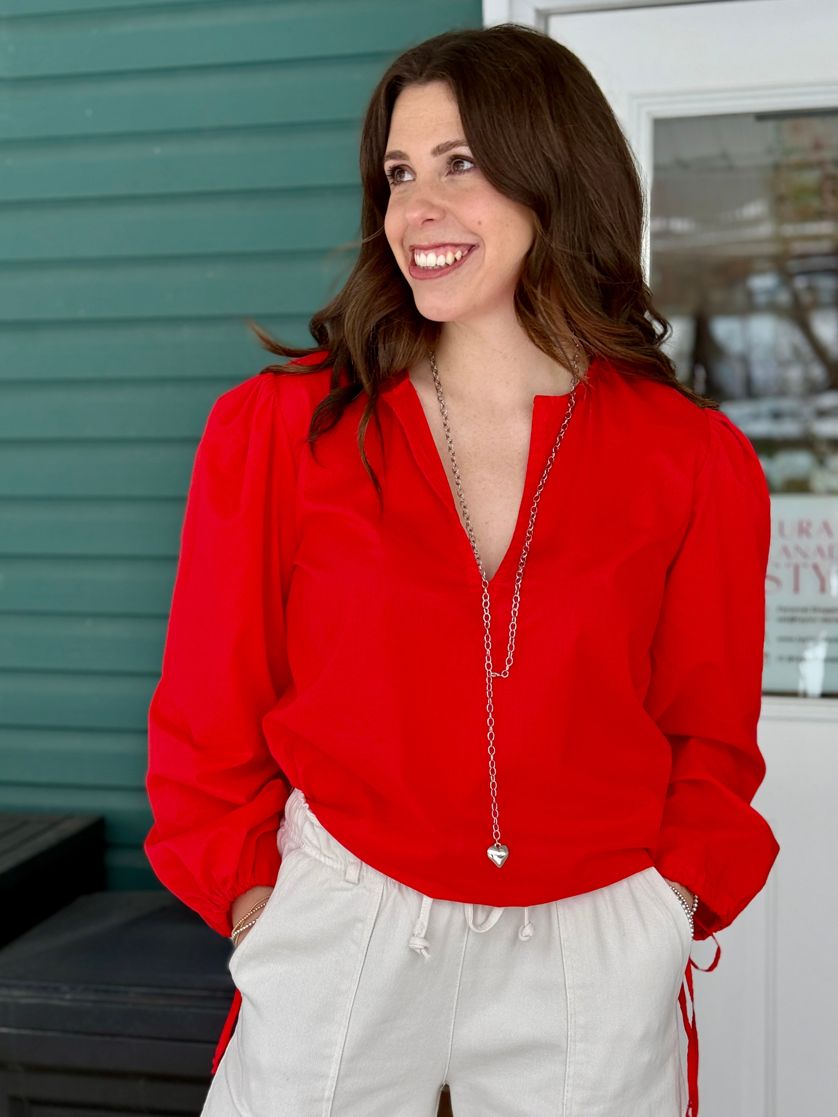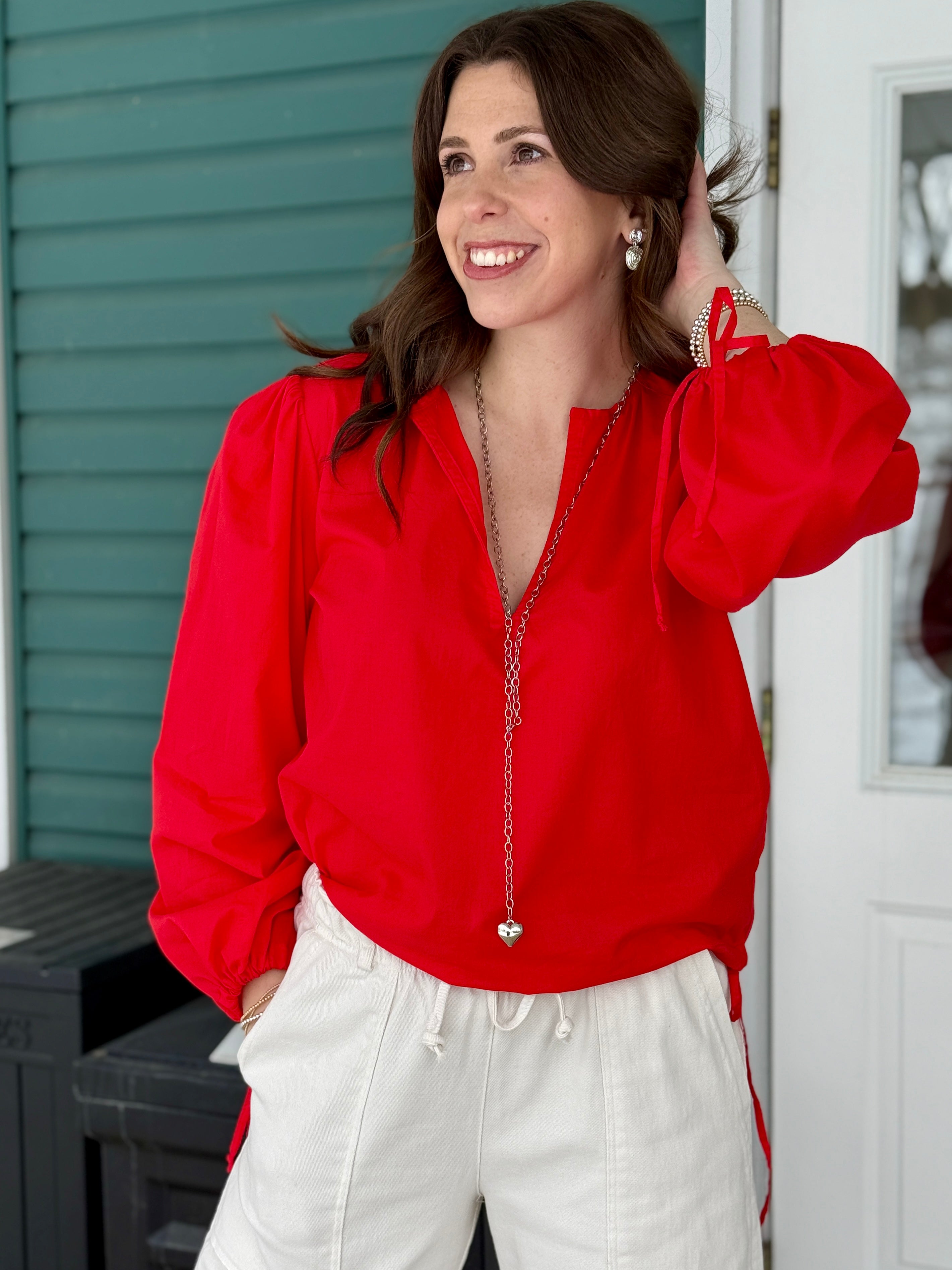 Colette is a true red, ultra-light, chic cotton poplin blouse with endless styling potential. This poet-style blouse features ties at the wrist and hem, letting you wear her loose and flowy or cinched and tailored depending on your mood. The split-V neckline keeps it feminine and flattering, while the airy 100 percent cotton makes it light and lovely for spring days that start crisp and end warm. Not to mention a pop of killer red... let colour bloom!