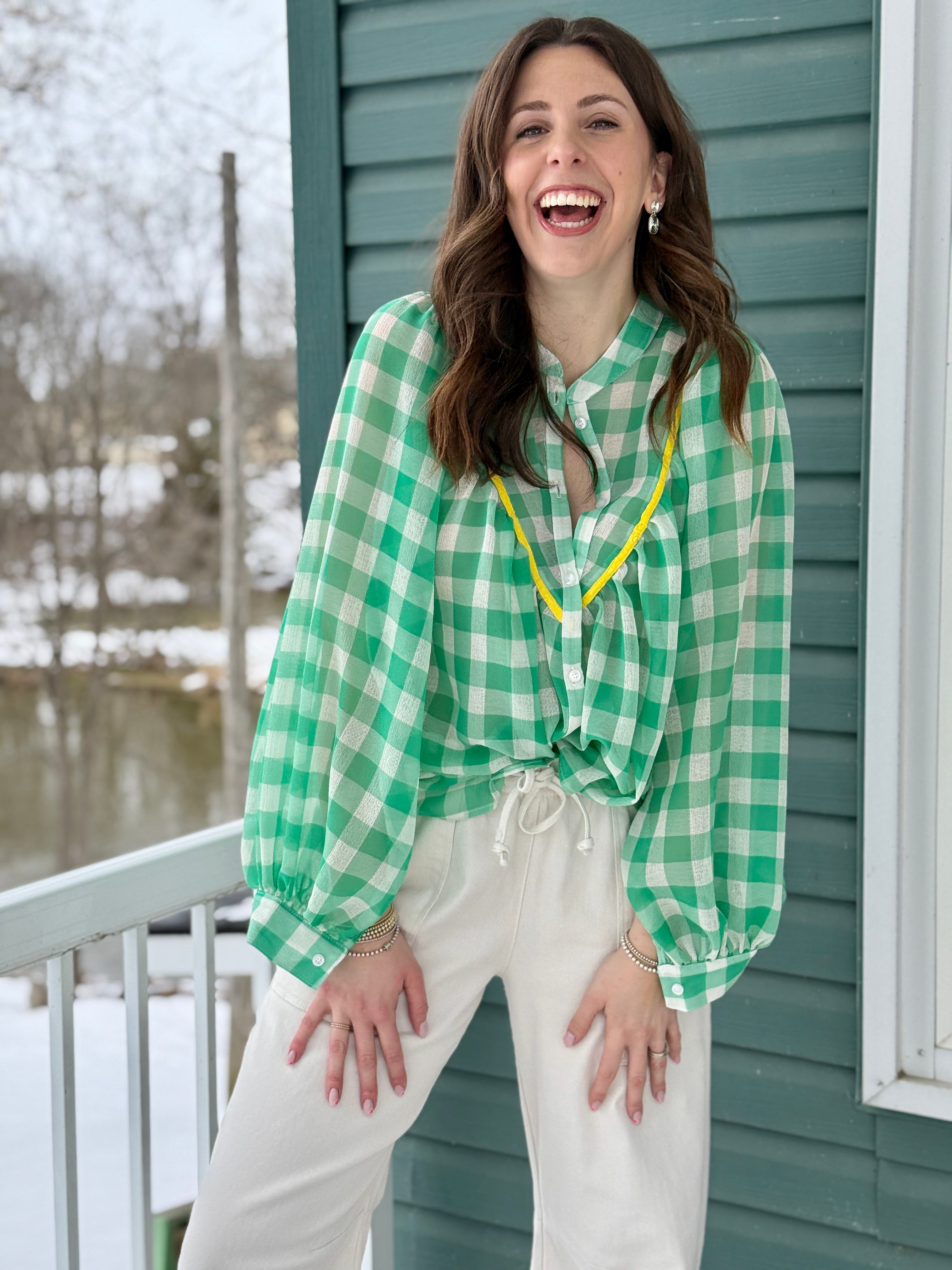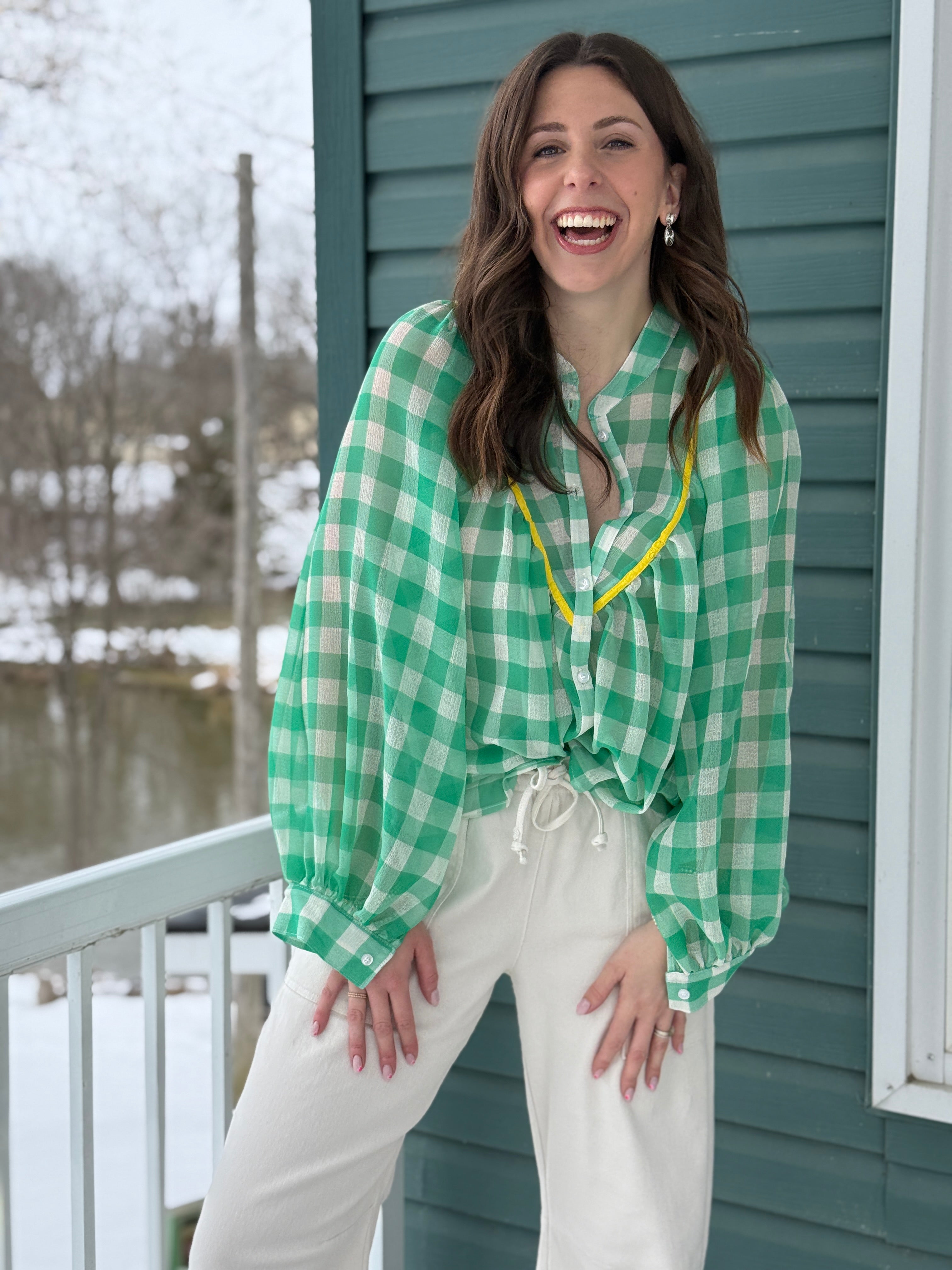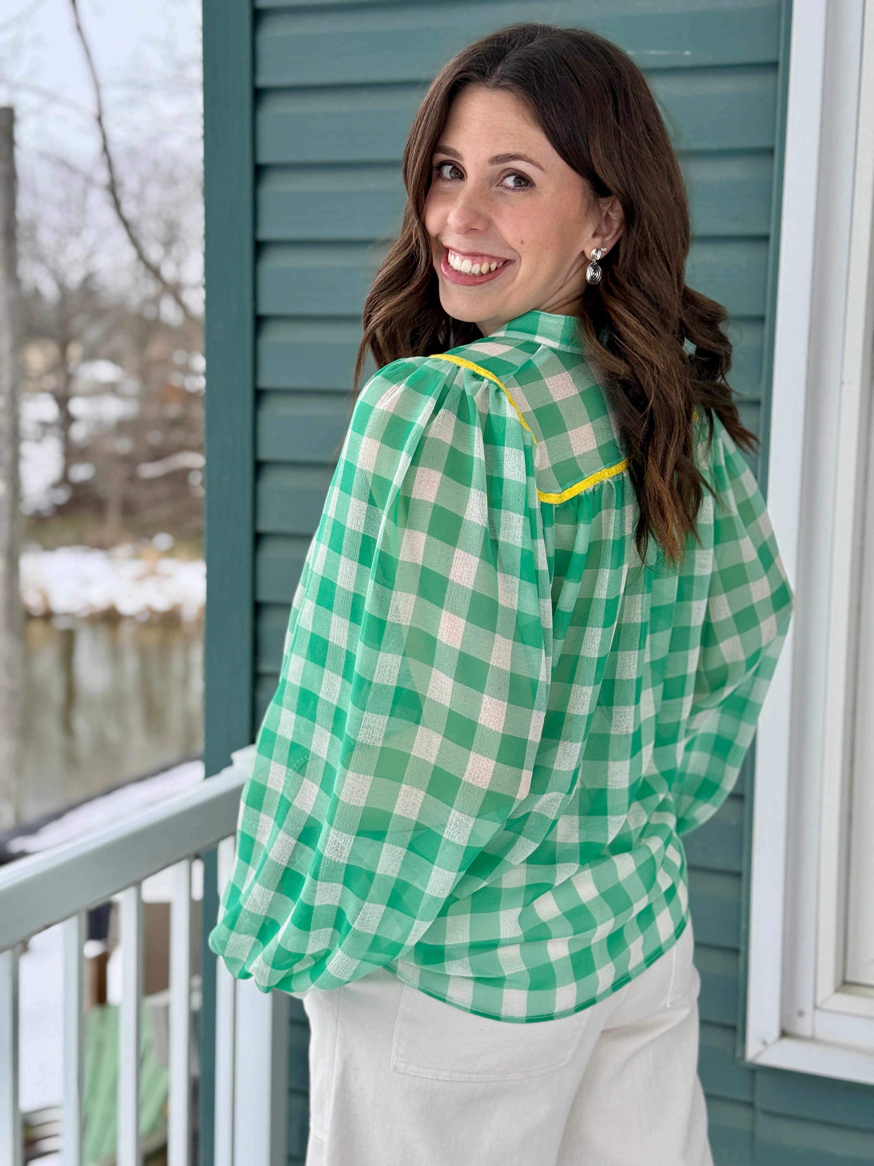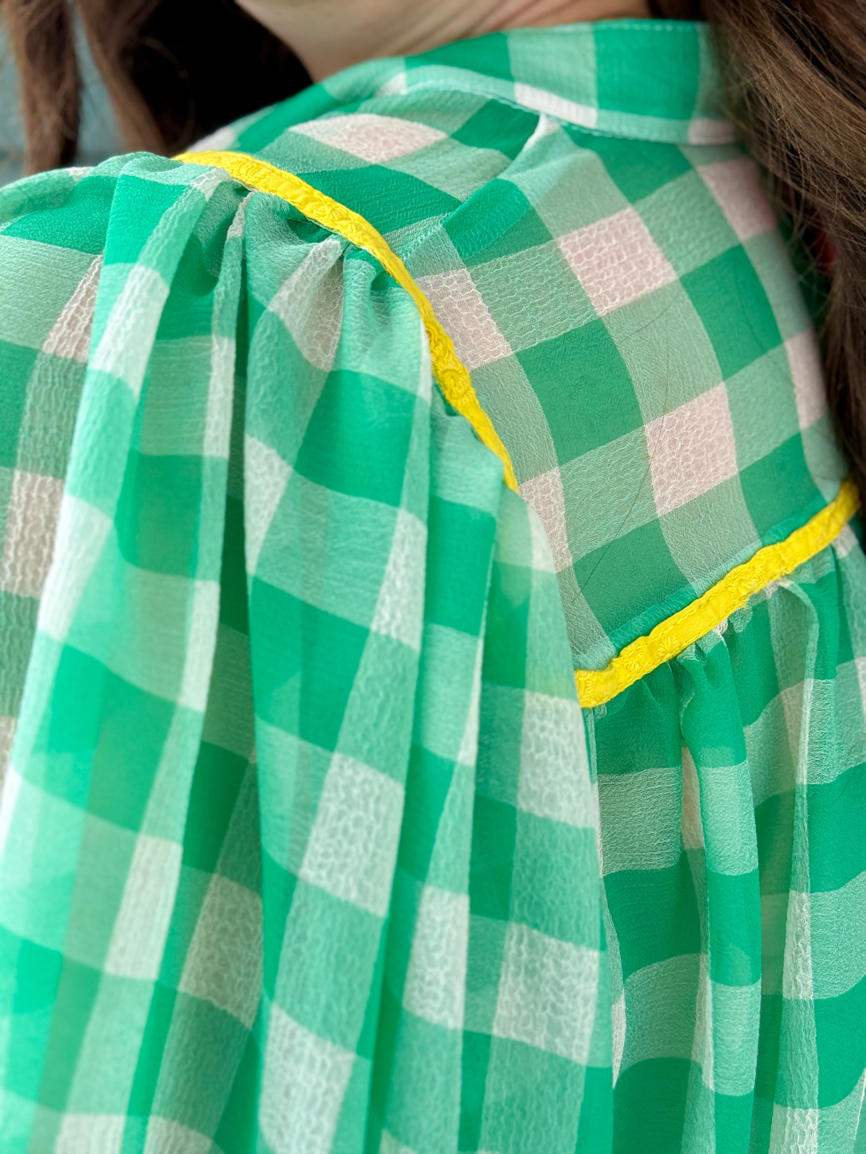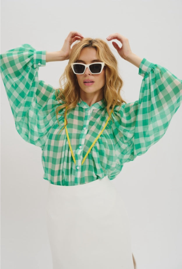 Cut from large-scale green and white gingham chiffon, Edith is the fresh-air moment your wardrobe’s been waiting for. A classic button-down silhouette gets a romantic twist with a V-yoke trimmed in sunny yellow bias from front to back. The sleeves are beautifully voluminous with a buttoned cuff, giving that polished-meets-playful balance we love. Light, floaty, and just structured enough, she pairs as easily with denim as she does with a tailored trouser. Picnic energy… but make it chic. Worn over nude undergarments, she's perfectly opaque.