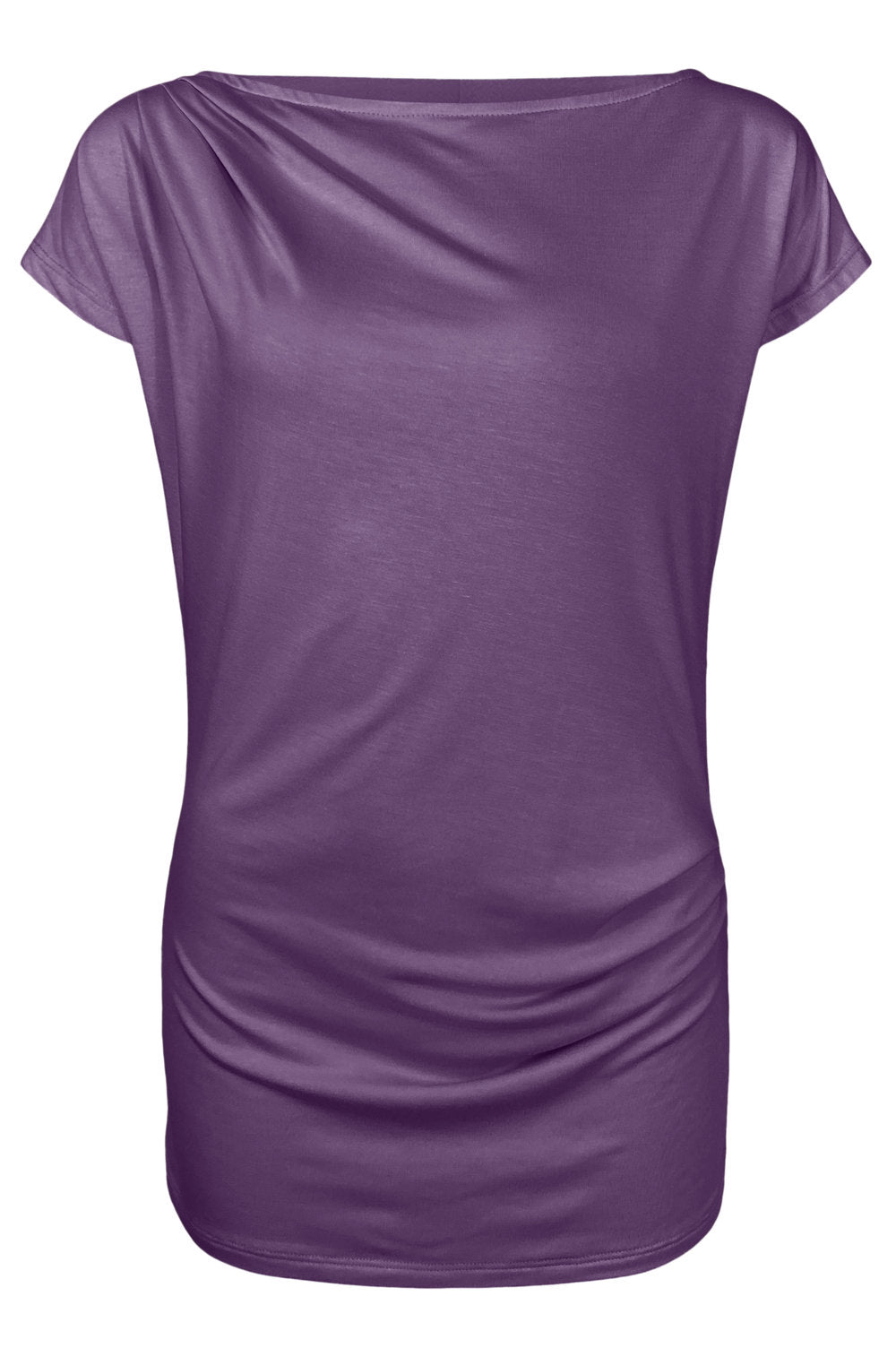 - Full-length short-sleeved top, pleated at right shoulder and left hip, front and back.