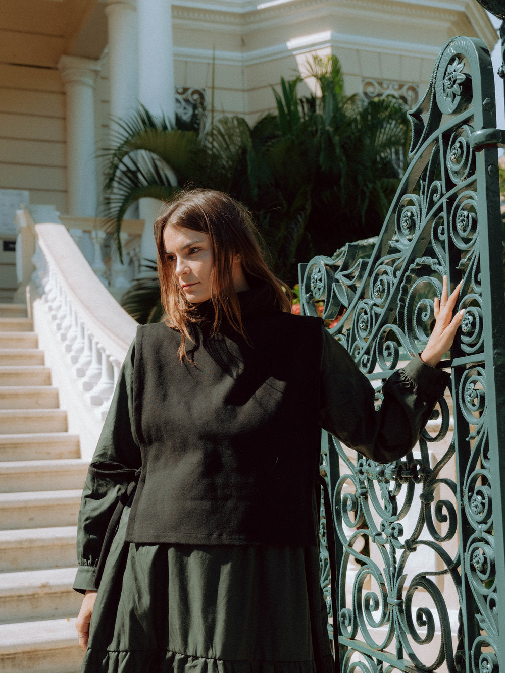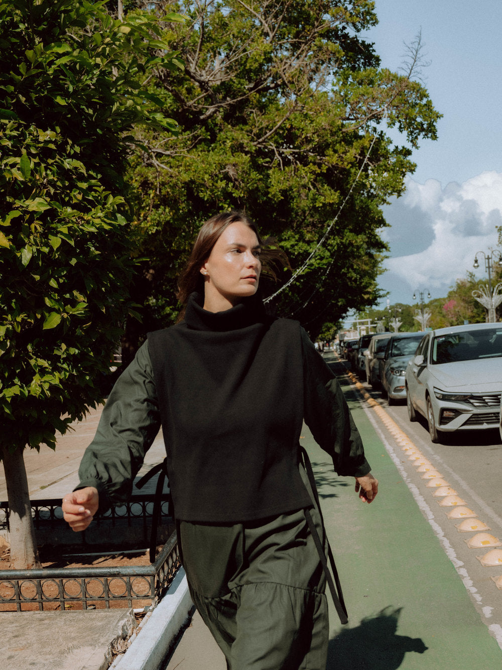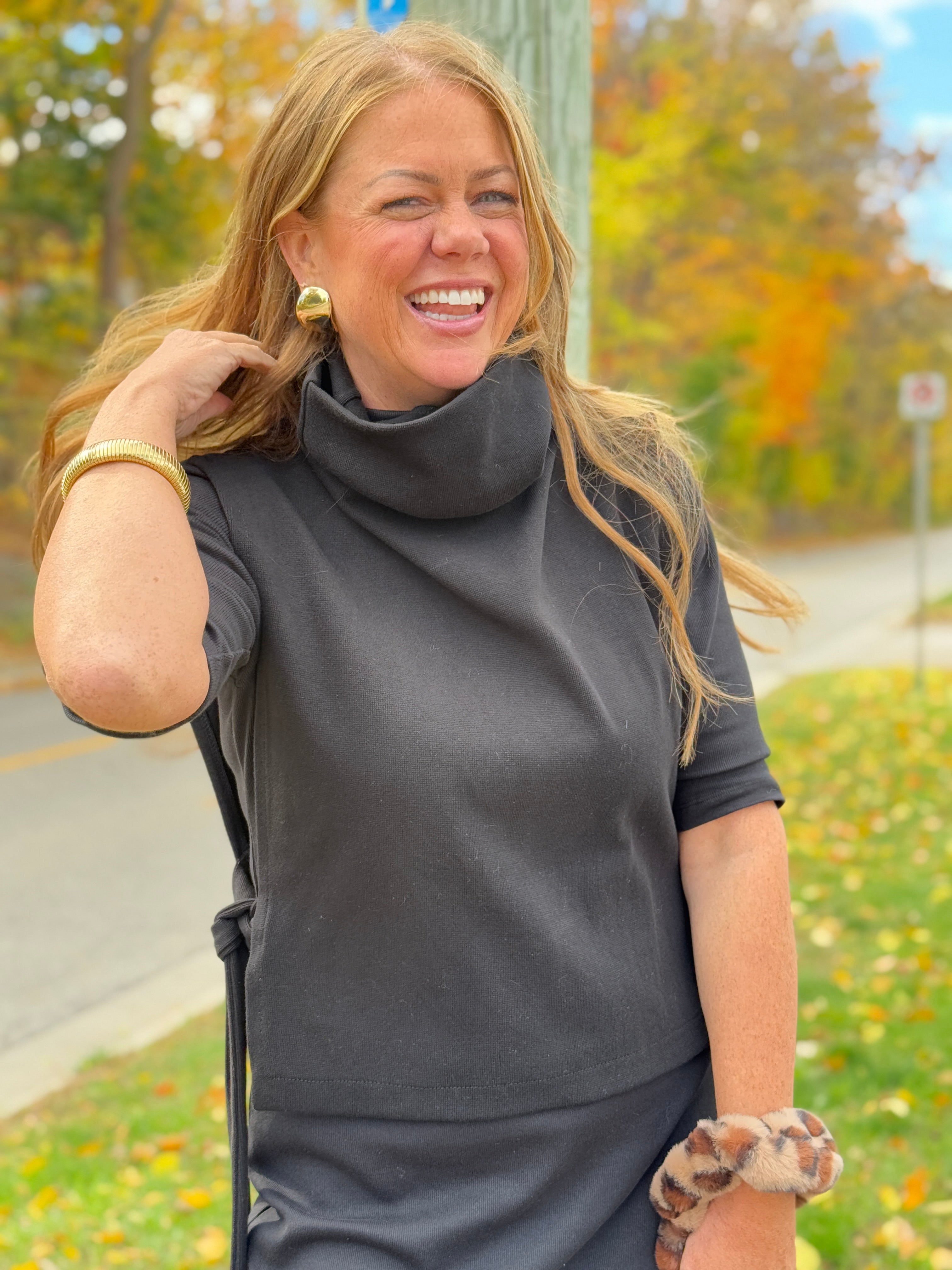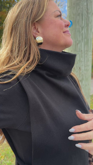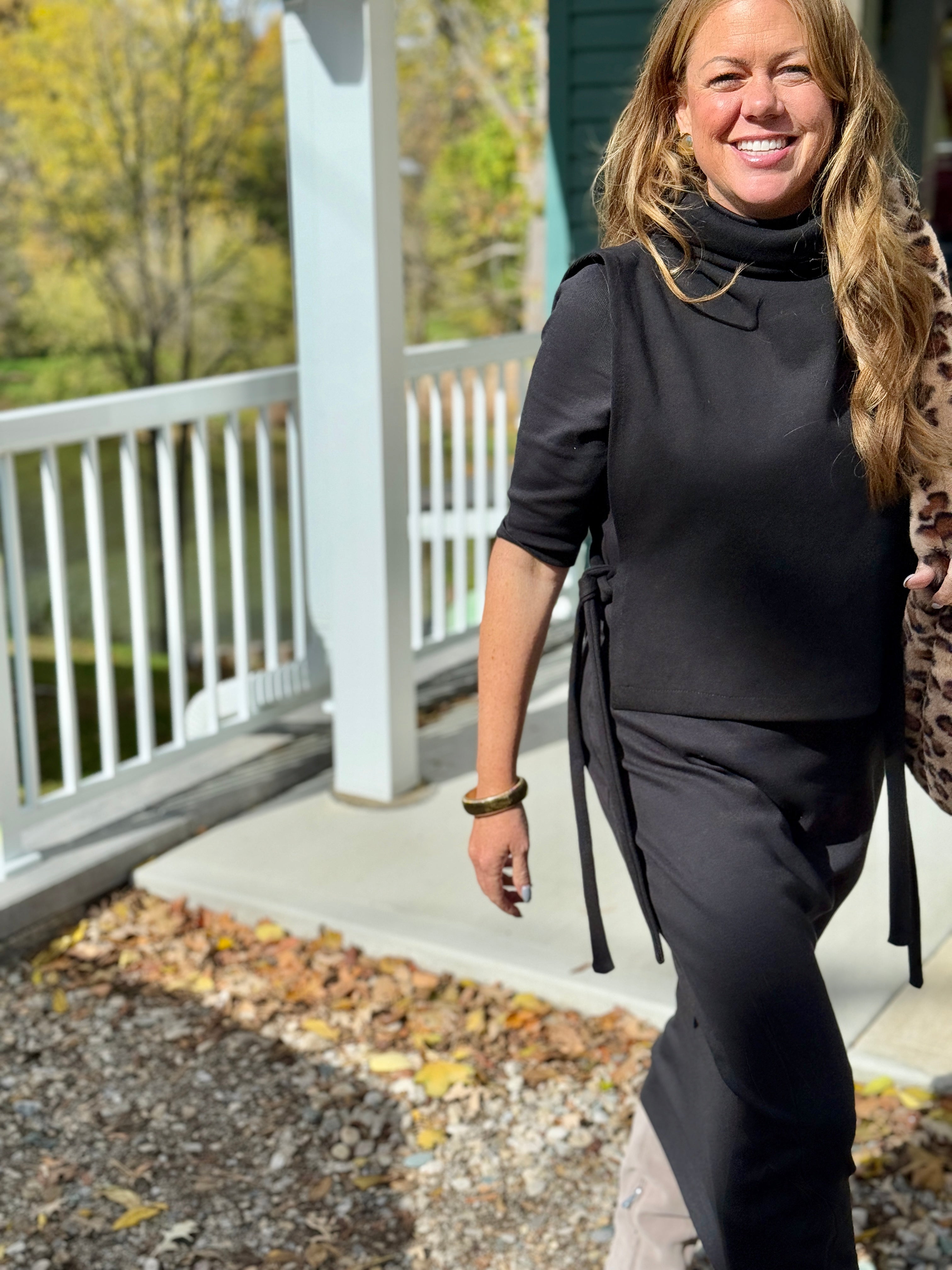 This is a fun fashion piece! Intended to layer over your favourite top or dress, much like a cardigan, this small-batch style creates a fashion-forward look and adds cozy confidence. Featuring a face-framing mockneck and side-ties, it's easy to wear and can be styled in number of ways, tied in bows, worn long or tied in back or front too. Cool, huh? Very Montreal.