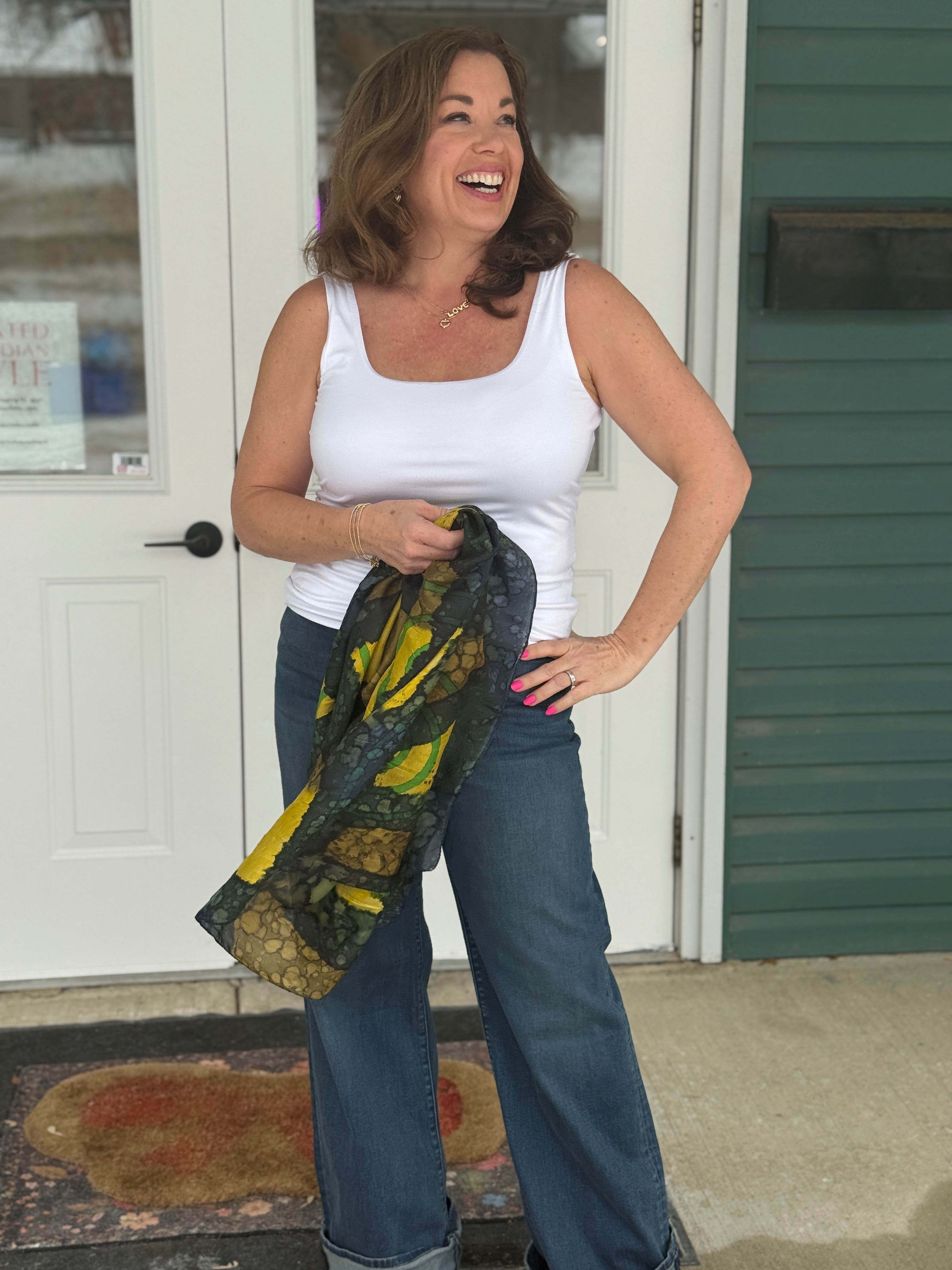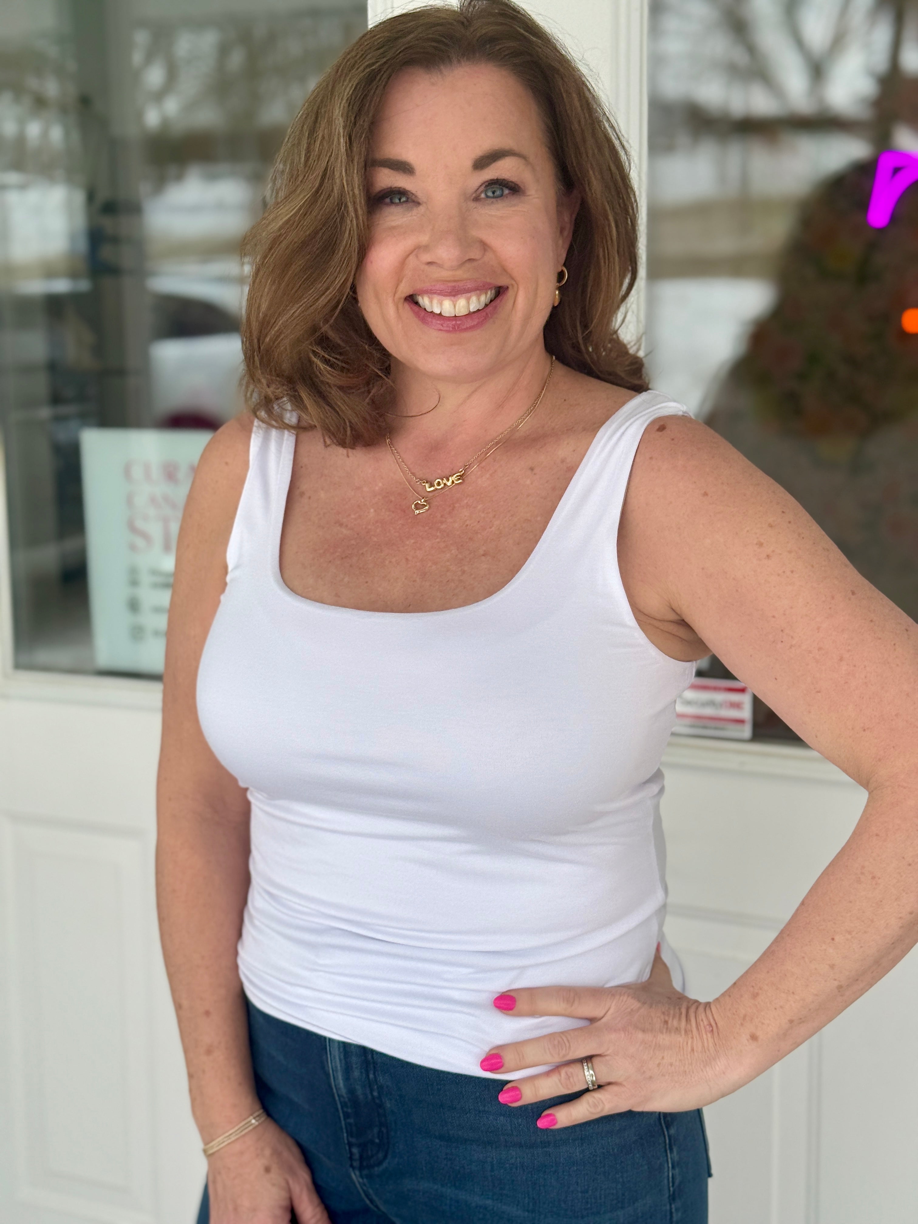• Double lined tank with bra-friendly straps, flattering neckline, long enough to tuck or wear out