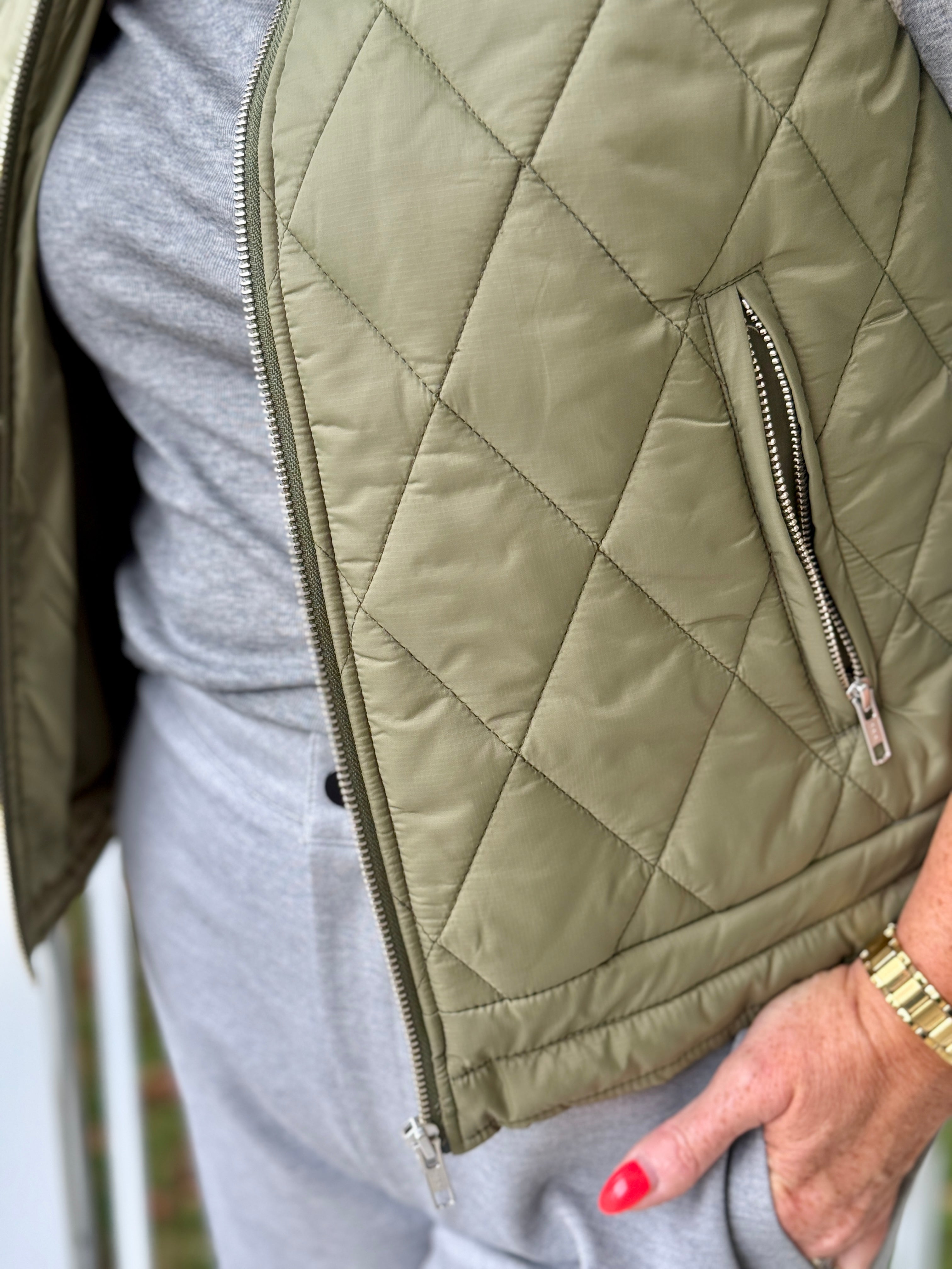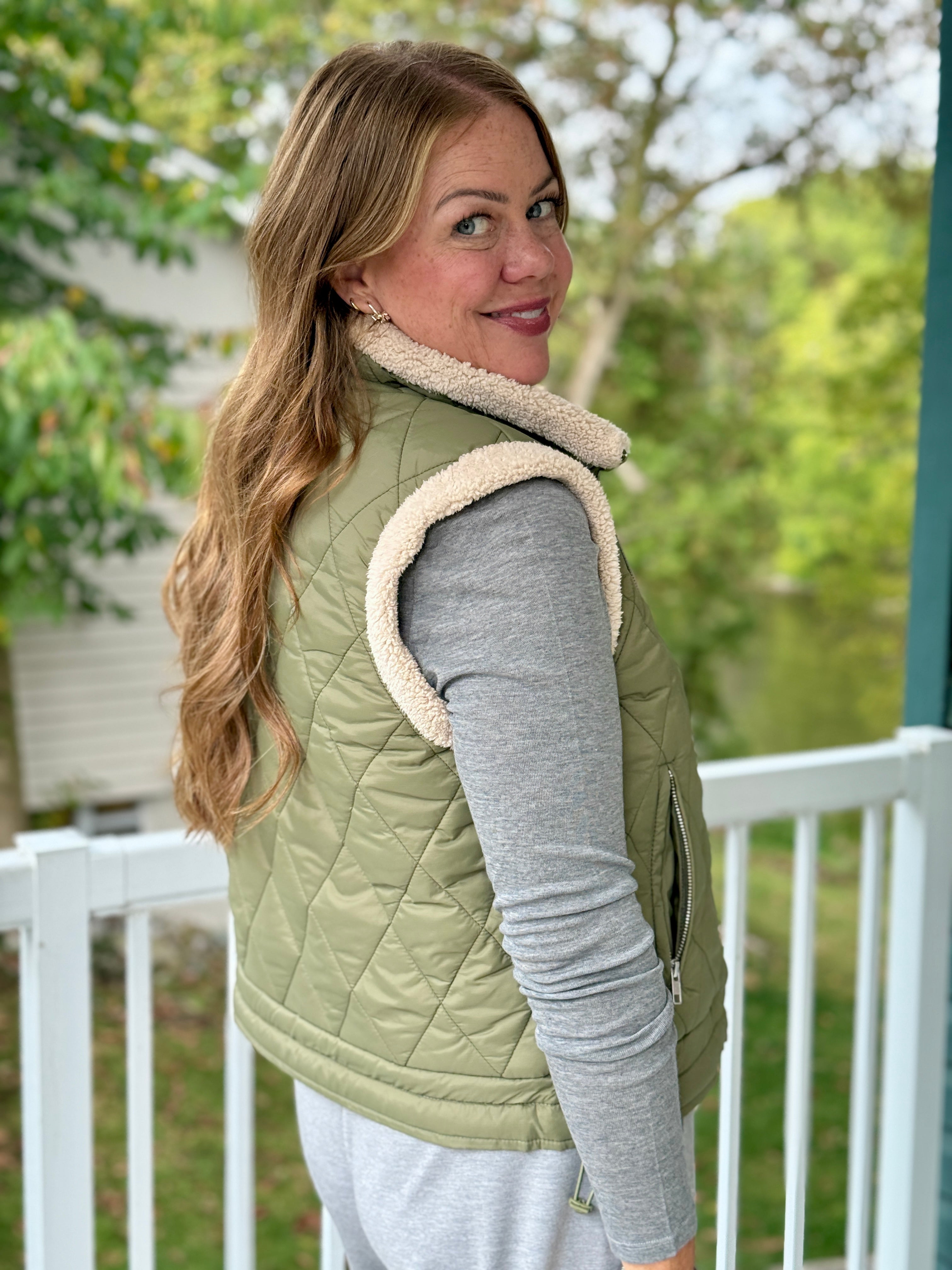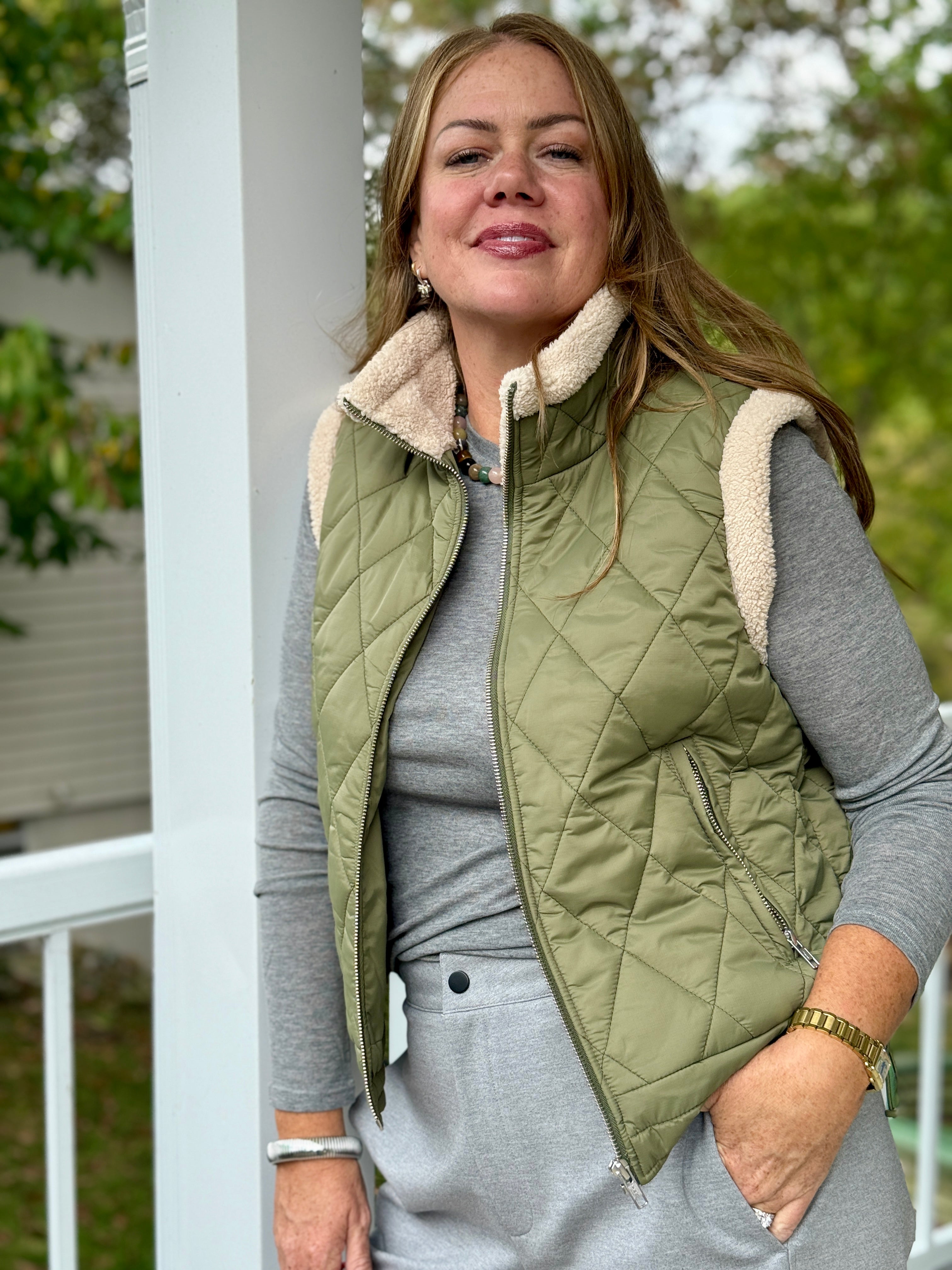 • Sherpa lined front zip quilted vest with zip pockets, waist length
