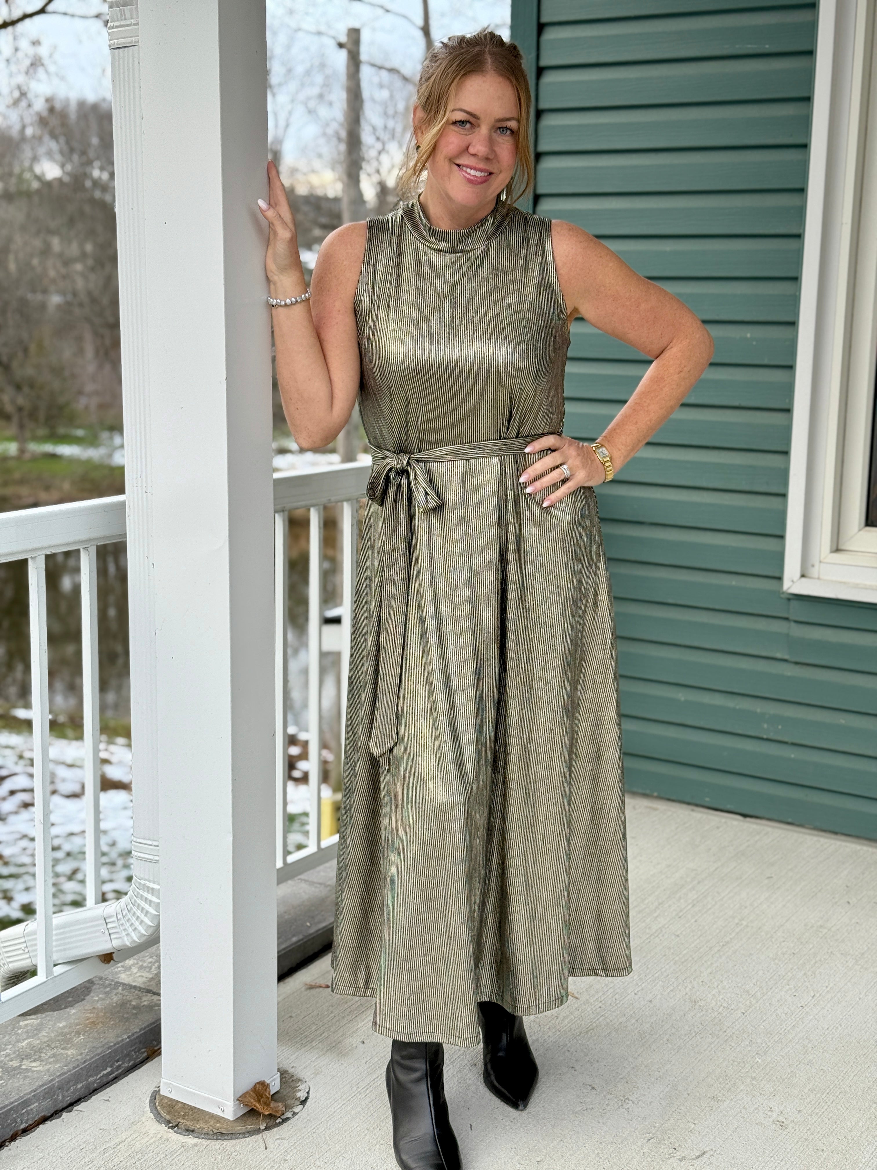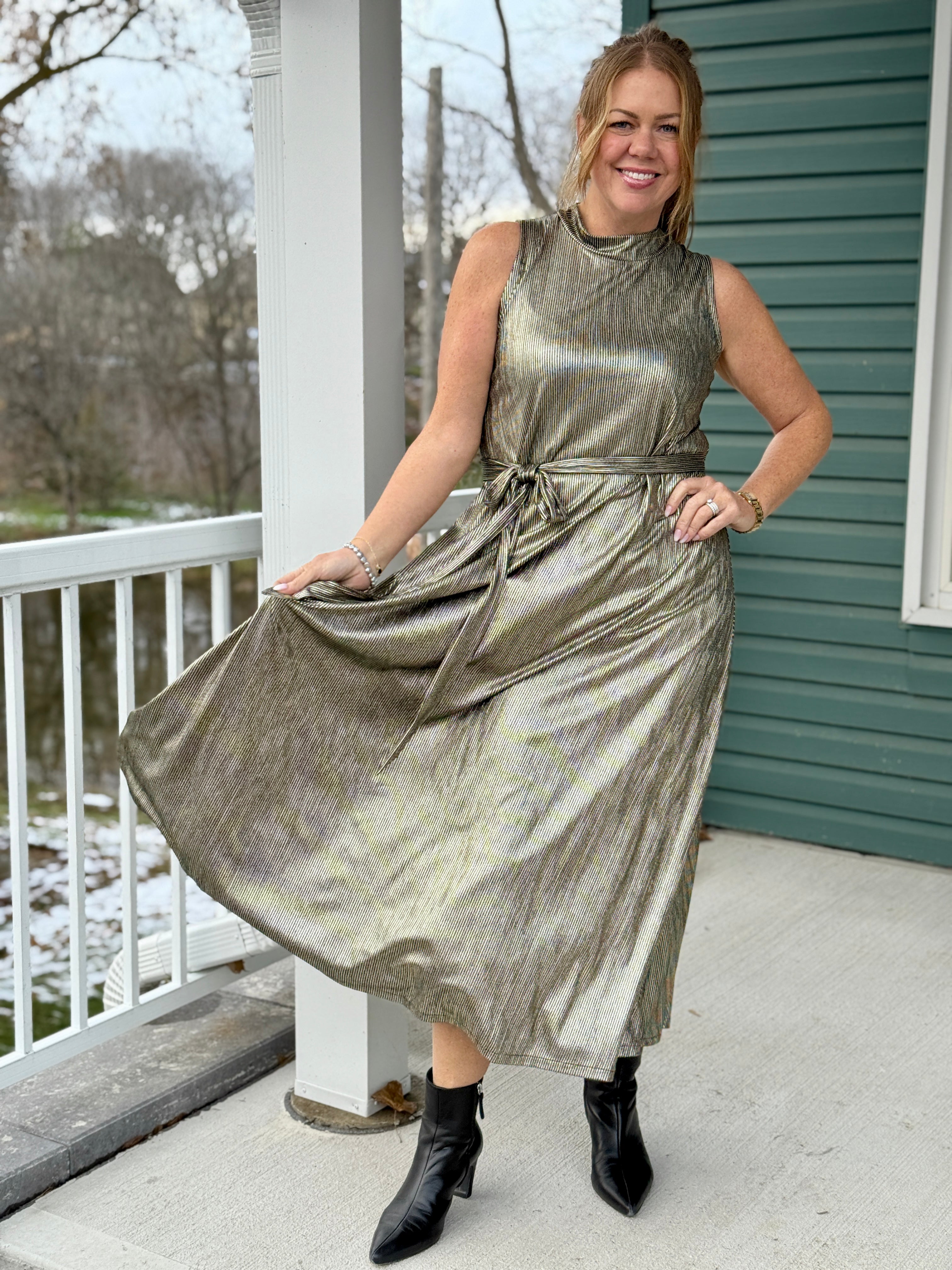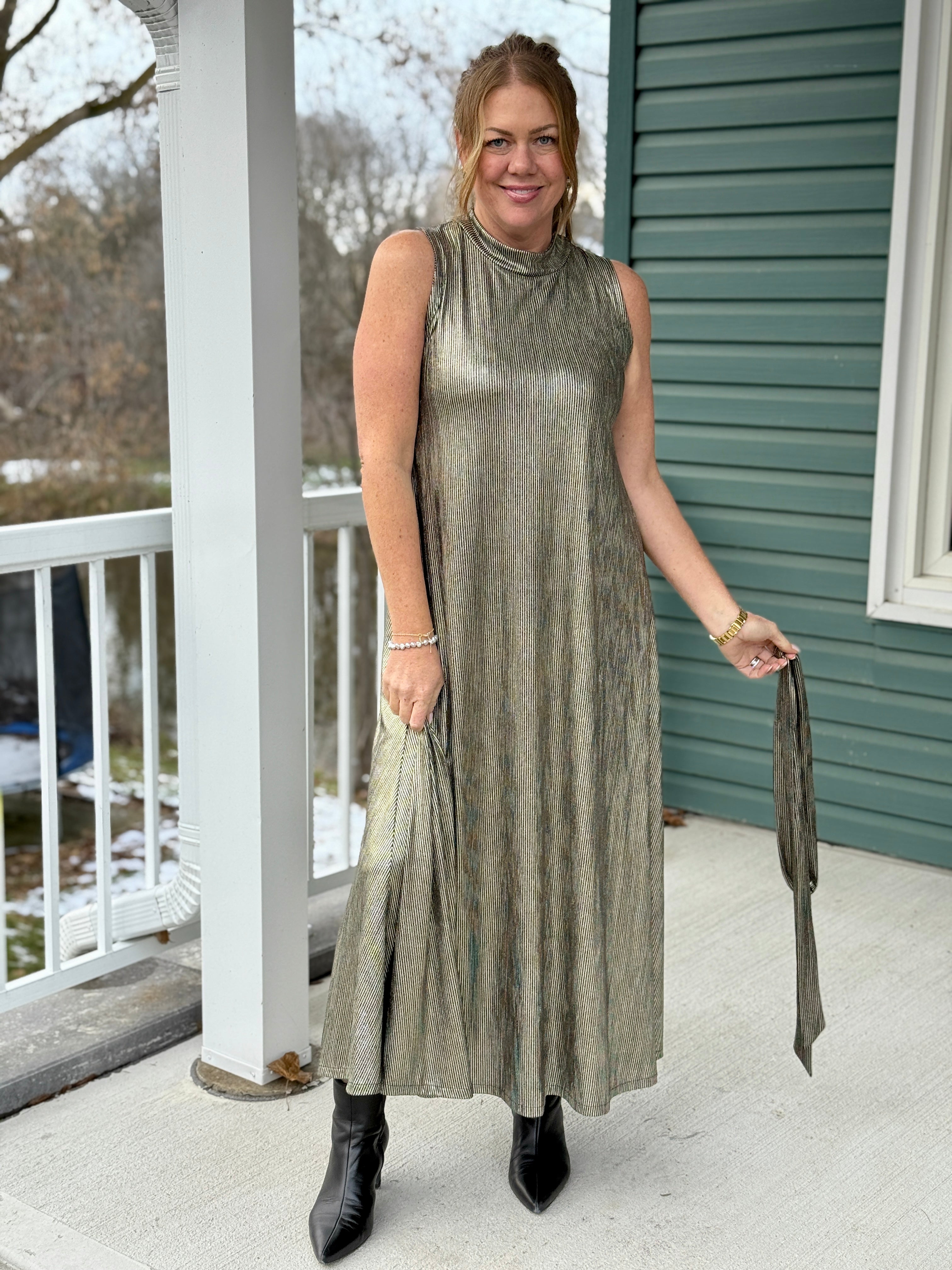 • Metallic gold, sleeveless, swingy A-line dress with mock collar, removable belt in metallic black and gold striped fabric