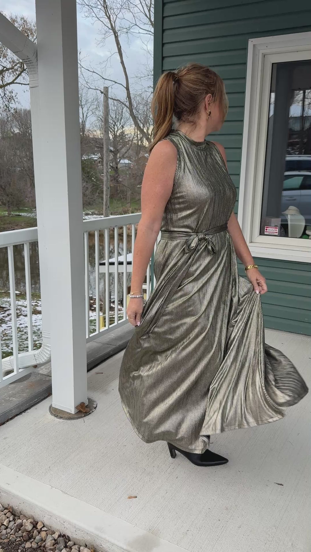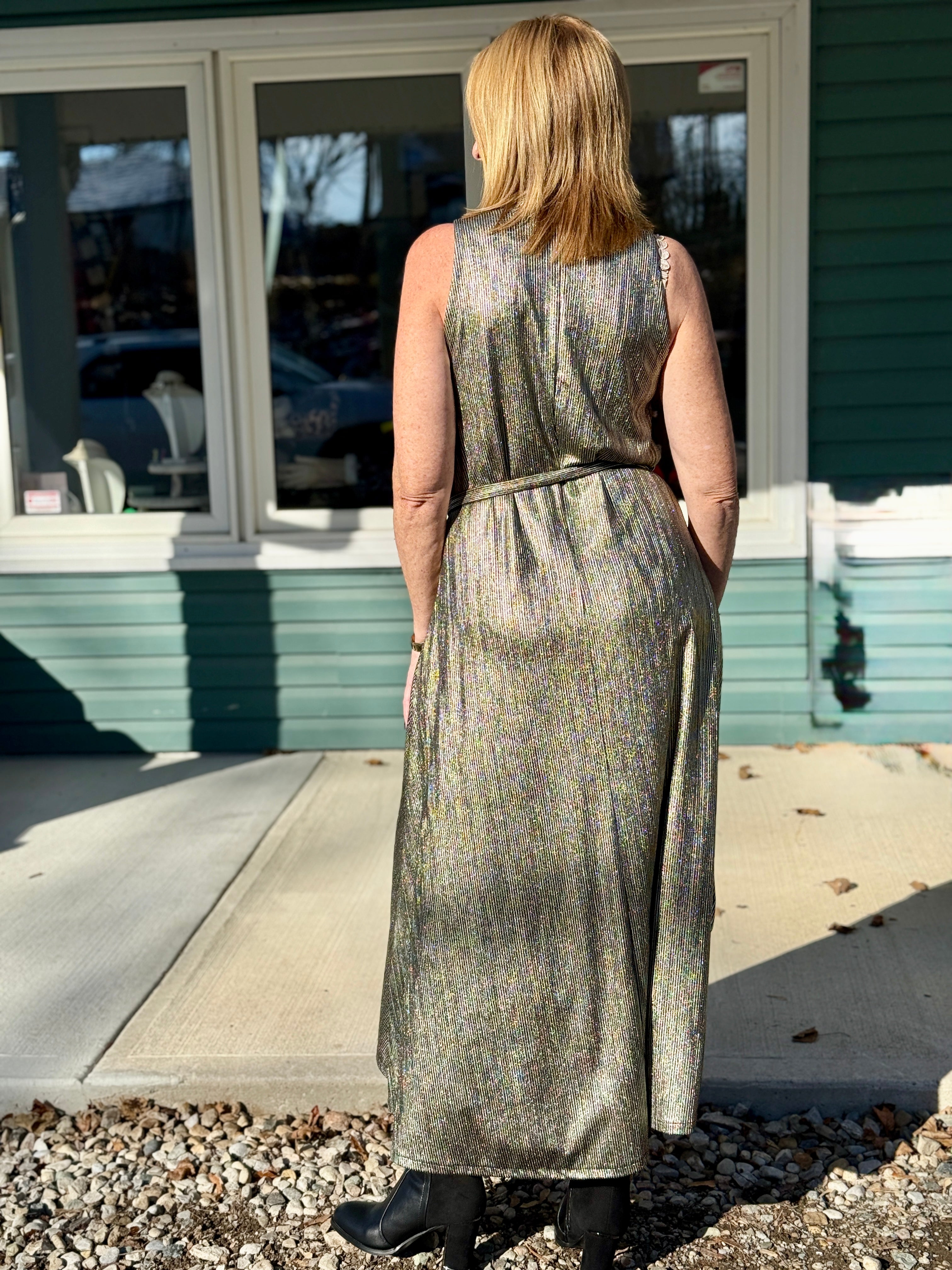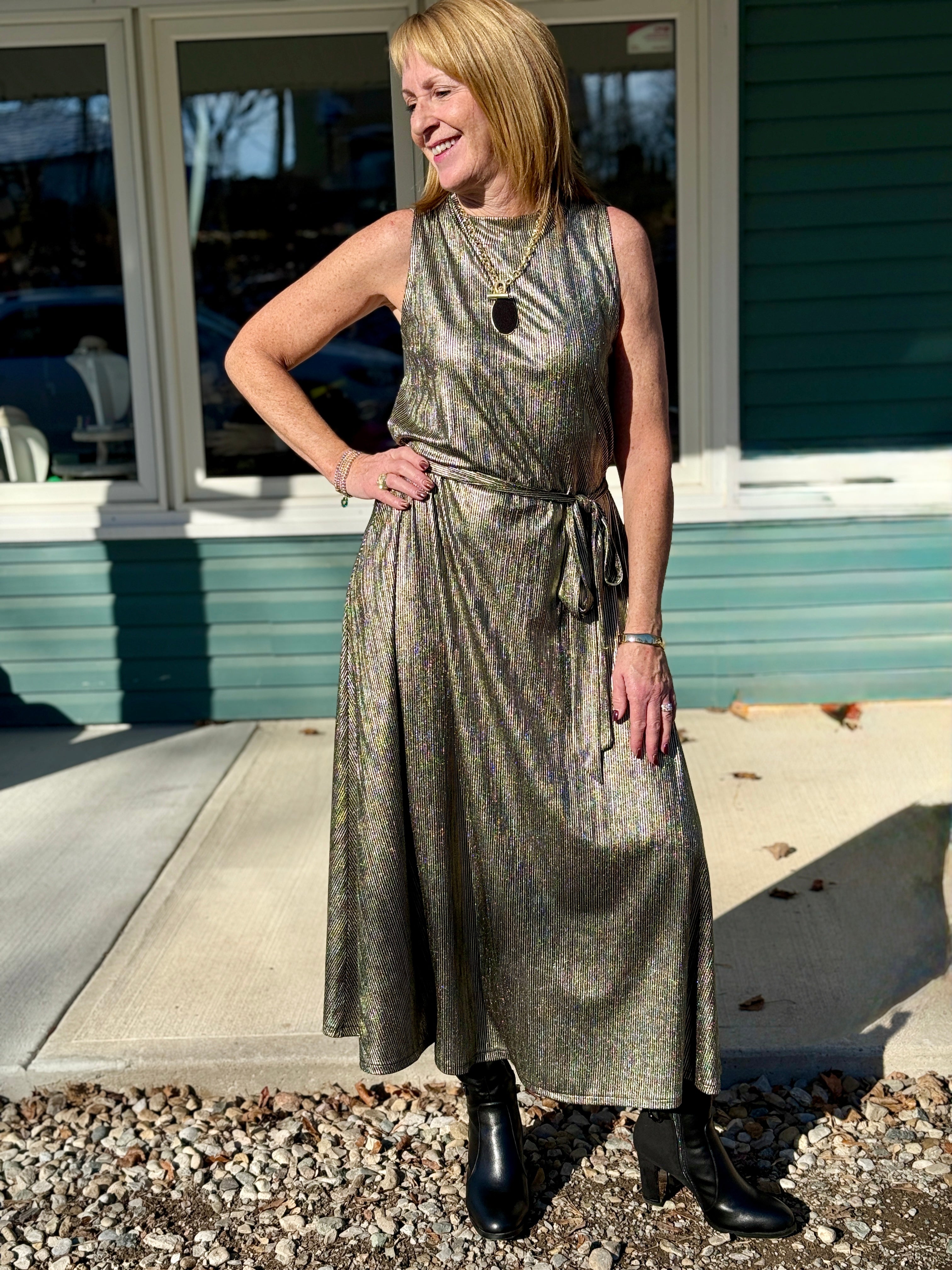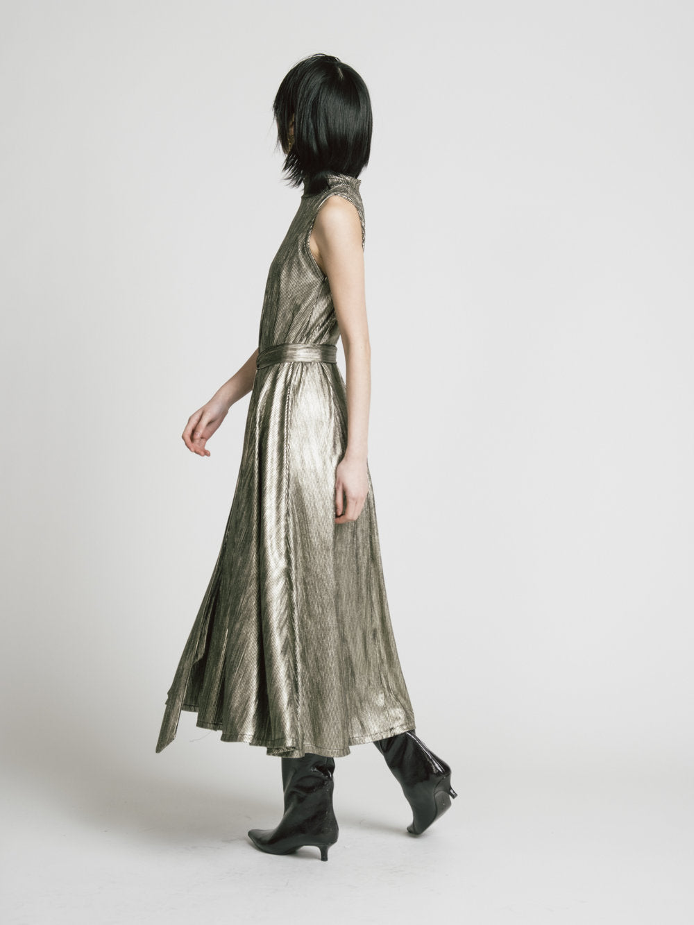 • Metallic gold, sleeveless, swingy A-line dress with mock collar, removable belt in metallic black and gold striped fabric