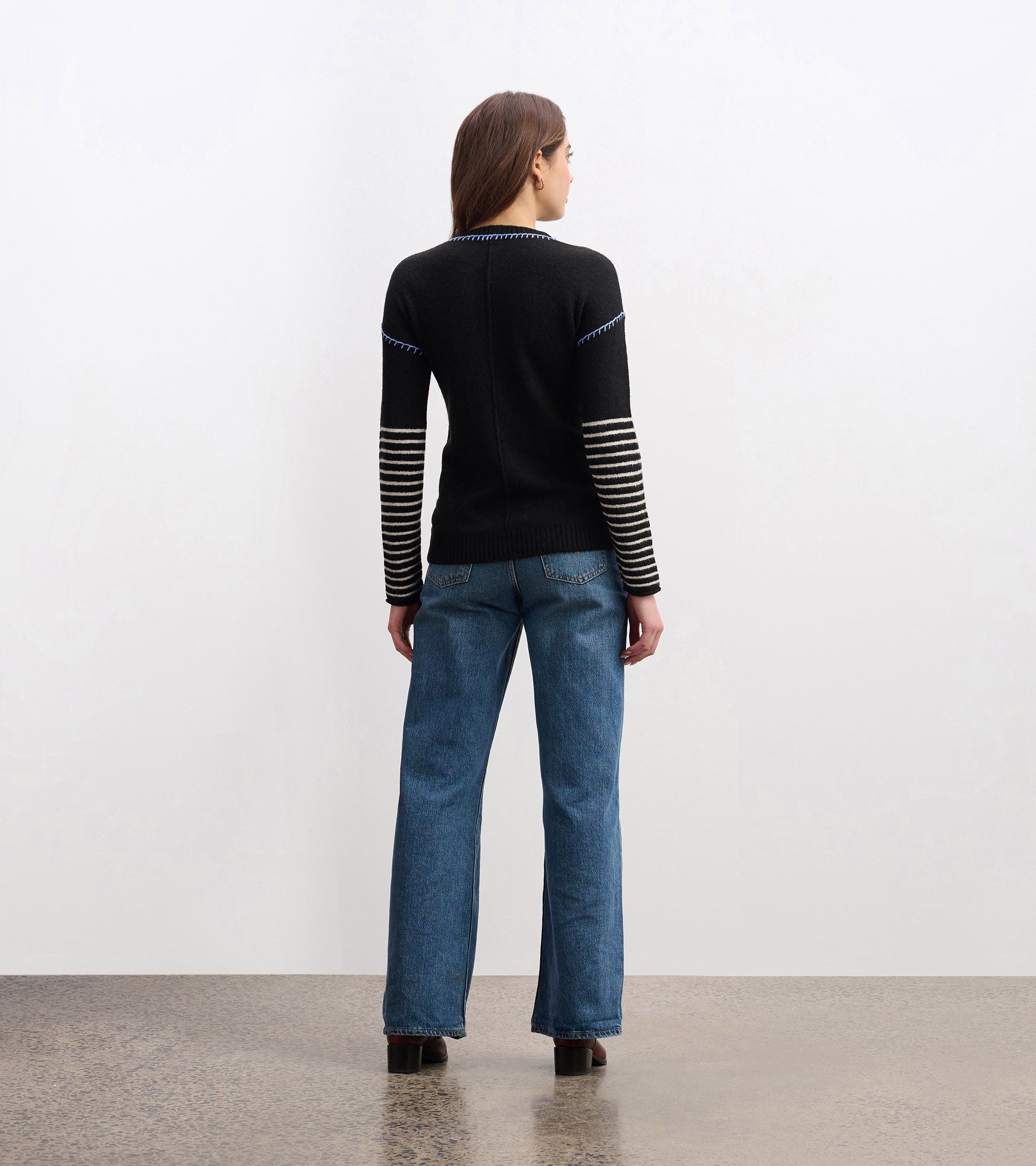 • Pullover, ultra-soft crewneck sweater with blue blanket stitch detail and elongated black and white striped cuffs