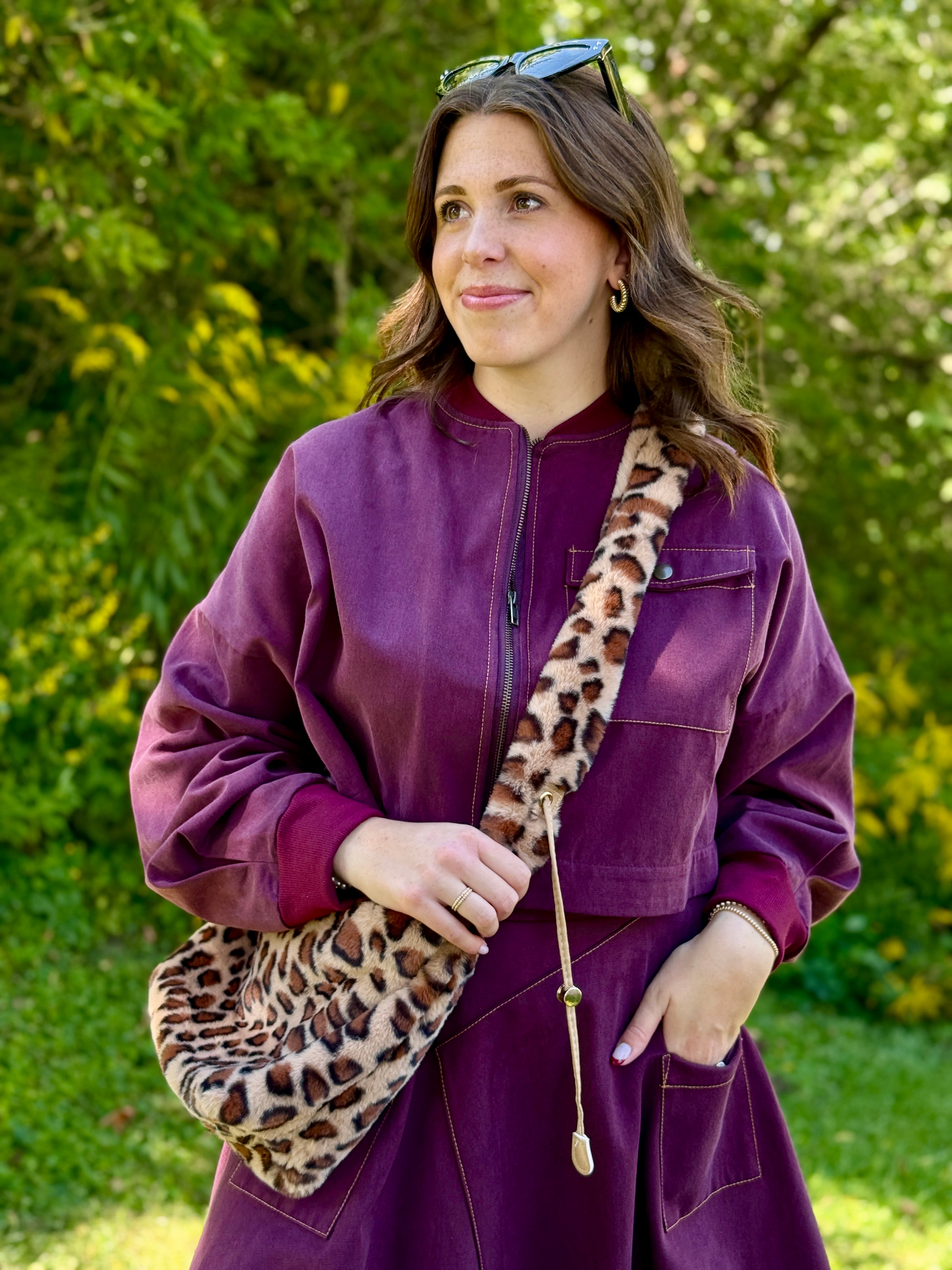Now this is one cool bag by Lyla & Luxe. Yes, it's leopard print and teddy bear soft. I  mean, if you get caught without a pillow, this is the solution!  But when you realize this cool bag has a cinchable handle that can be worn long or short, you will really freak out! siimply pull the leather cord to cinch the handle. Not to mention, a little leopard is always a good idea.
