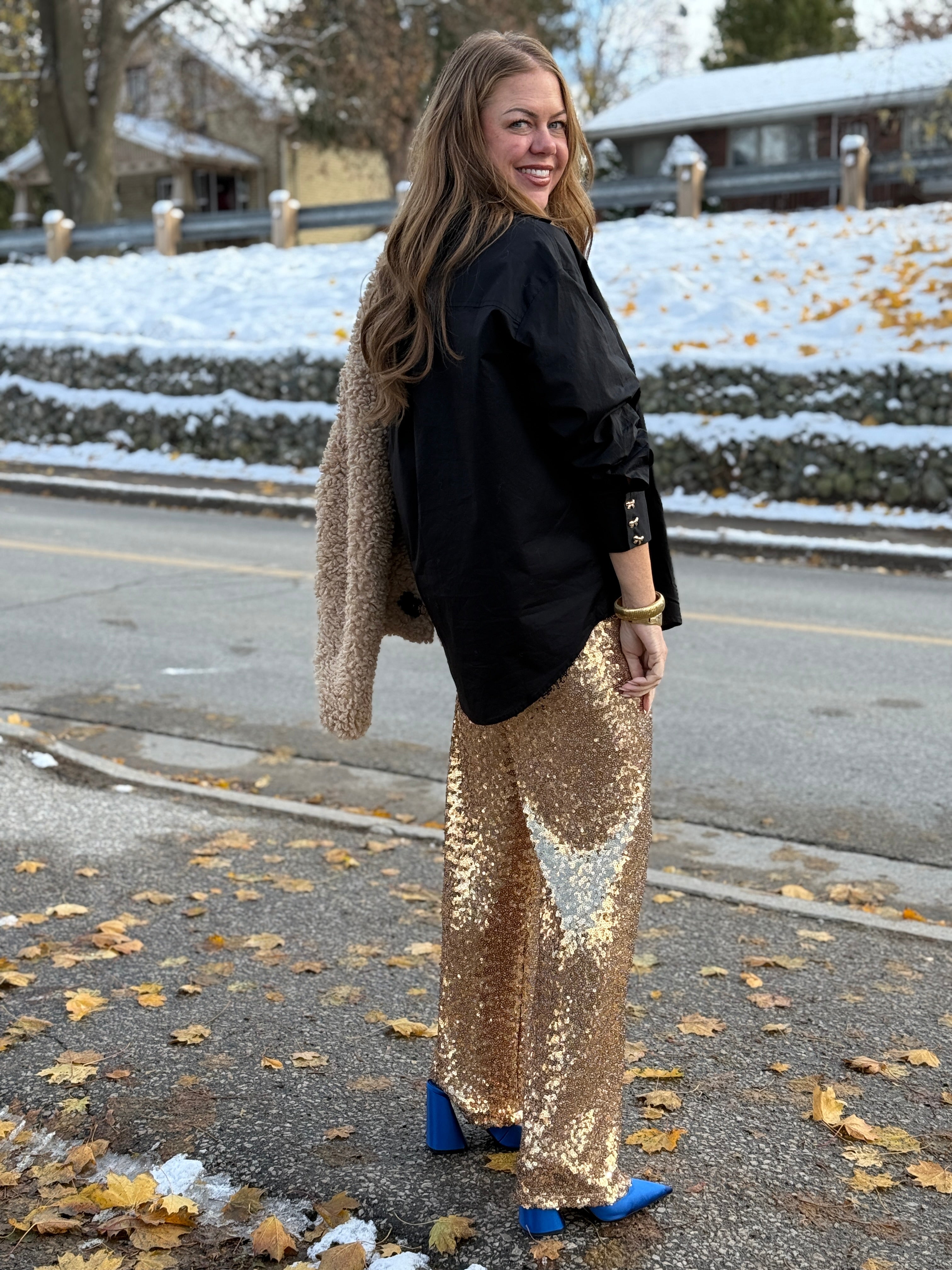 Break out the gold sequin pants for the love of the Holiday season and all things sparkly. This pull-on, fully sequinned pant by Montreal's Astrid is a stand-out in any room, that's for sure! Flowy, with a wide-leg, they simply scream joy. The waist is wide elastic and they have all-over stretch. They have a stretchy lining to the knee (like a built-in bike short). Pair with a longer blouse (like Brunette the Label's bow blouse as soon on Susan) or a knit for instantly fun and funky Holiday Spirit. A little naughty, but mostly nice.