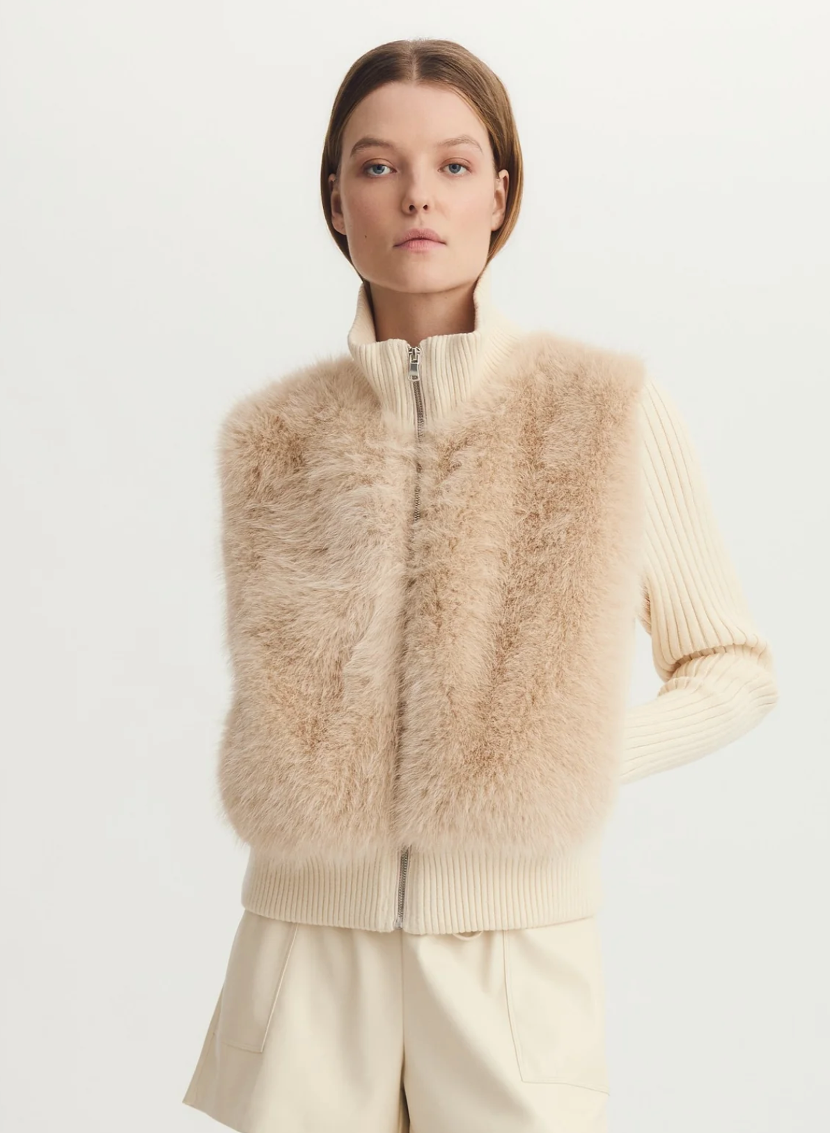 Meet the Helios Sweater by Melissa Nepton — the chic winter layer that walks into the room and immediately orders a champagne. The front is faux fur, giving the look that you're wearing a fur vest over a sweater without the bulk. A sleek zipper closure and mock neck add that sporty-sophisticated vibe. Ribbed sleeves keep the silhouette streamlined so all the attention goes to that delicious texture. Slip it on with denim for a casual coffee run that still feels très polished, or pair it with luxe trousers when you want your sweater to do the talking.