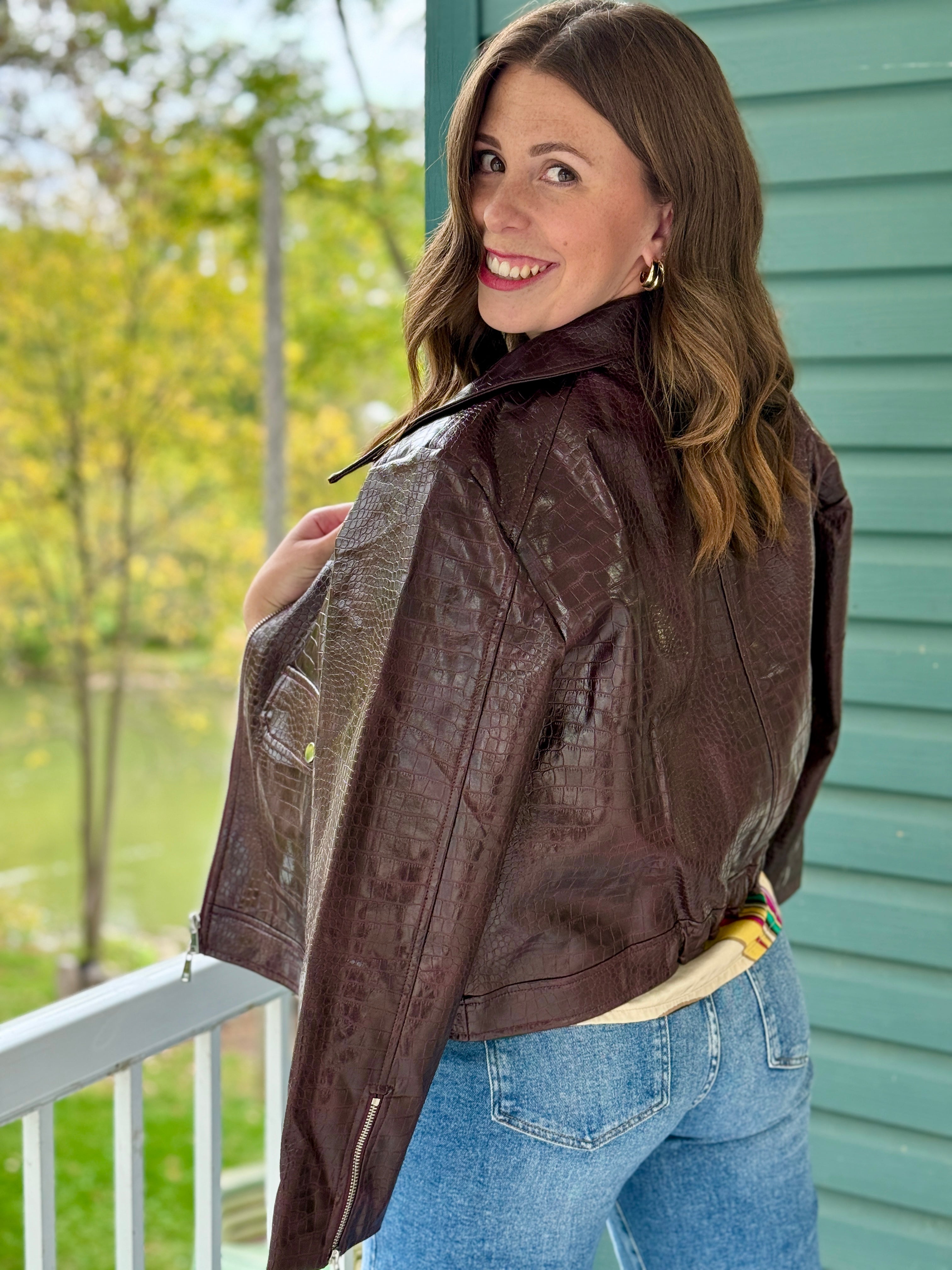 - Hip-length burgundy faux alligator bomber jacket with silver hardware