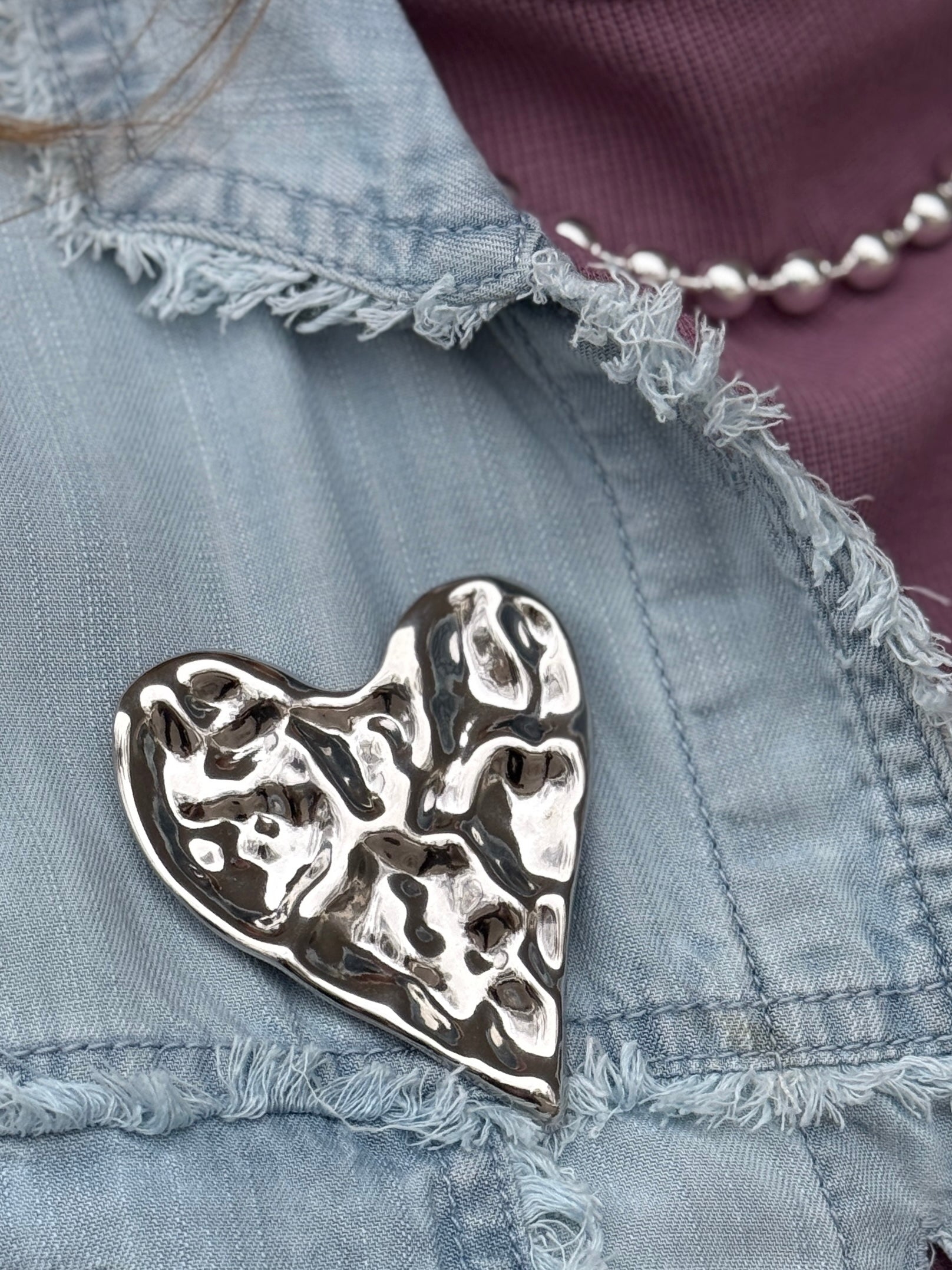 The accessory of 2026 is indeed- THE BROOCH! And this fun 7cm x 6cm hammered heart is the perfect addition to your 2026 looks worn on lapels, collars, cuffs and bags alike.