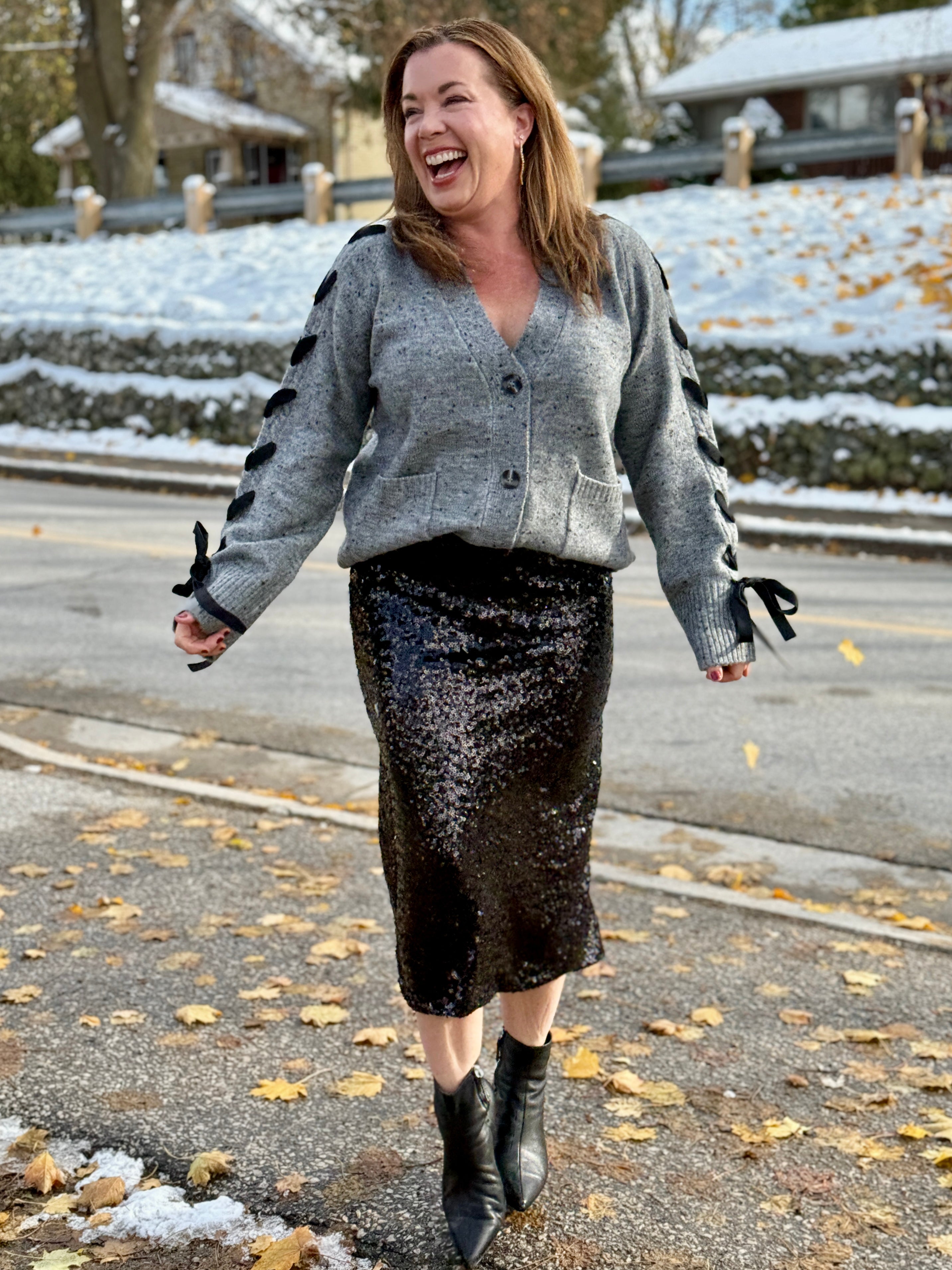 Take a Grandpa cardigan, but add satin ribbons like Grandma would - and the Shyla is born. Perfect paired back to sequins or velvet, it's also perfect with jeans- and our favourite Taylor Danielle vibe of a little bit edge and a little bit of feminine charm, all in one. This is one cool cardigan.