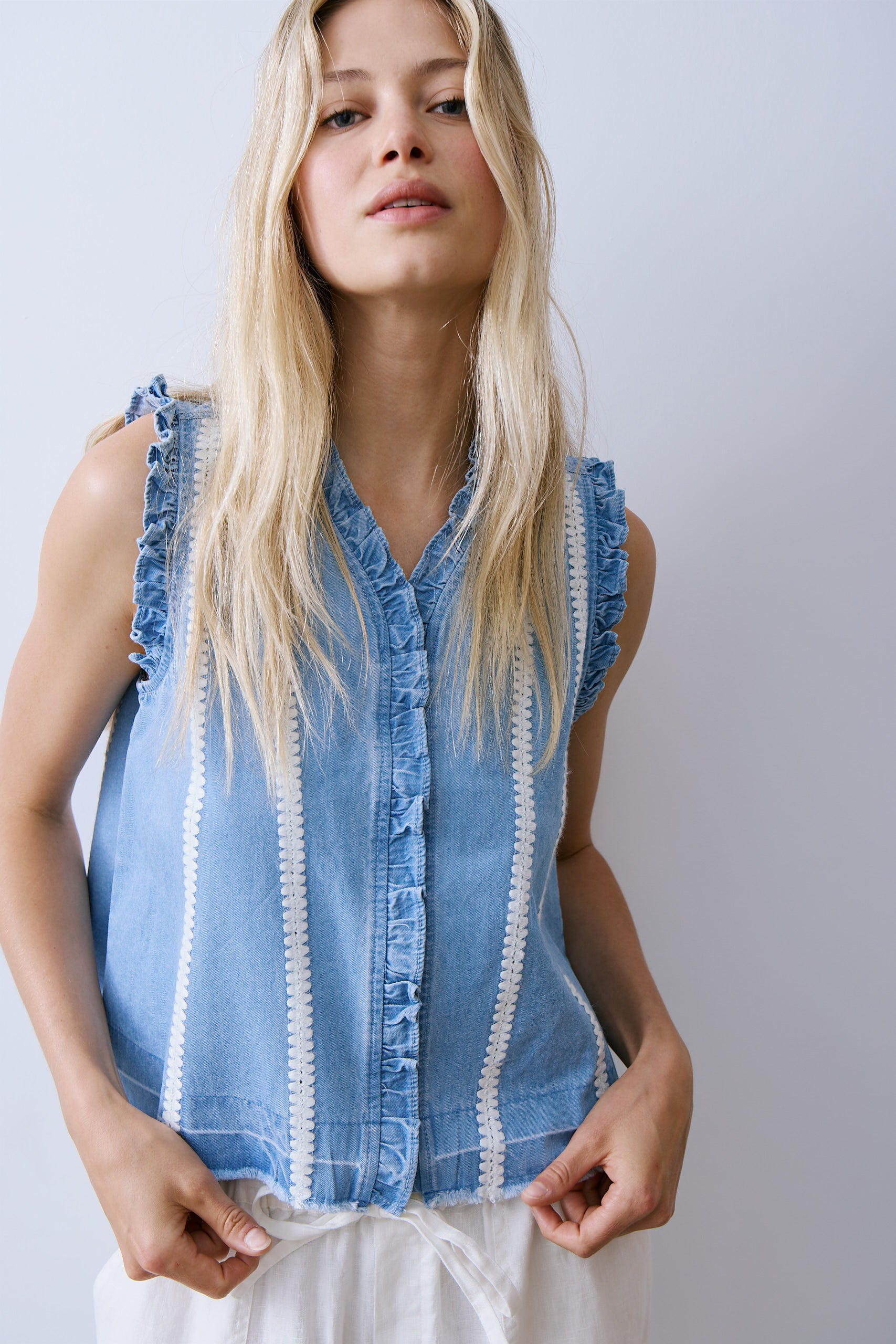 - Sleeveless denim button-front shirt with raw edges, ruffle collar and placket details and white rick rack trim, frayed hem.